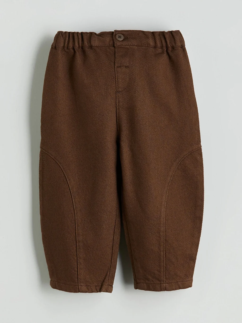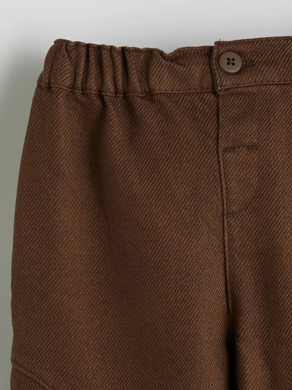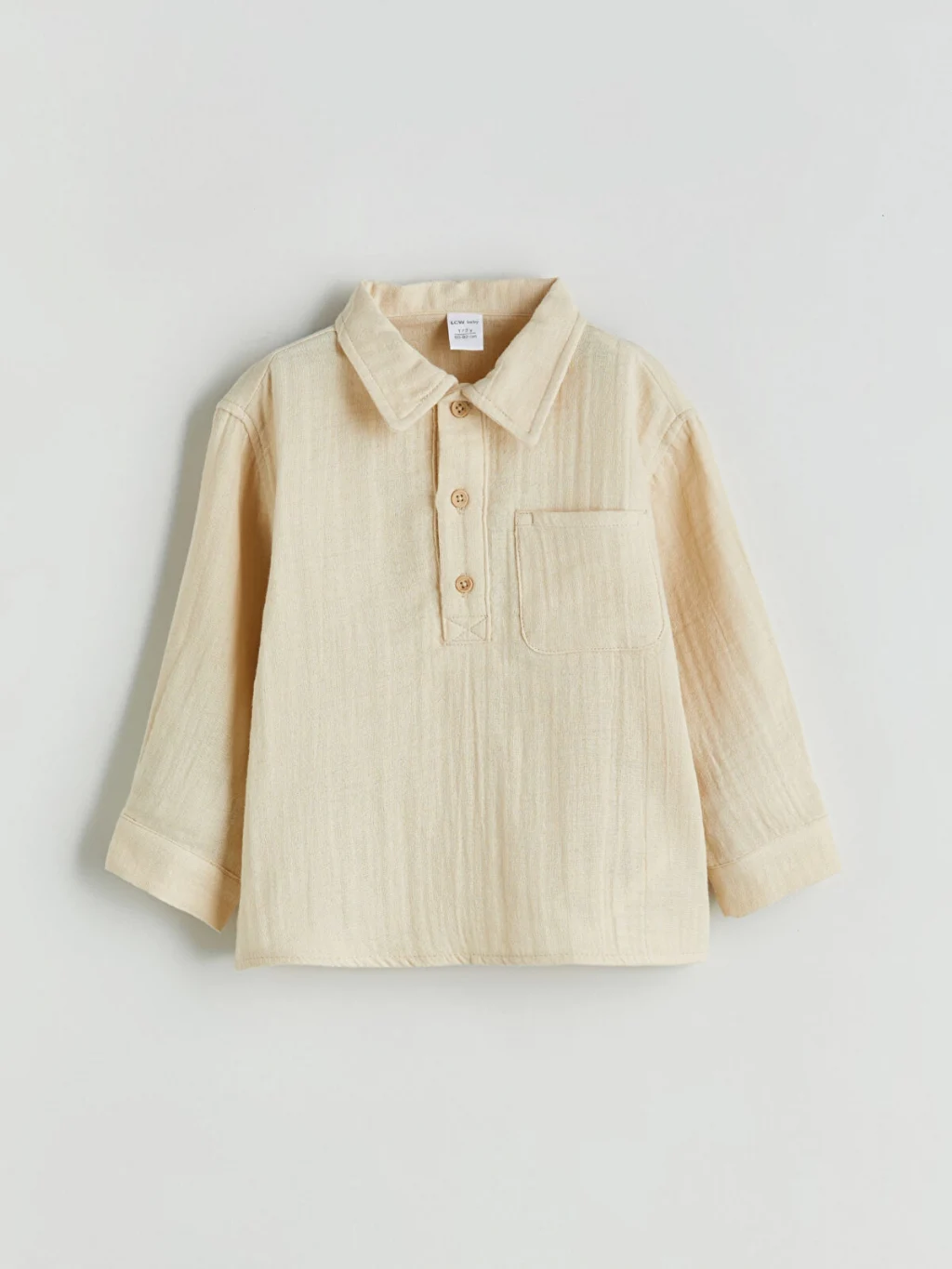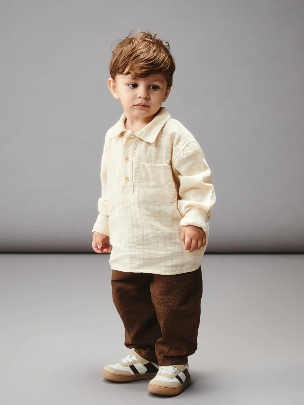 Erkek bebek takım, gömlek yaka, uzun kollu, yarım düğme kapamalı ve göğüs cepli üst ile dikiş detaylı pantolondan oluşur.