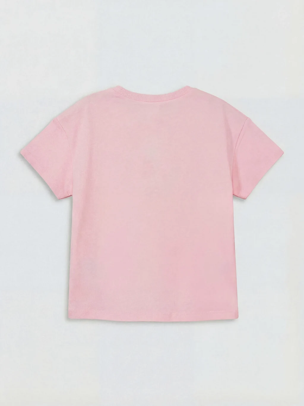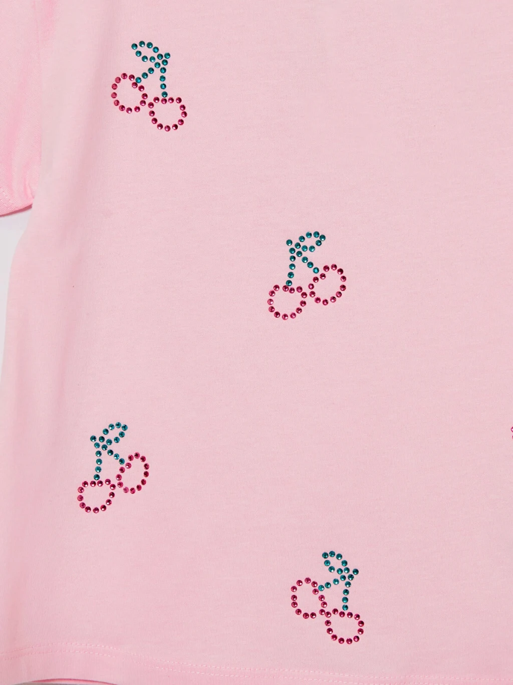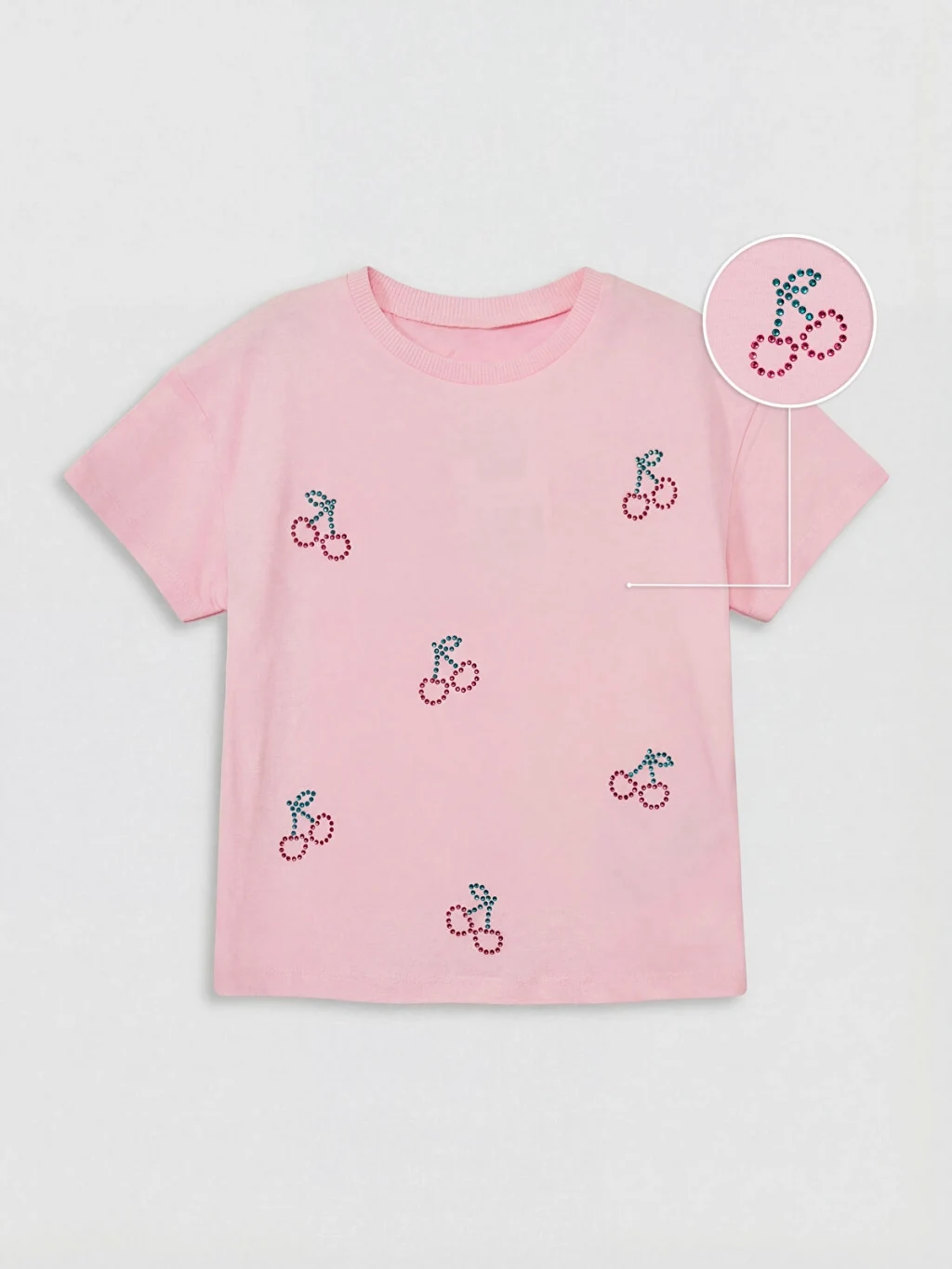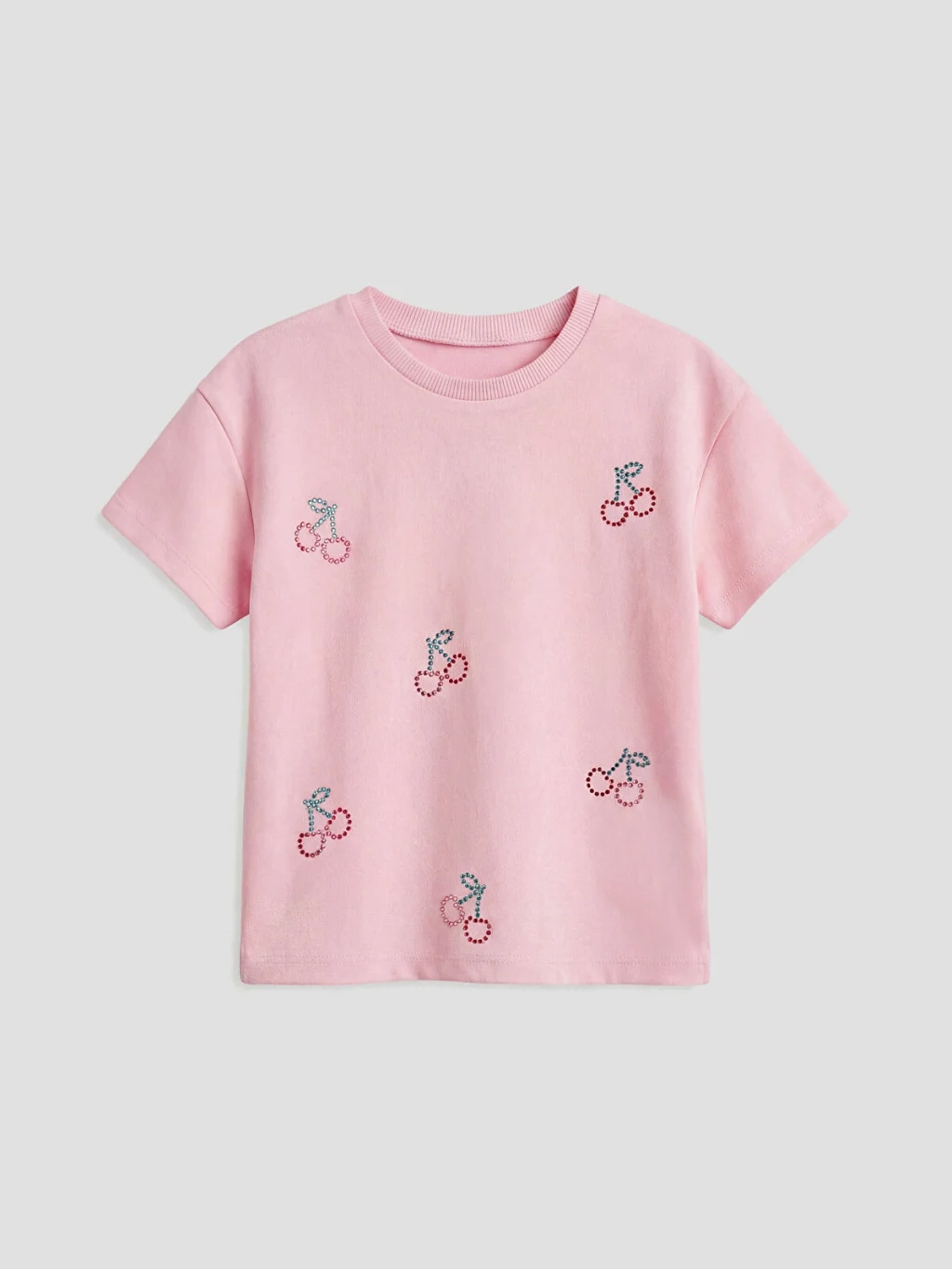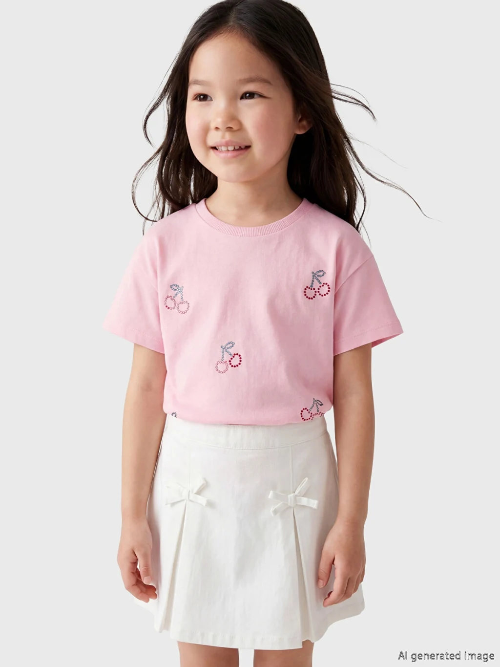 Kız çocuk tişört, %100 pamuk penye kumaştan üretilmiştir. Bisiklet yaka ve kısa kollu olup, desenli tasarıma sahiptir.