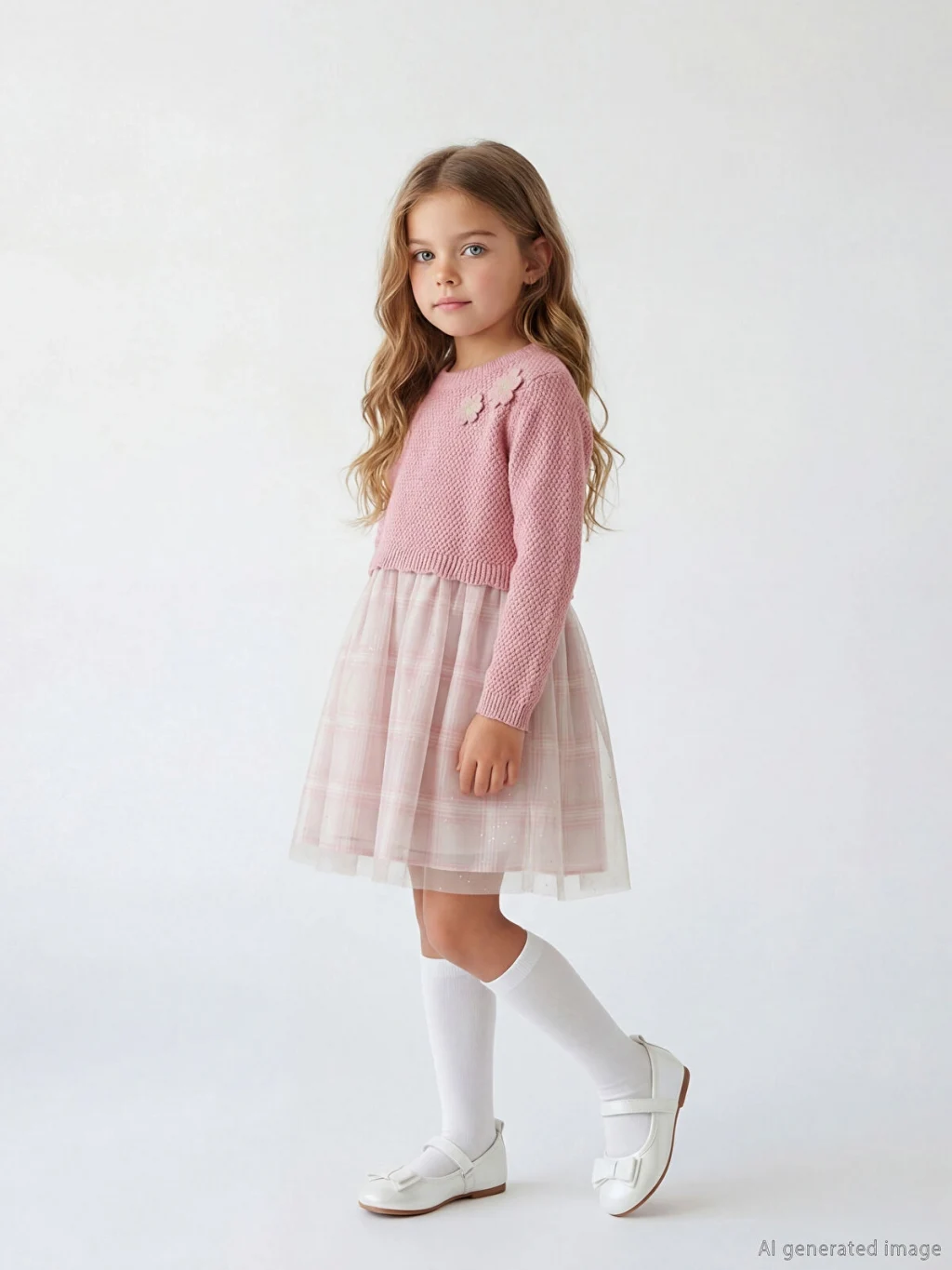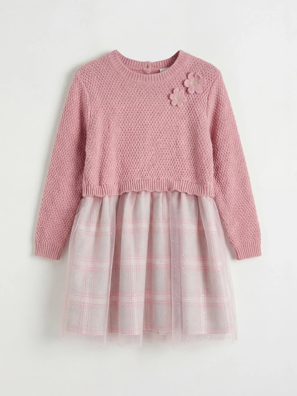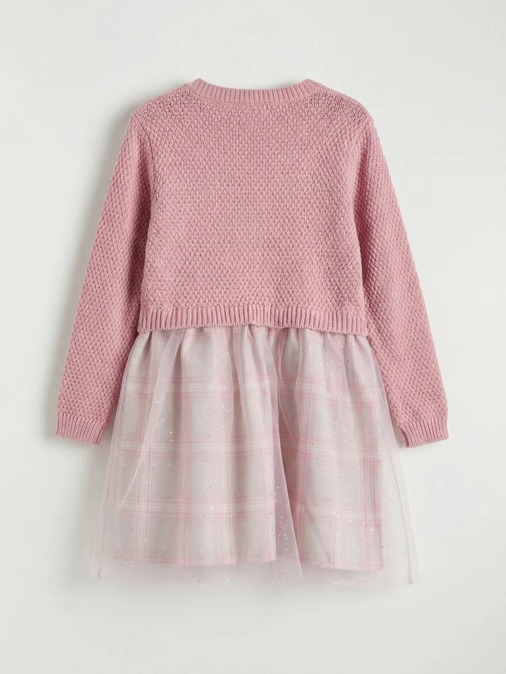 Triko üstlü elbise, bisiklet yaka ve uzun kollu tasarıma sahiptir. Üst kısmı triko kumaştan, etek kısmı tüllü kumaştan üretilmiştir.