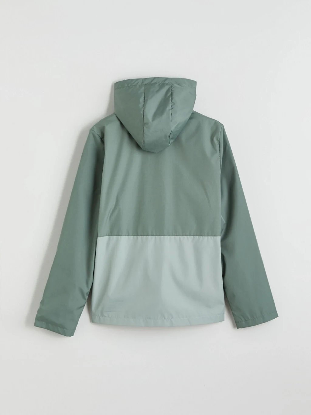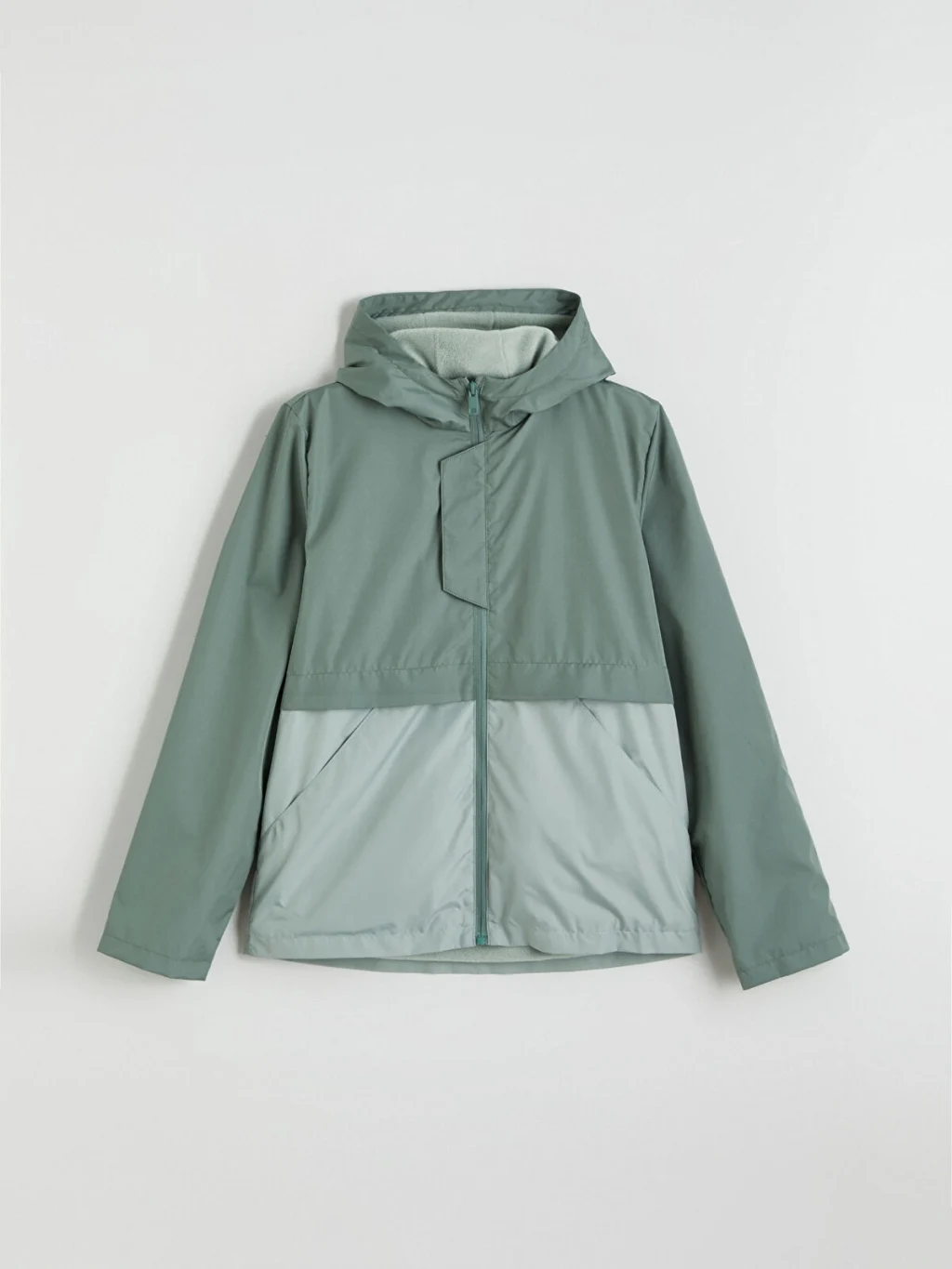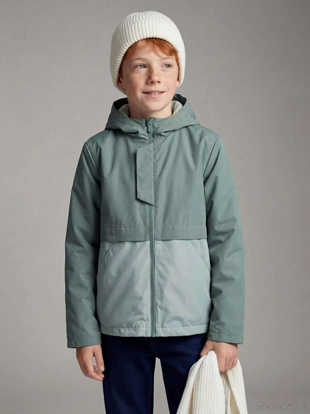 Kapüşonlu, uzun kollu erkek çocuk mont, önden fermuar kapamalıdır. Renk bloklu tasarıma sahip montun yan cepleri bulunur.