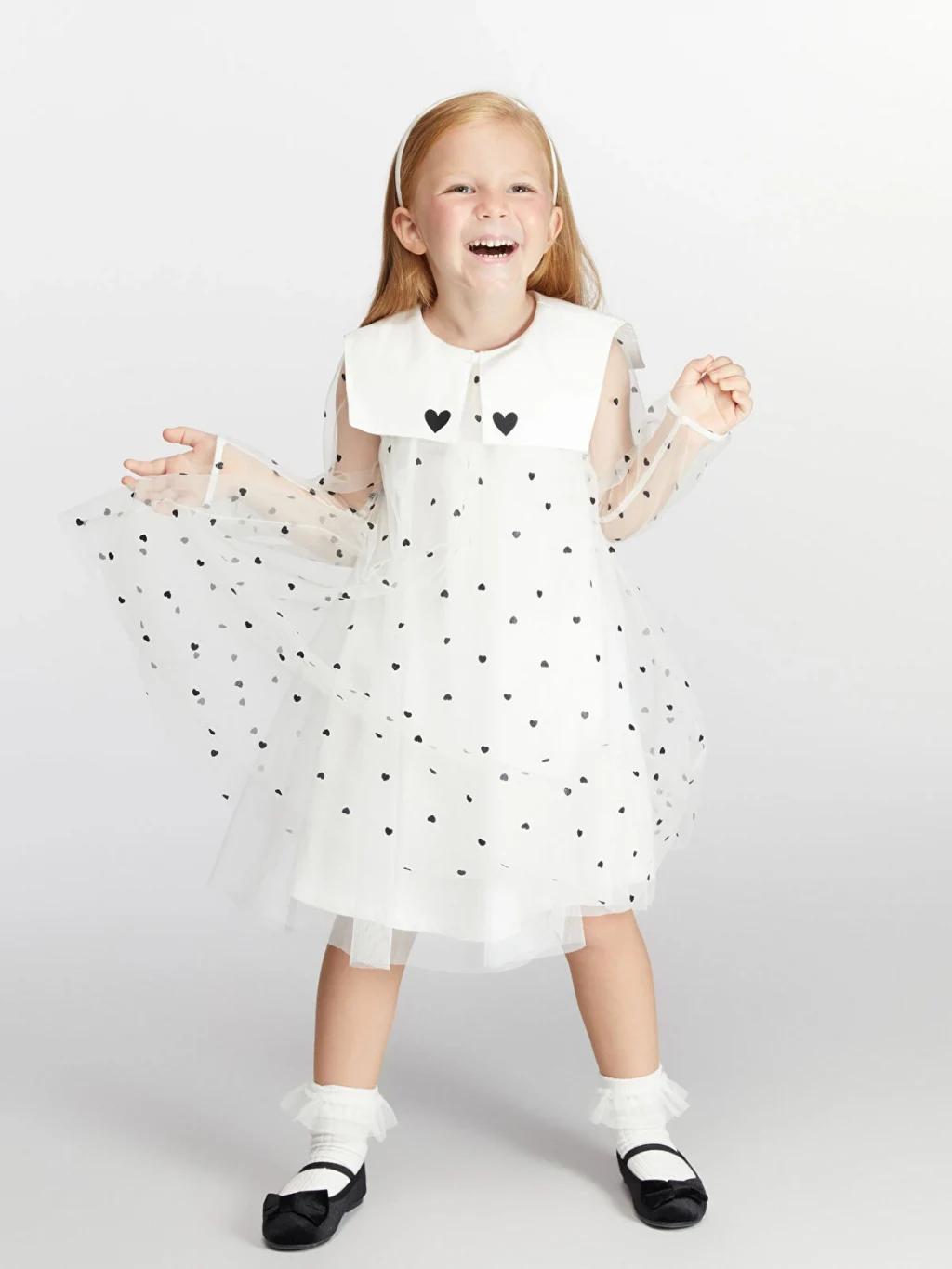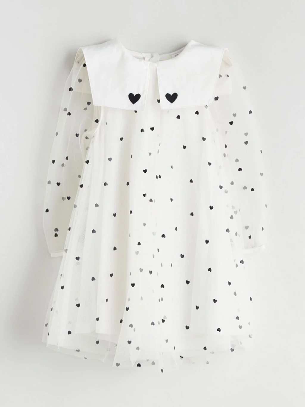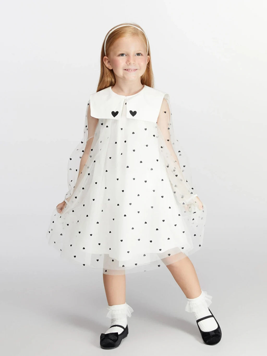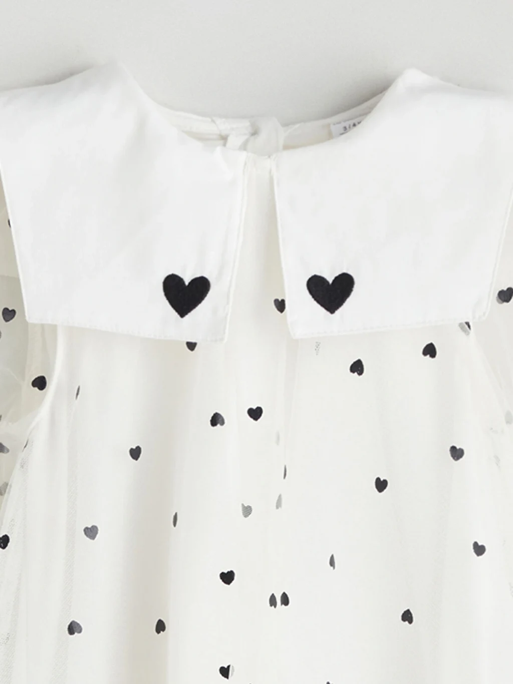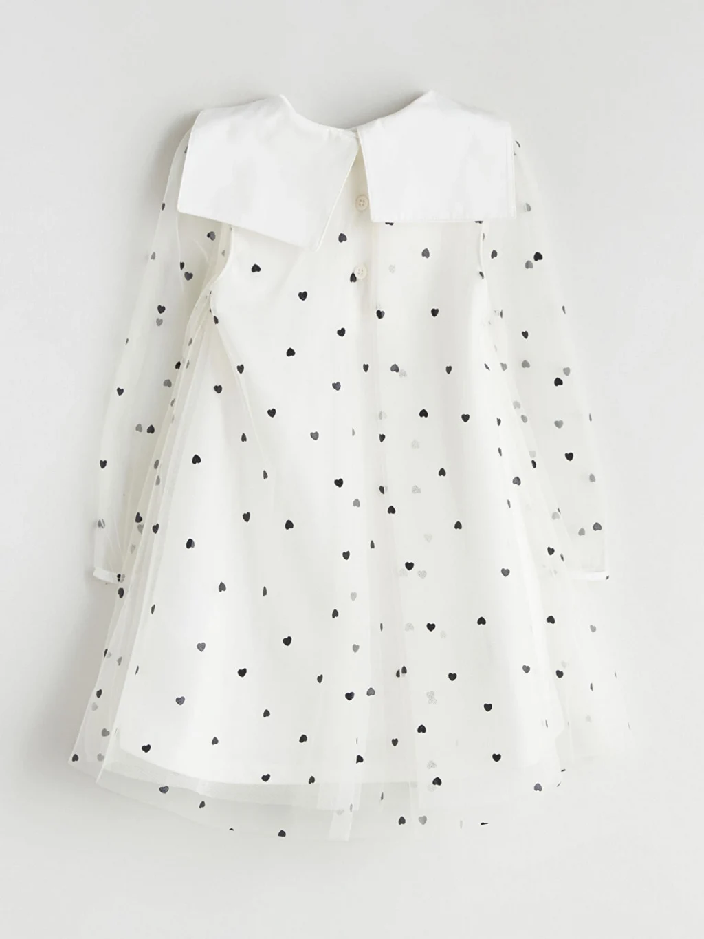 Bebe yakalı, kolsuz kız çocuk elbise, %100 pamuk astarlı ve kalp desenli tül kumaşa sahiptir. Arkadan düğme kapamalıdır.