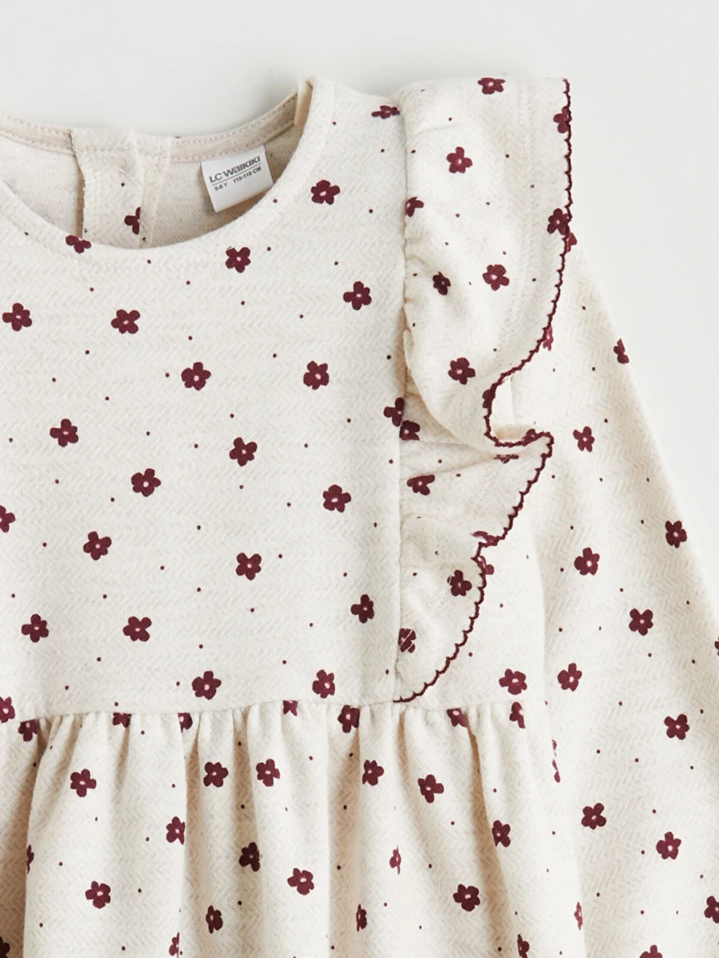 Bisiklet yaka, uzun kollu, çiçek desenli kız çocuk elbise, omuzları fırfırlı ve beli büzgülüdür. Arkası düğme kapamalıdır.