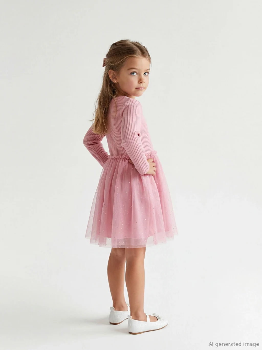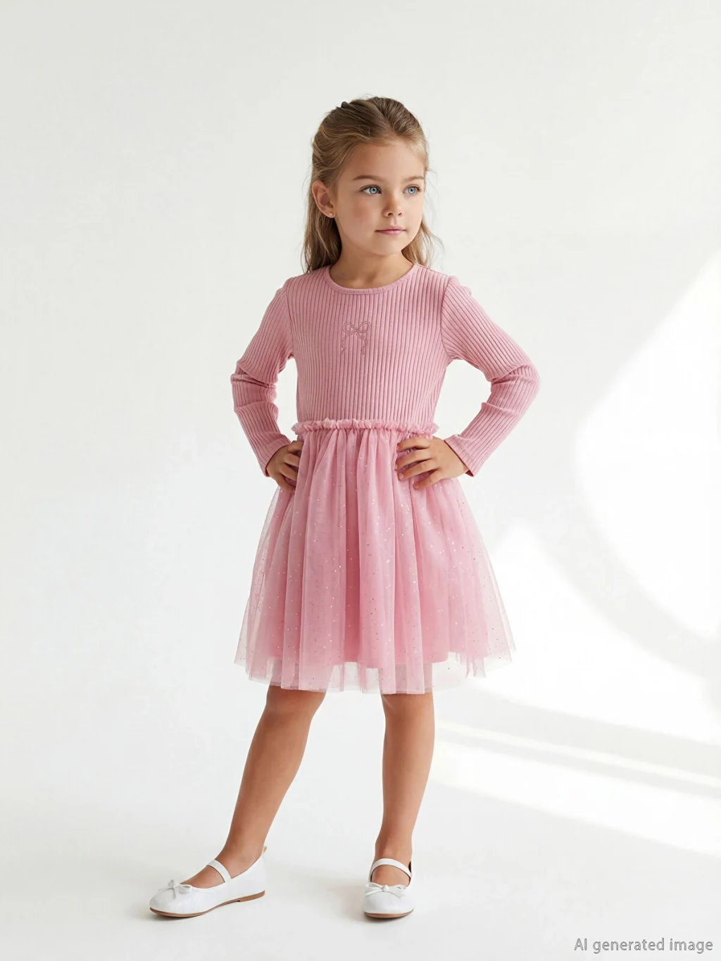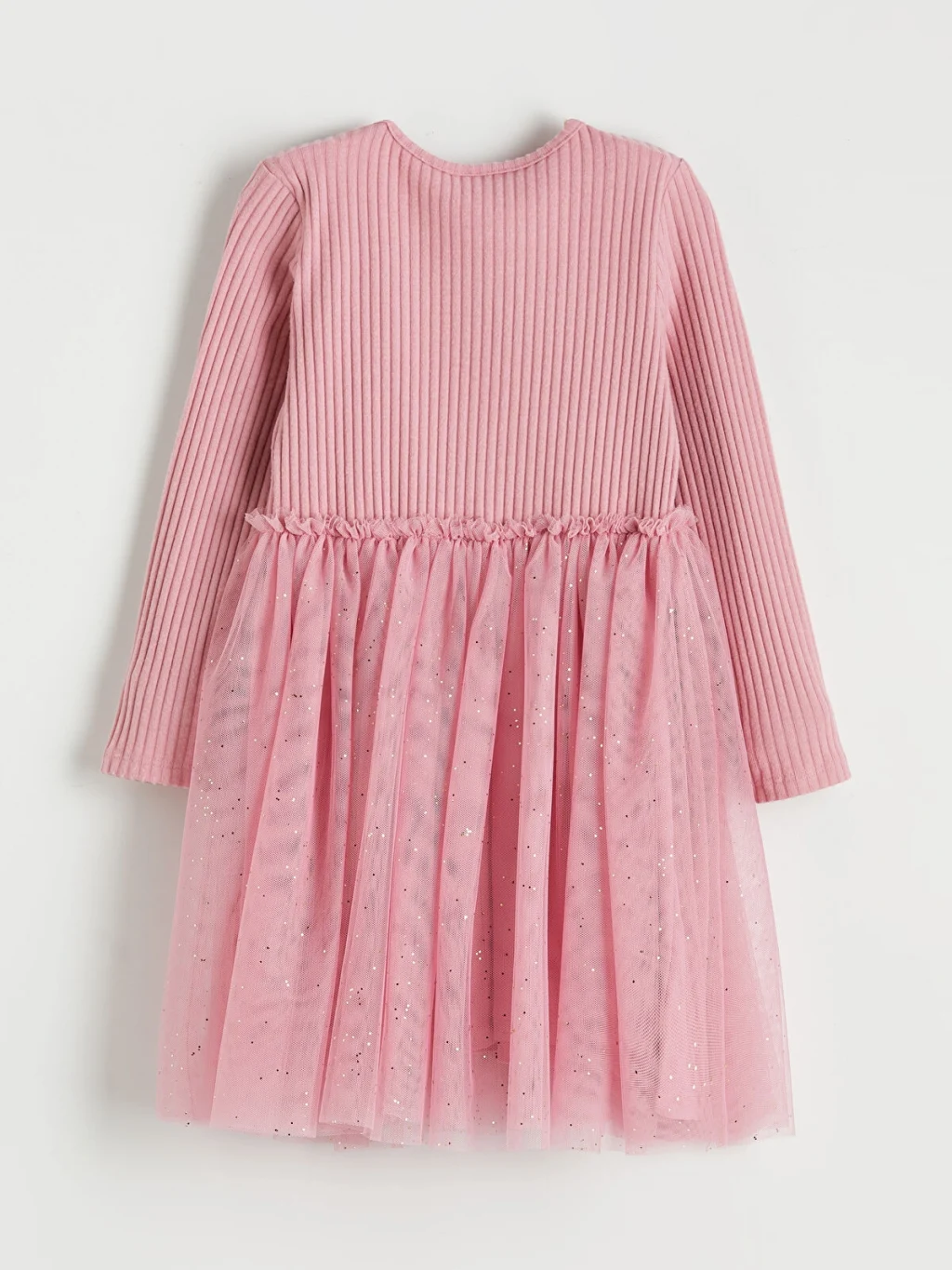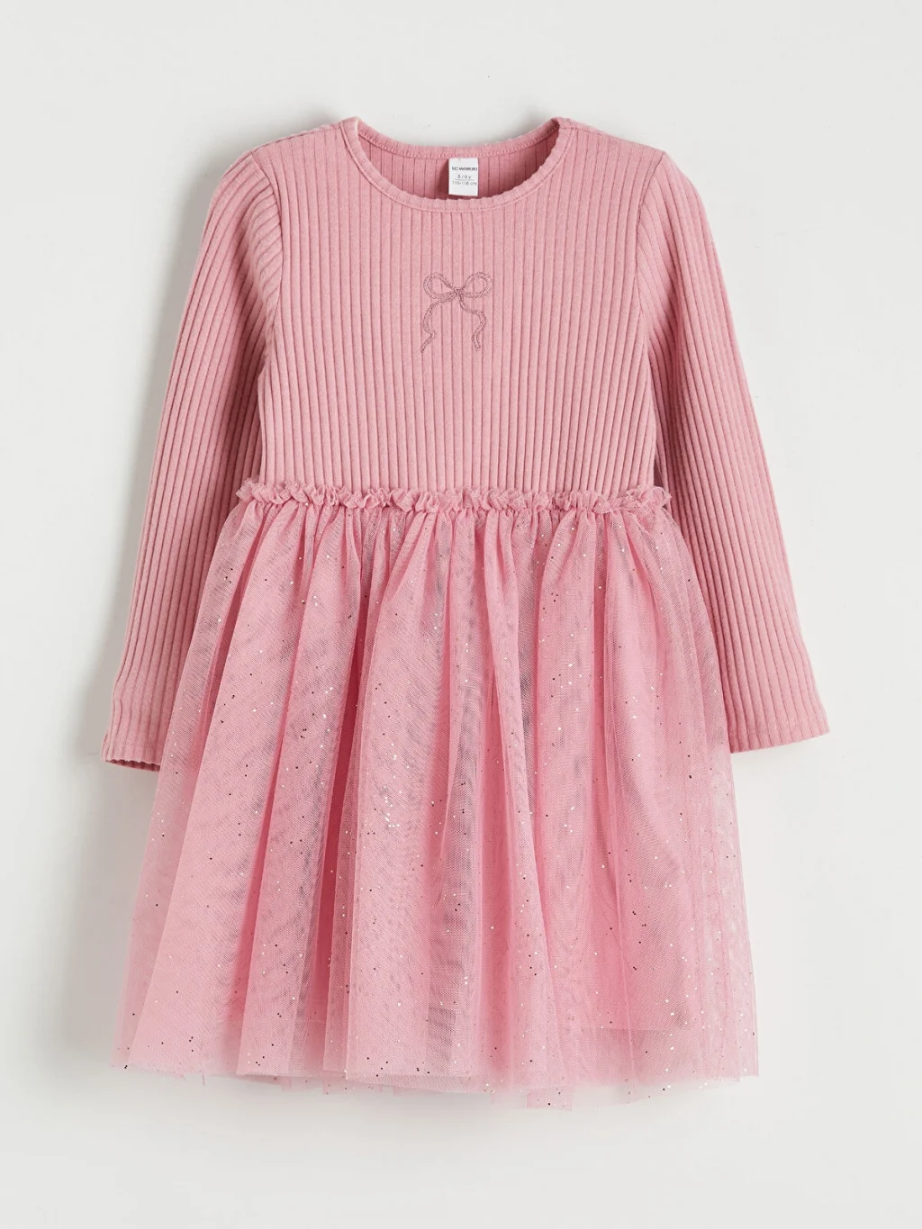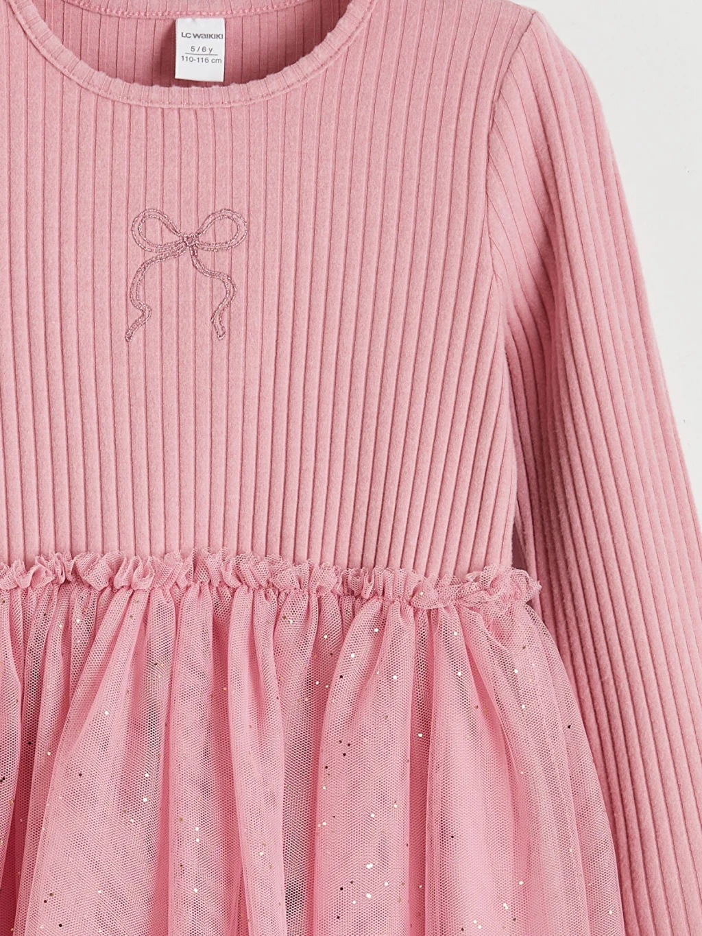 Kız çocuk elbise, bisiklet yaka ve uzun kolludur. Önü fiyonklu, belden büzgülü eteği tül detaylıdır.
