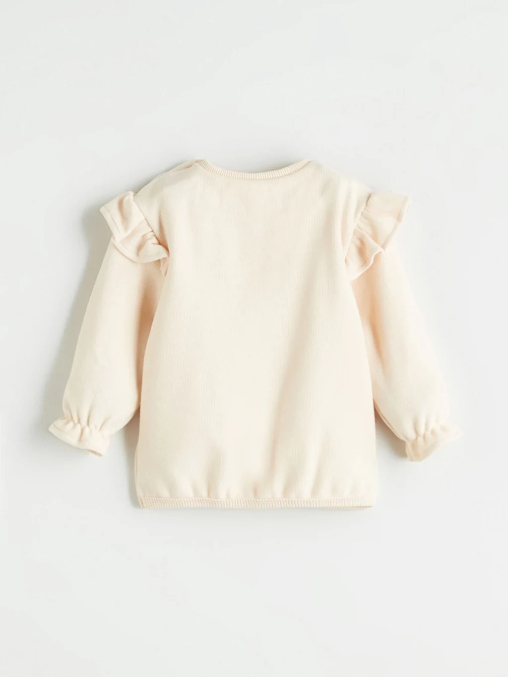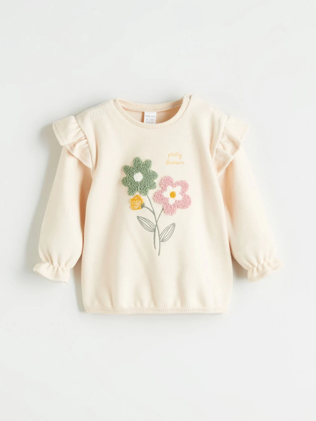 Kız bebek takım, pamuk karışımlı kumaştan üretilmiştir. Omuzda çıtçıt kapamalı ve çiçek desenlidir. Kollarında fırfır detayı bulunur.