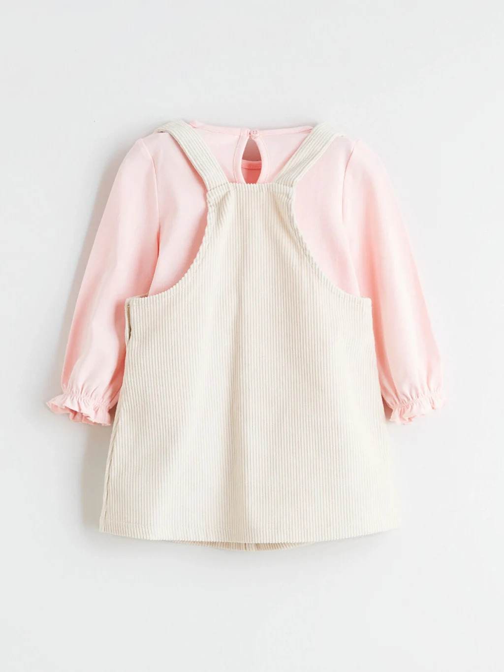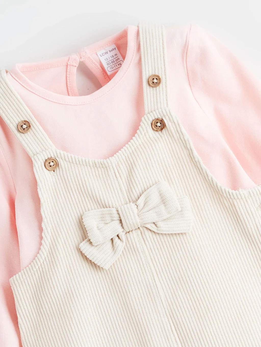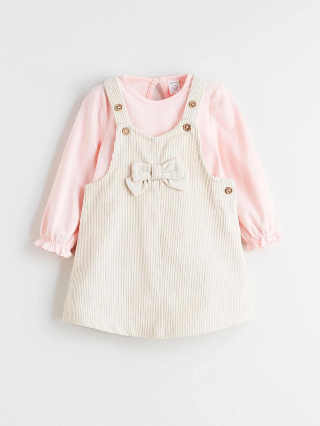 Kız bebek elbise ve tişört takımı, fiyonk detaylı tasarıma sahiptir. Kadife kumaştan üretilmiştir.