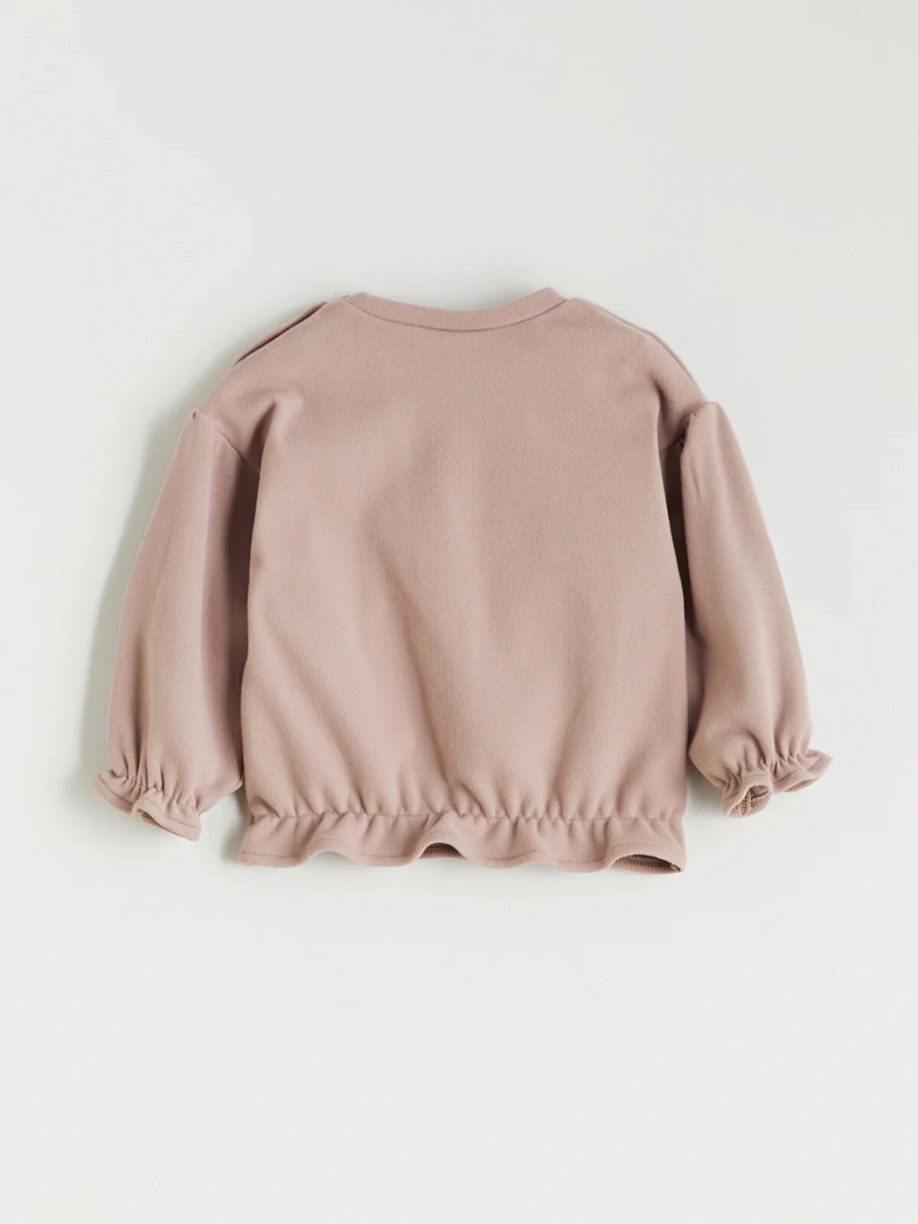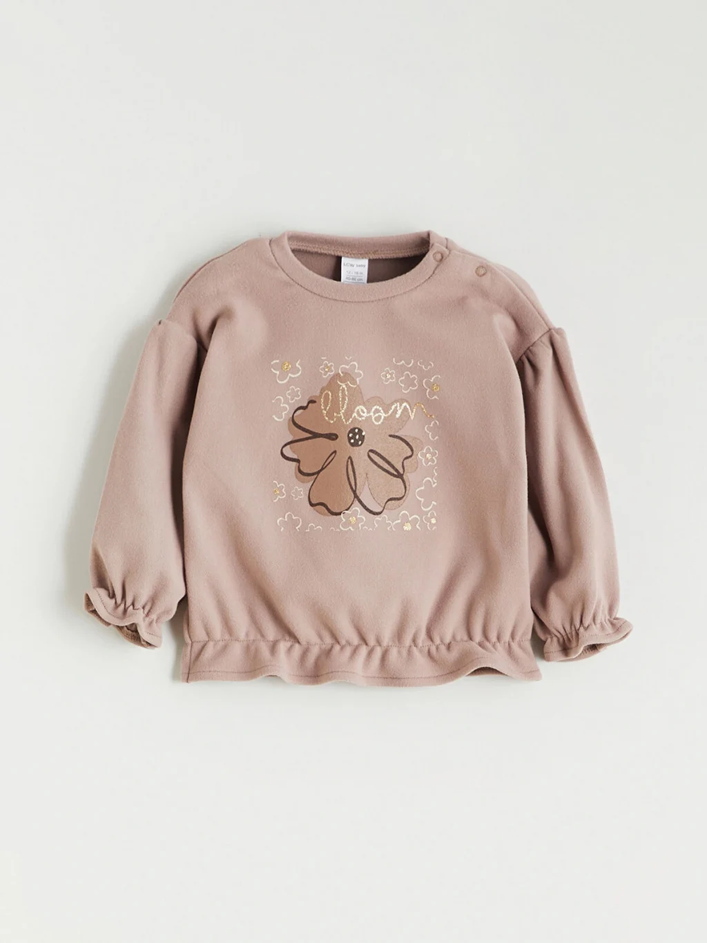 Omuzdan çıtçıt kapamalı, bisiklet yaka kız bebek sweatshirtün kol uçları ve beli lastiklidir. Çiçek baskılı takım, beli lastikli eşofman altı içerir.