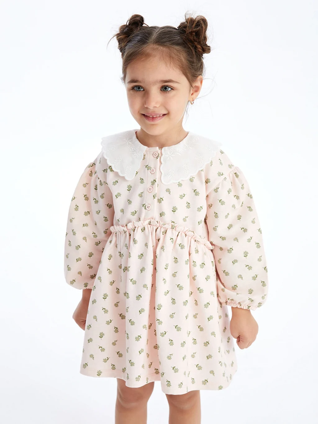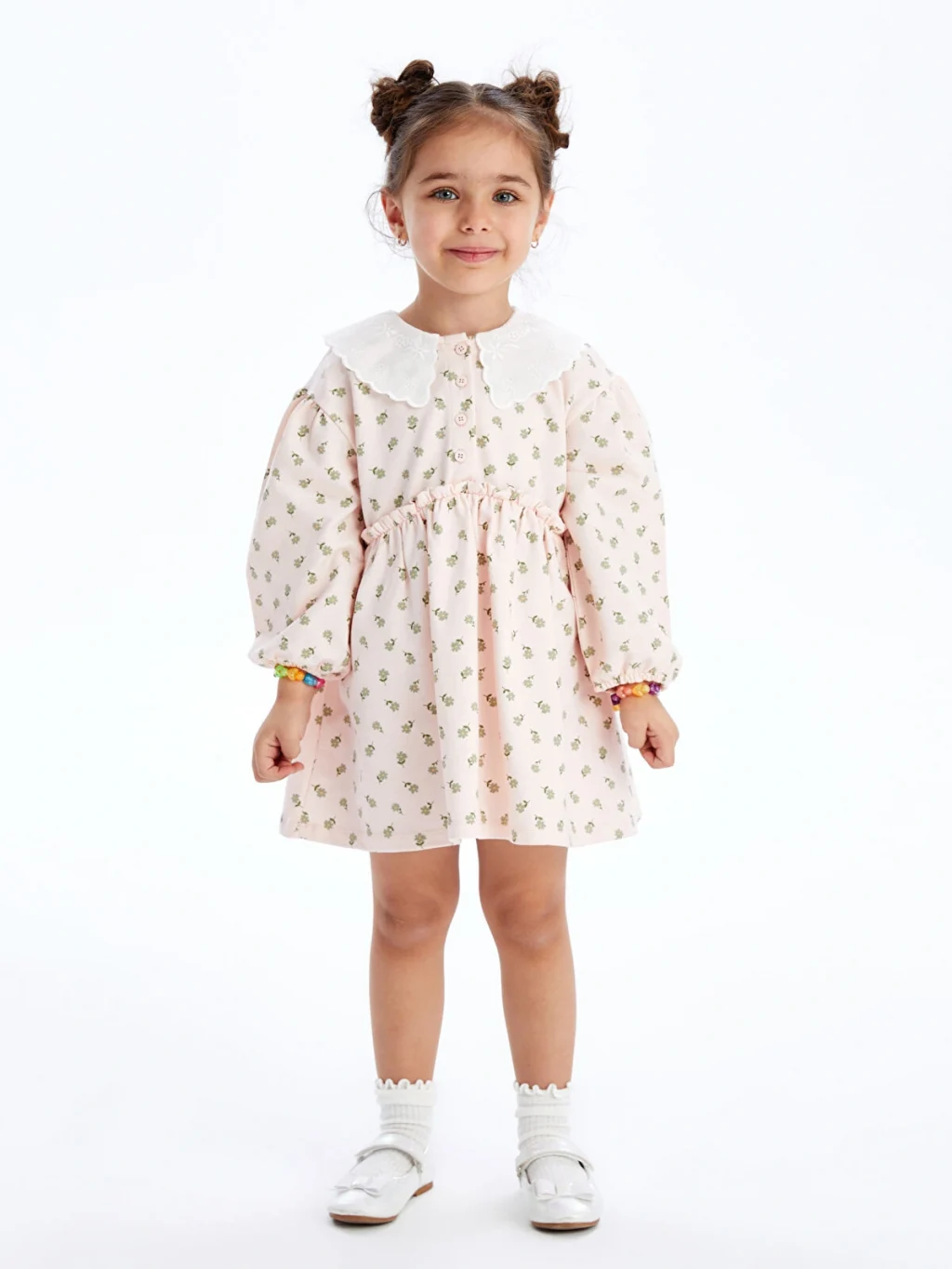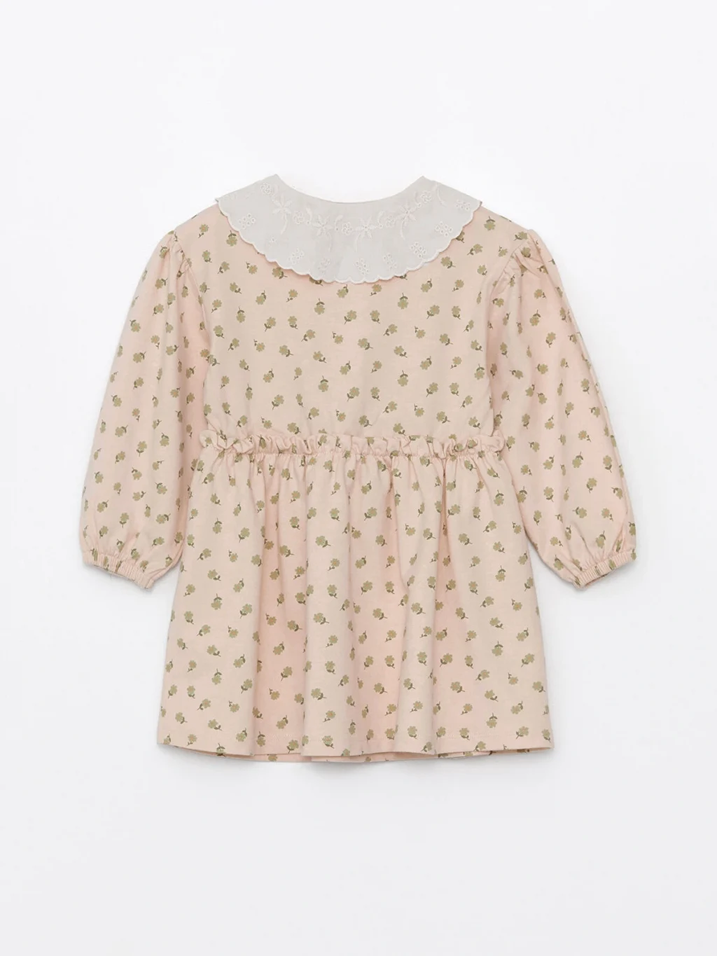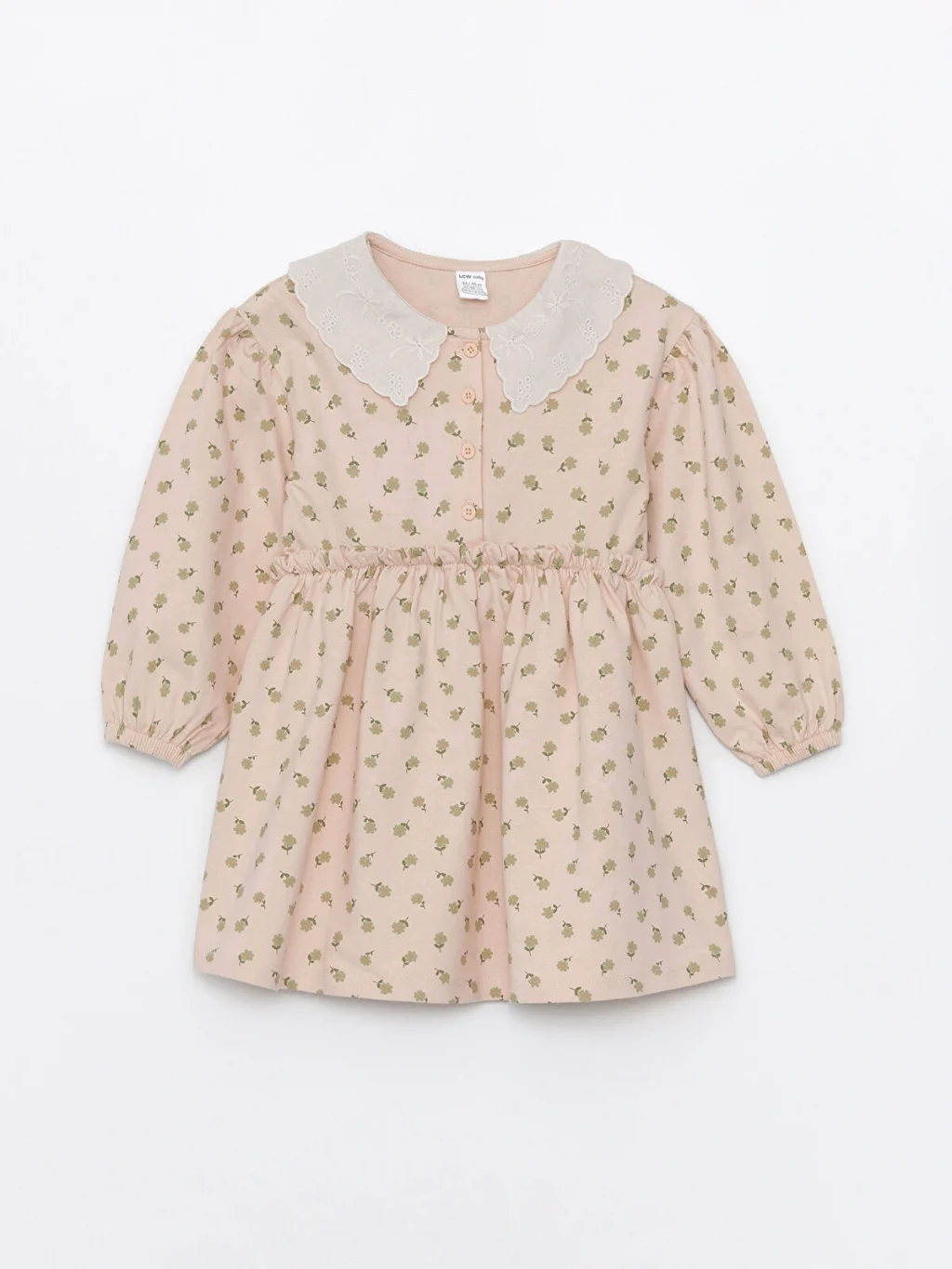 %100 pamuklu penye kumaştan üretilen desenli kız çocuk elbise, işlemeli bebe yakalı, uzun kollu, önden düğme kapamalı ve beli büzgülüdür.