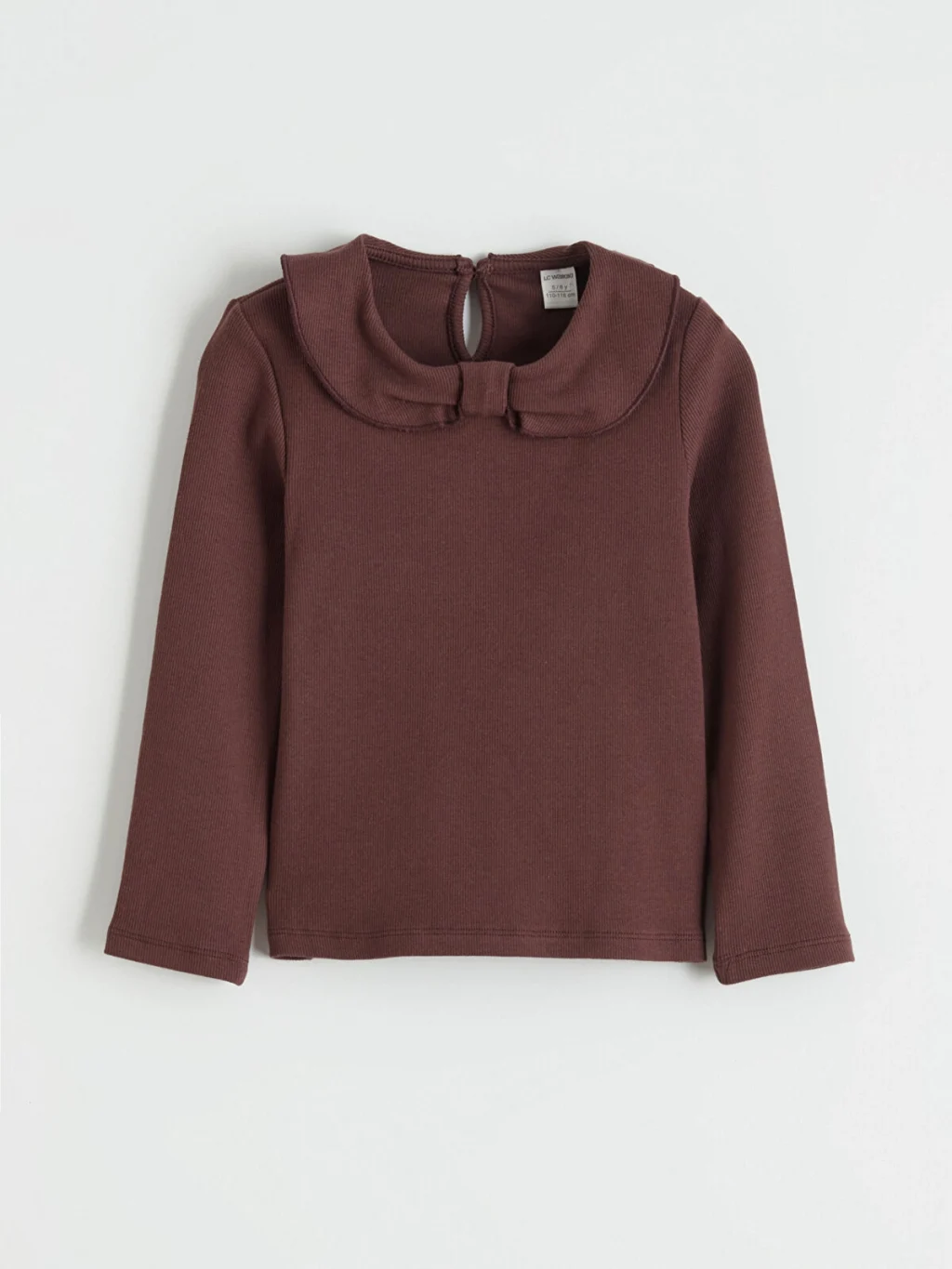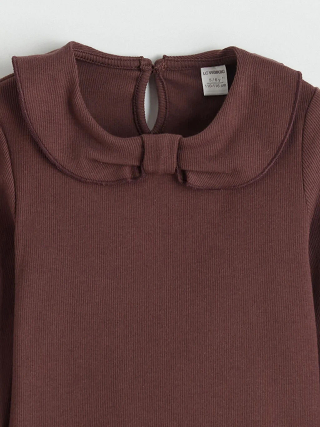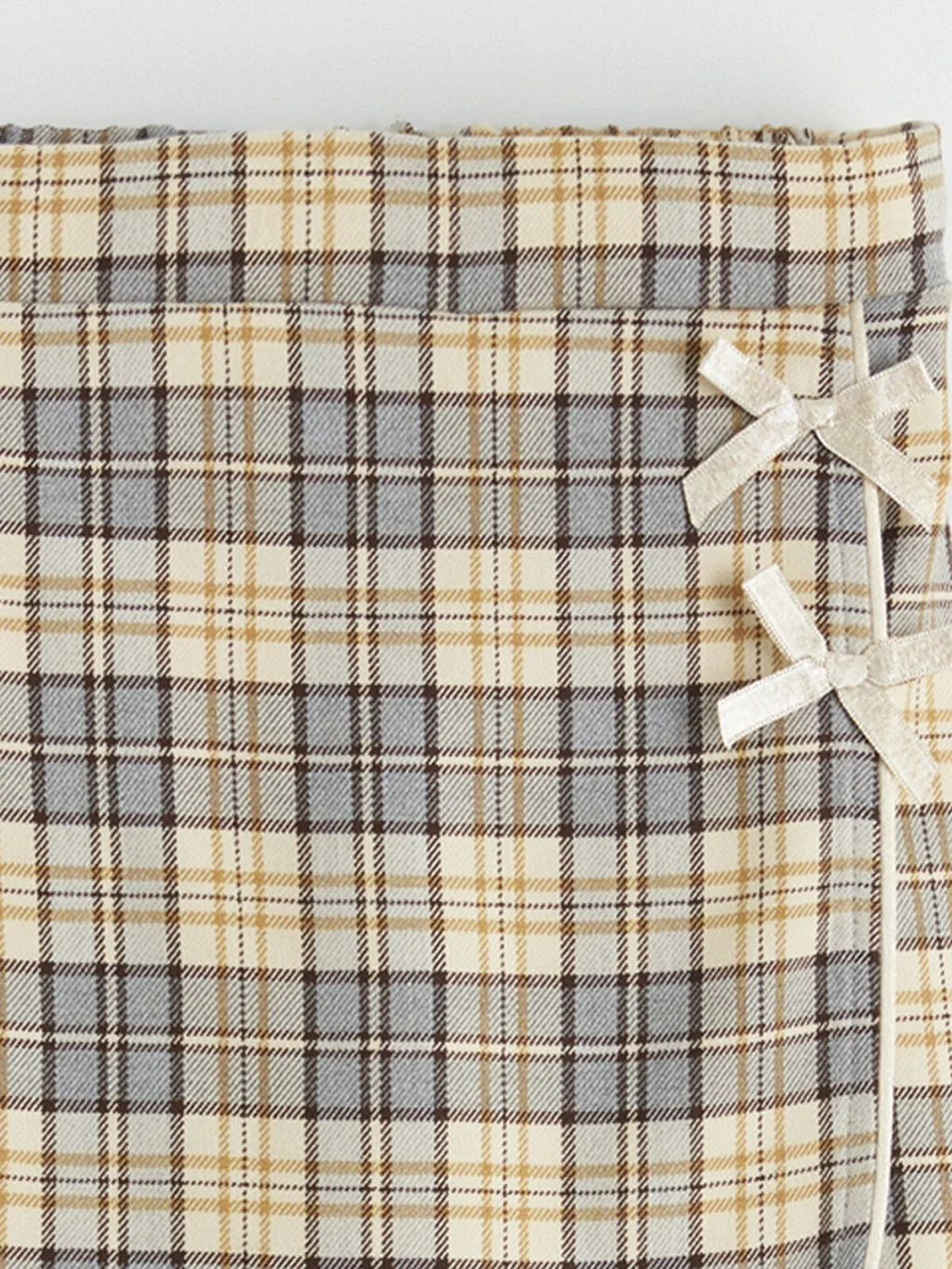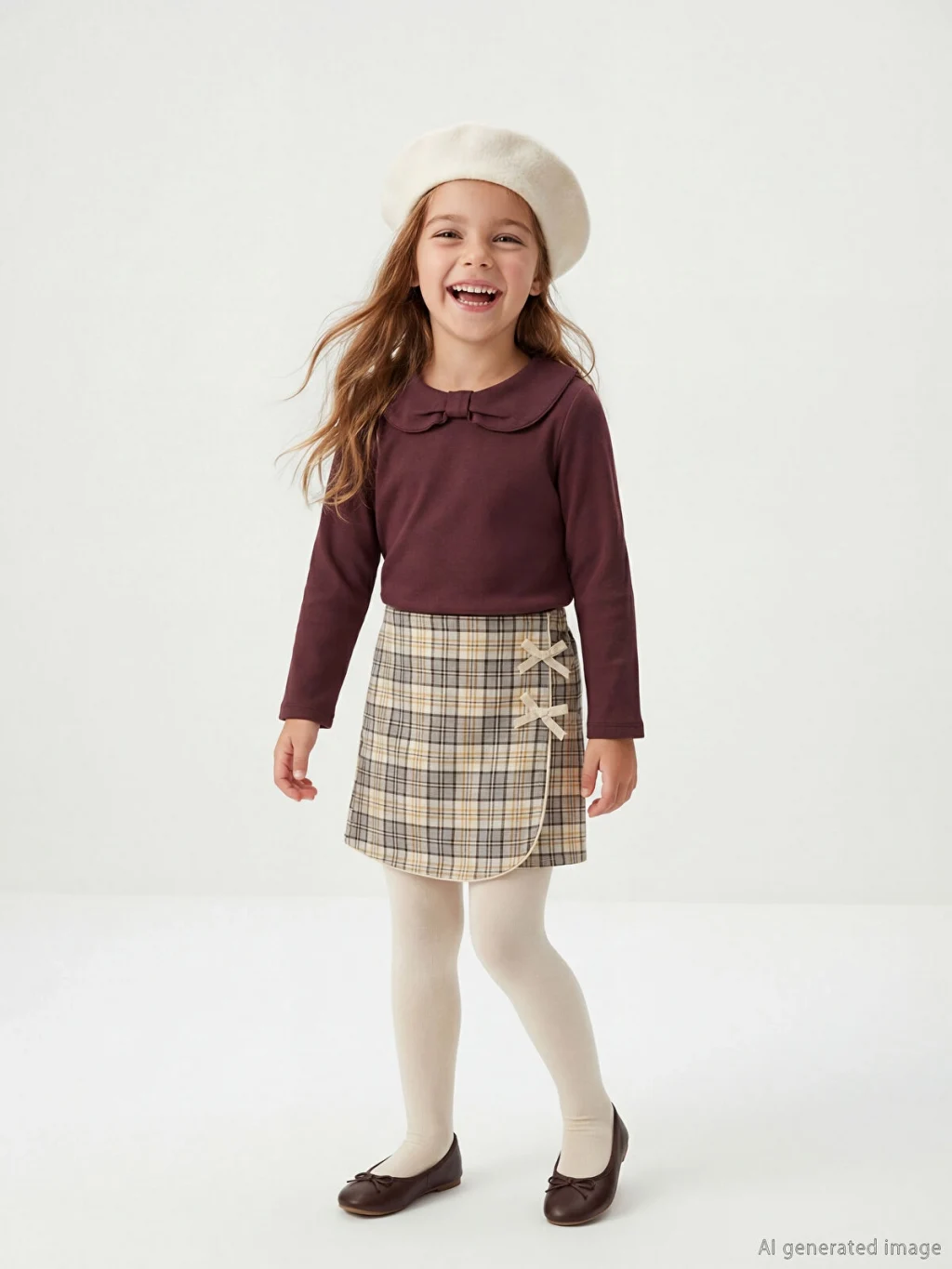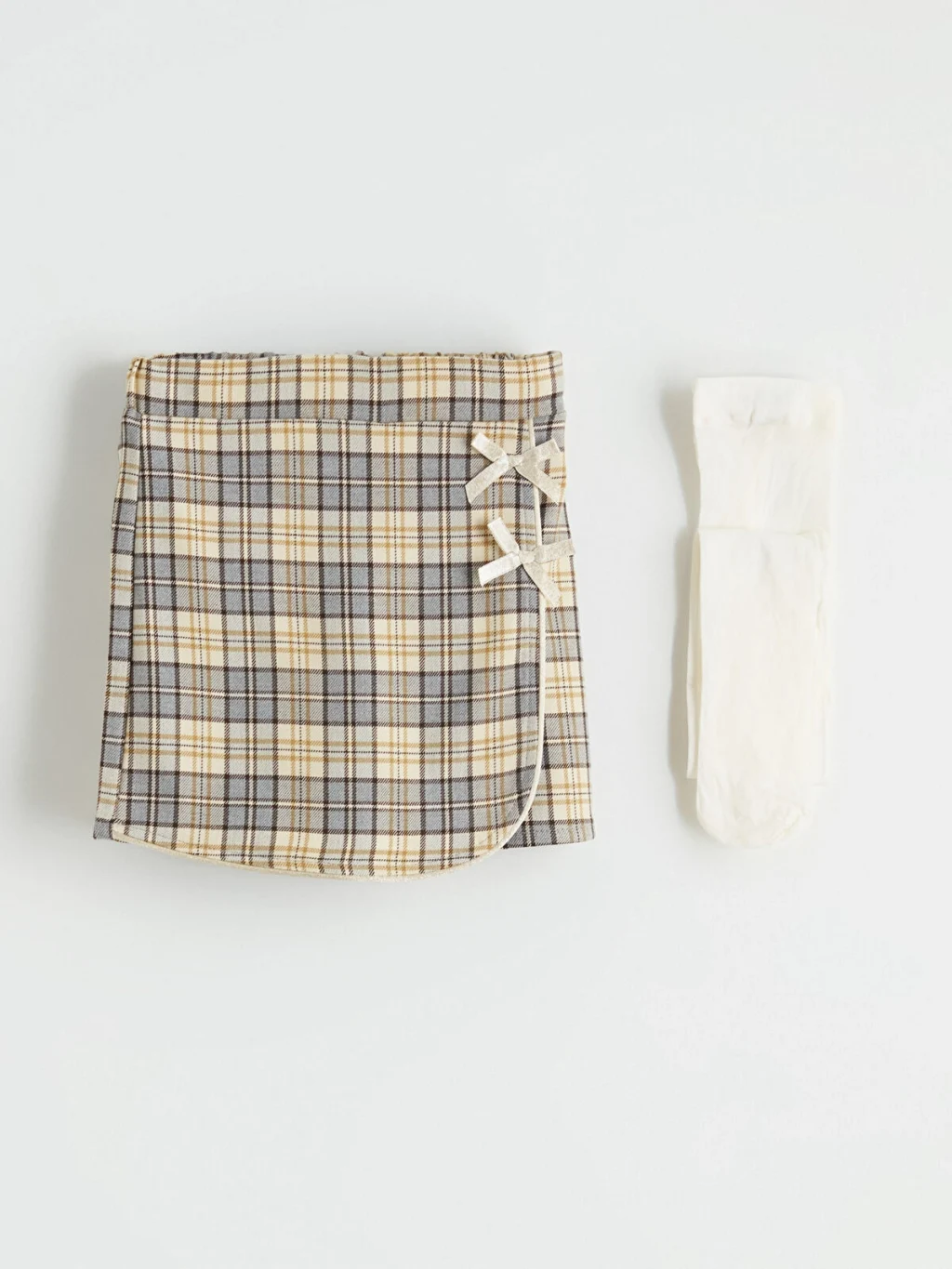 Kız çocuk takım; bebe yakalı, uzun kollu üst, ekose desenli şort etek ve çoraptan oluşur. Üst arkadan düğme kapamalıdır.