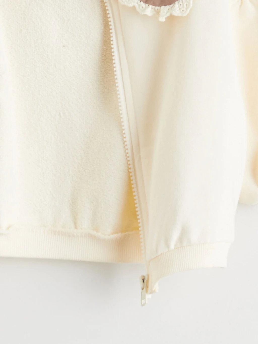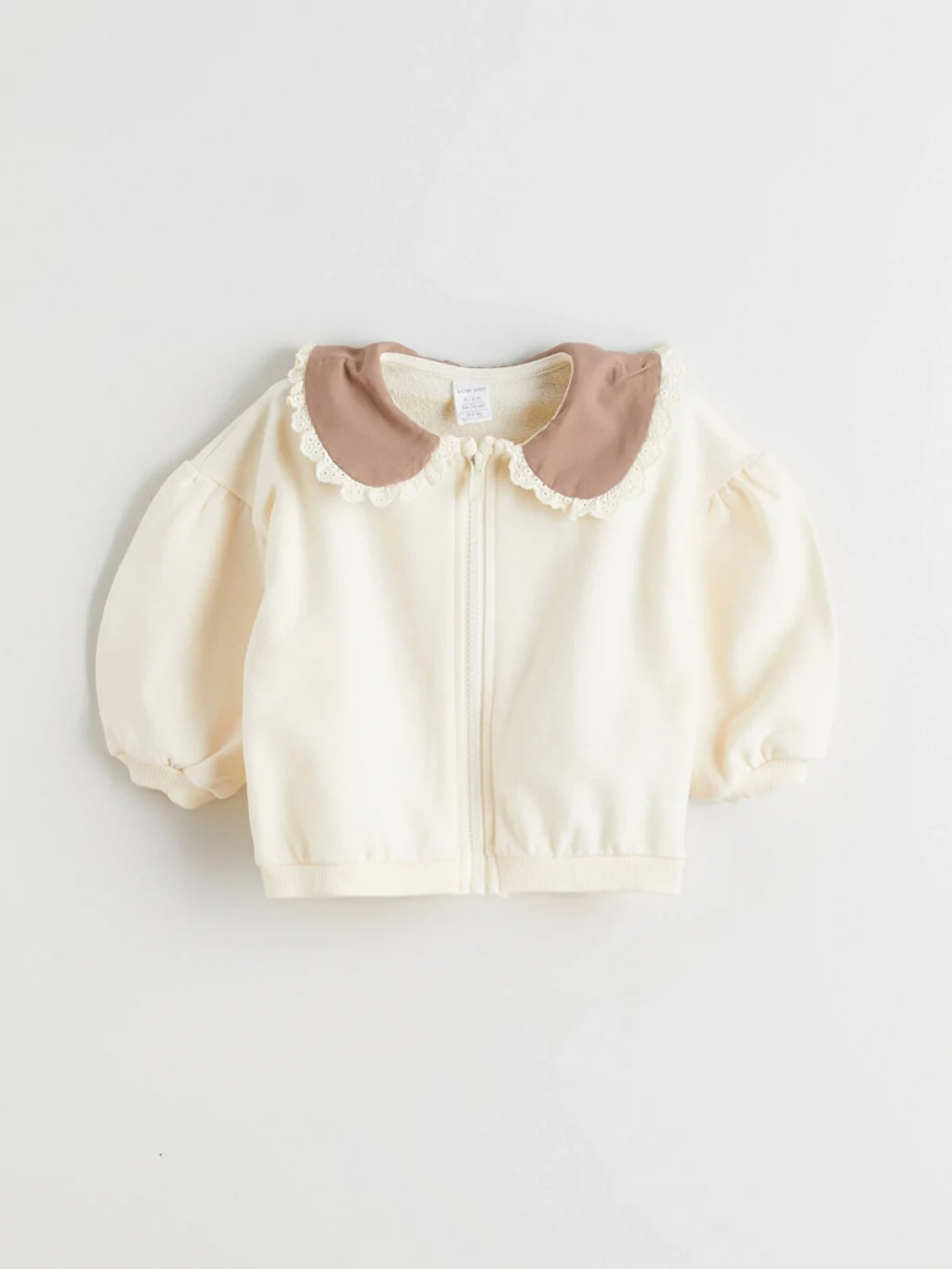 Bebe yaka kız bebek hırka ve pantolon, 2 iplik kumaştan üretilmiştir. Fermuar kapamalı tasarıma sahiptir.
