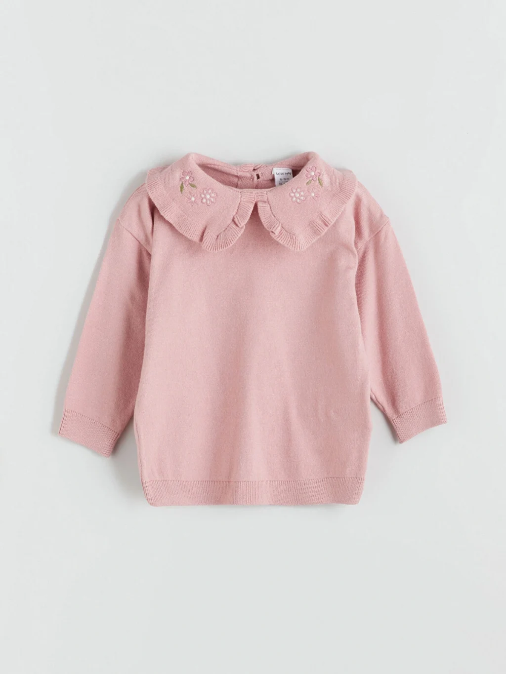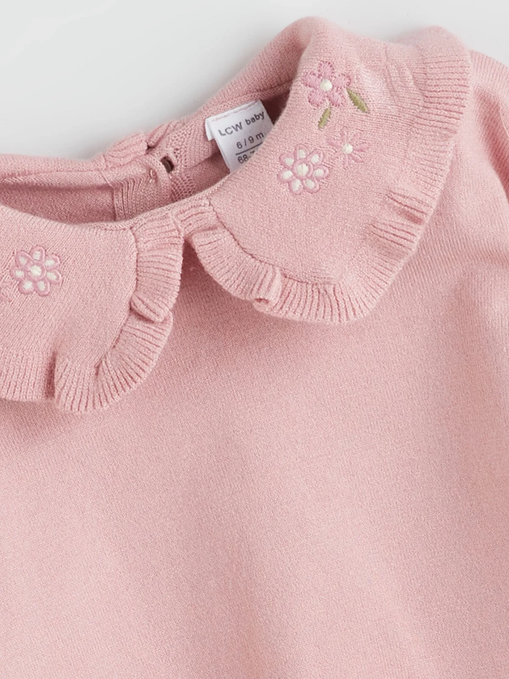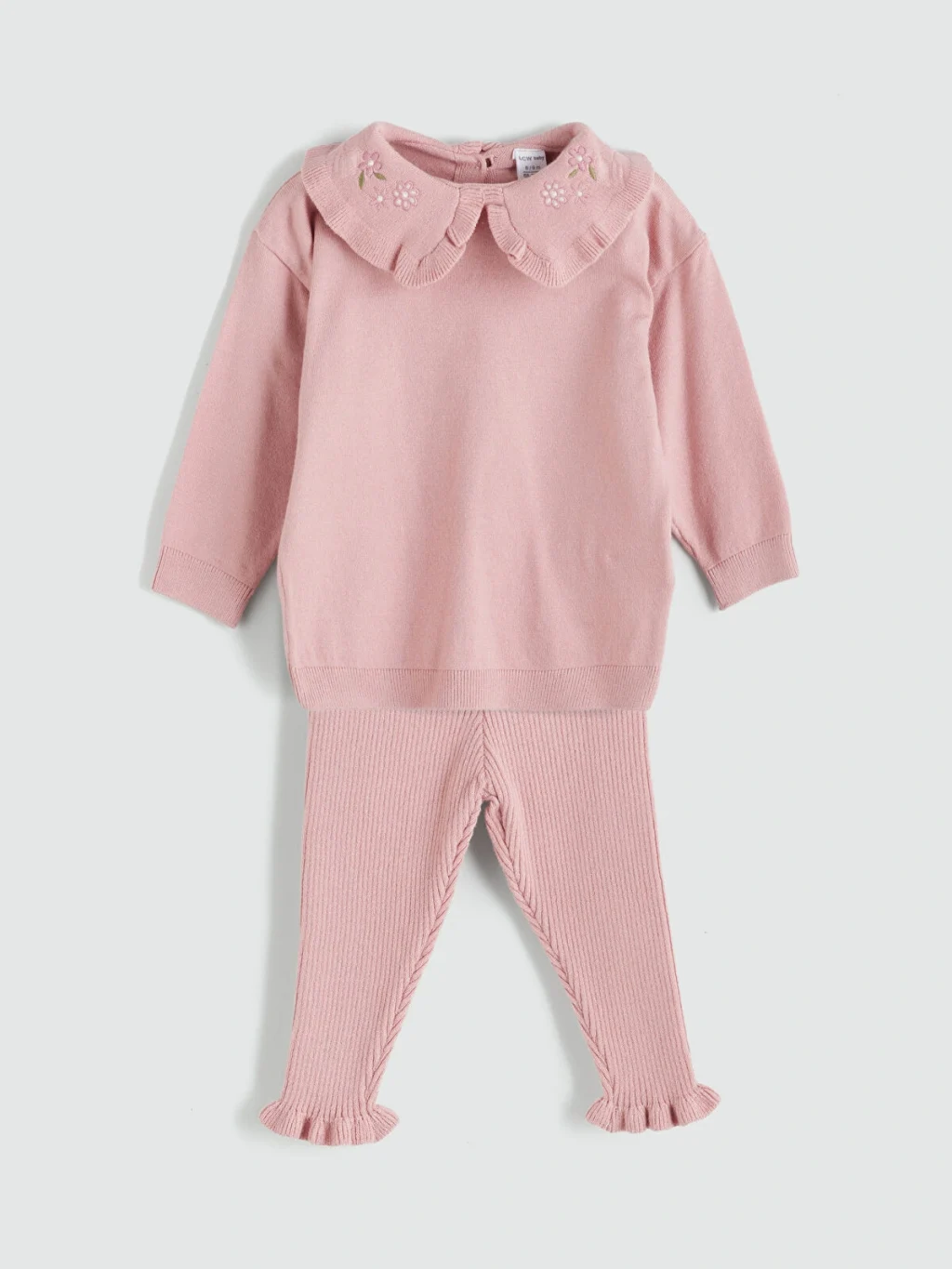 Kız bebek takım; çiçek işlemeli, fırfırlı bebe yakalı, uzun kollu üst ve paçaları fırfırlı fitilli alttan oluşur. Üst, enseden düğme kapamalıdır.
