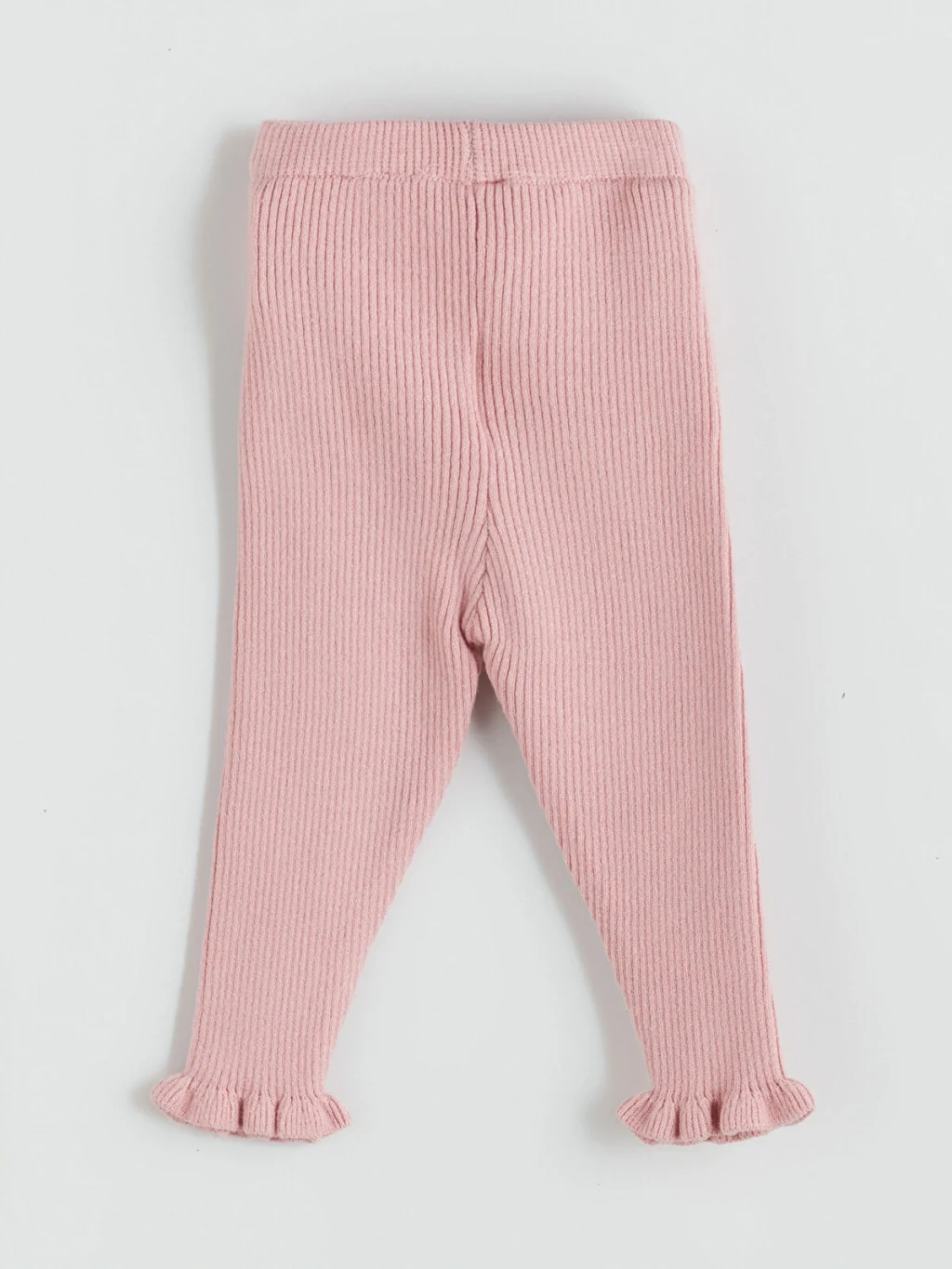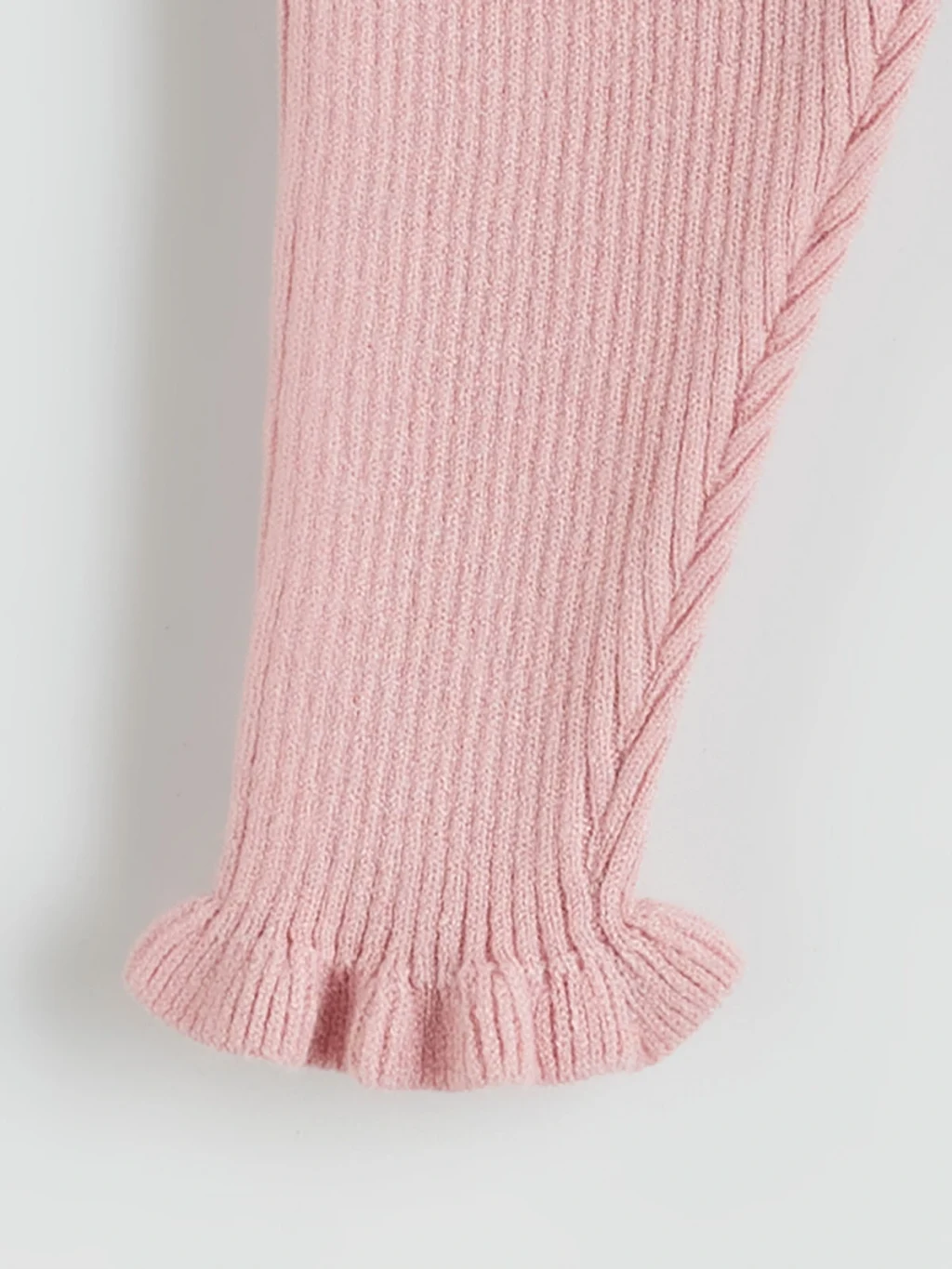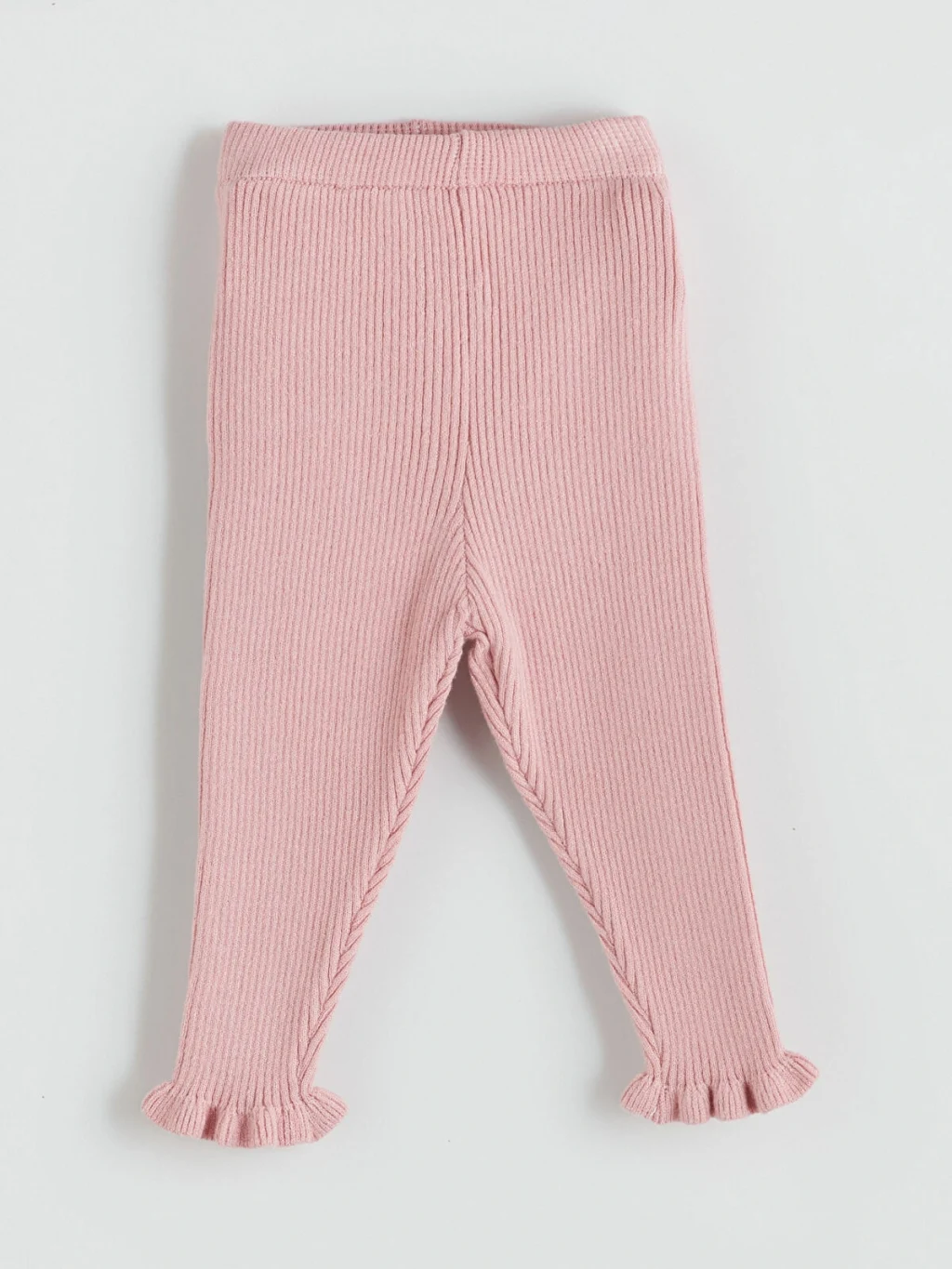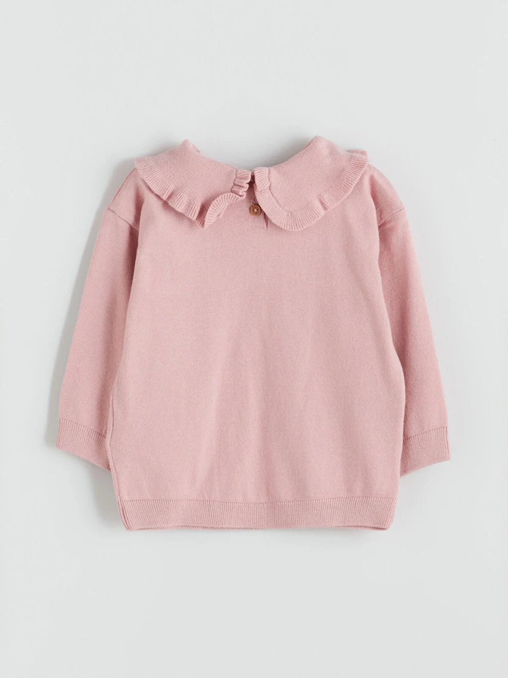 Kız bebek takım; çiçek işlemeli, fırfırlı bebe yakalı, uzun kollu üst ve paçaları fırfırlı fitilli alttan oluşur. Üst, enseden düğme kapamalıdır.