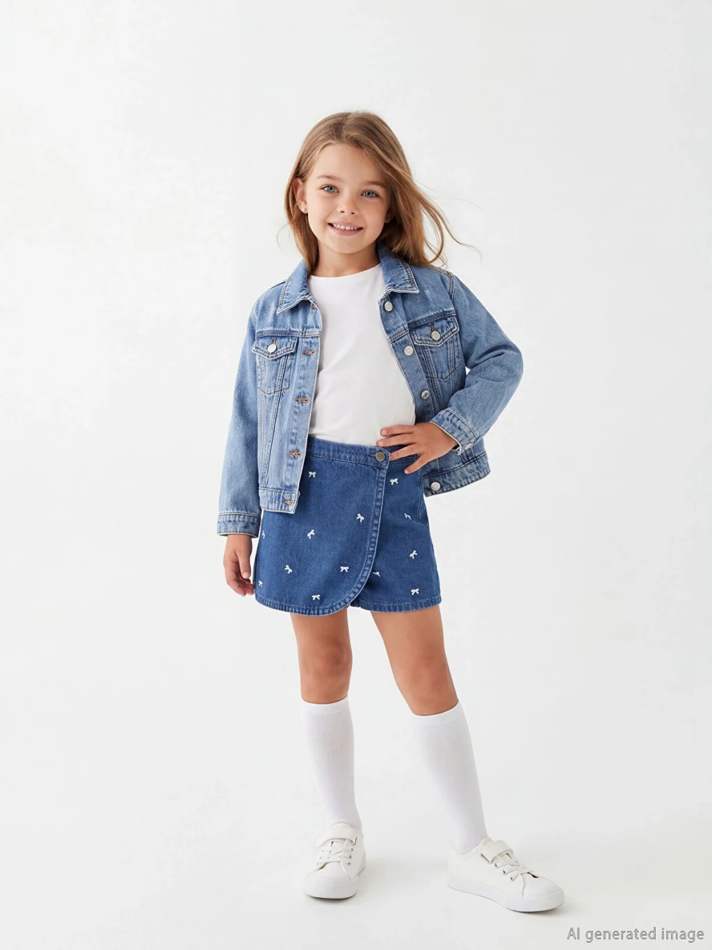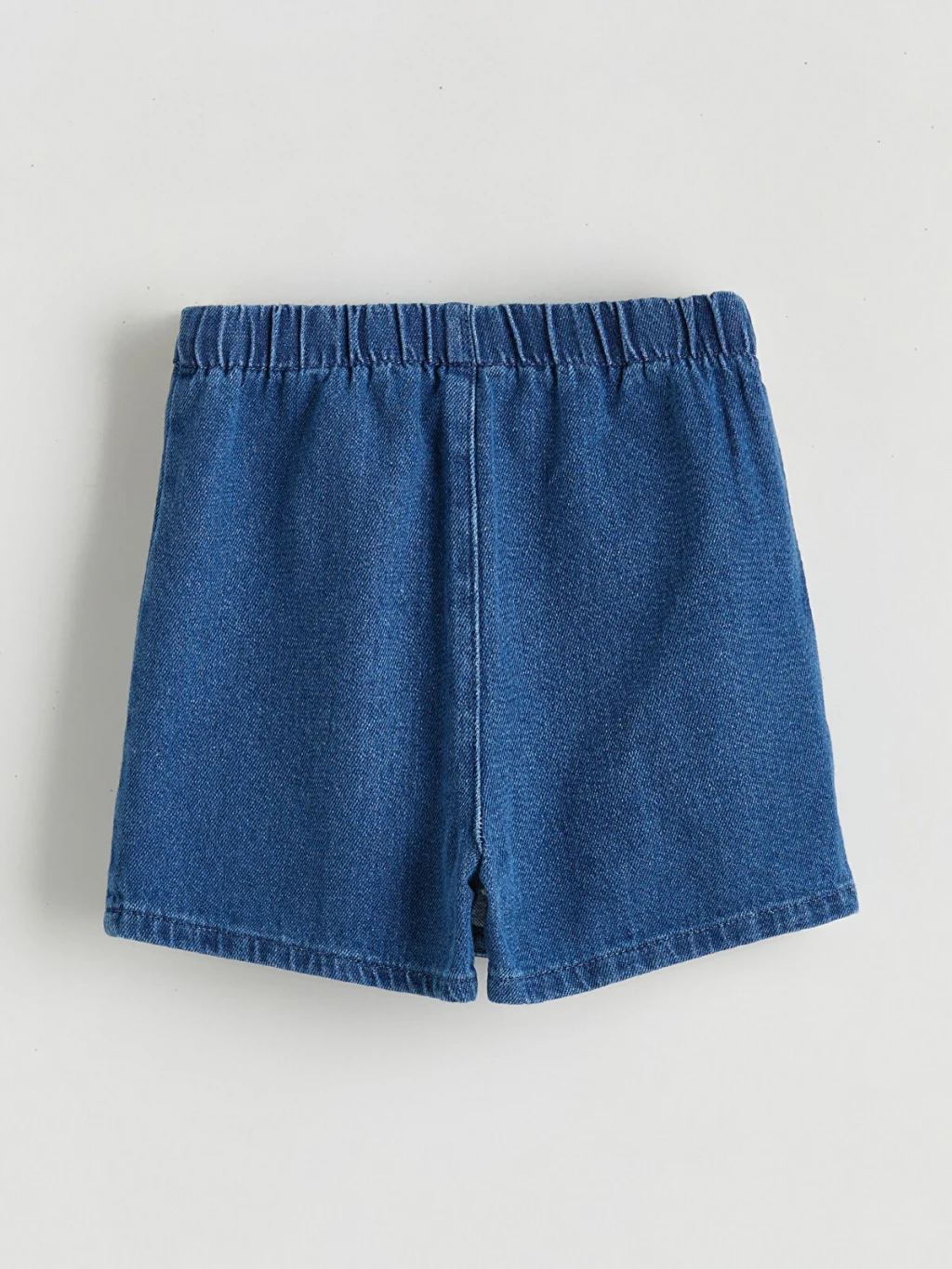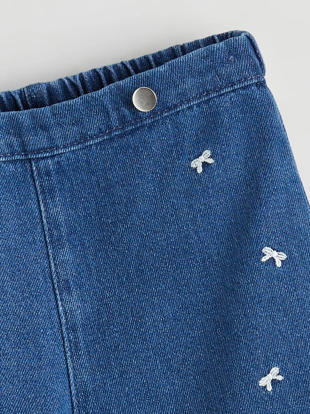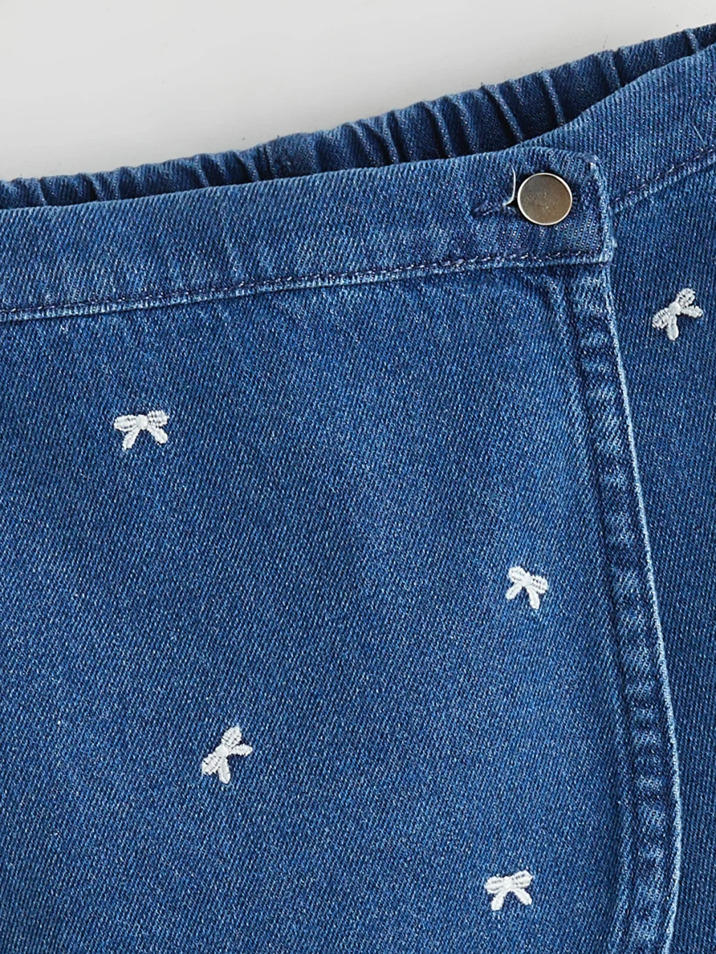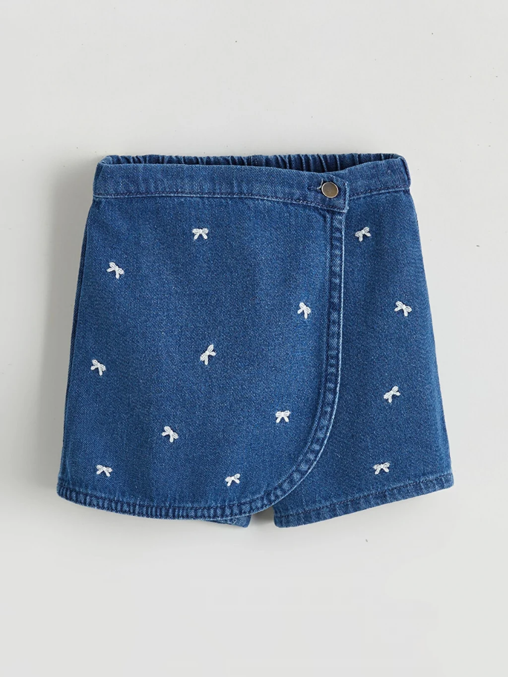 Nakışlı, beli lastikli ve anvelop kesimli kız çocuk şort etek, %100 pamuk denim görünümlü kumaştan üretilmiştir.