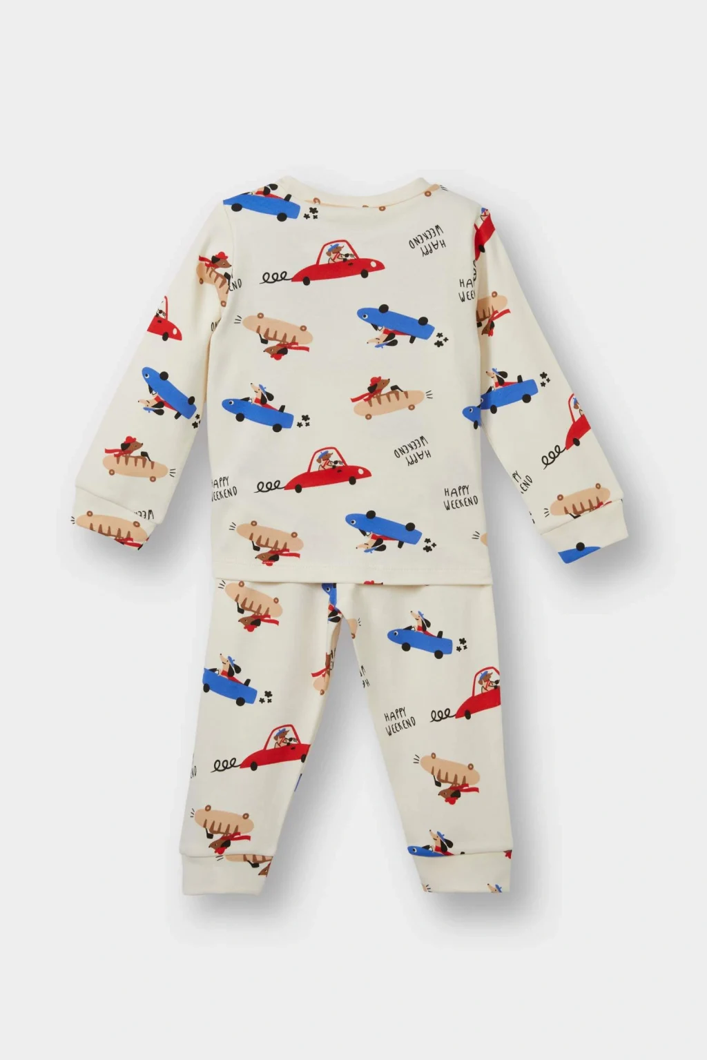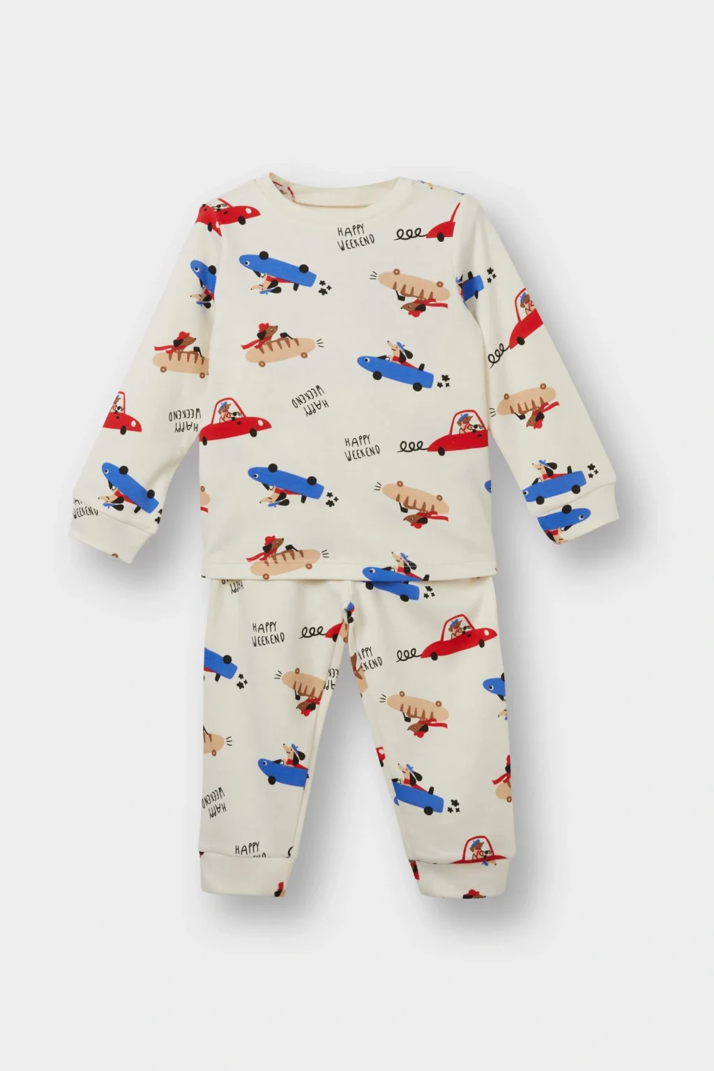 Araç baskılı uzun kollu üst ve uzun paça altından oluşan bu pijama takımı, erkek bebeklere hem eğlenceli hem de rahat bir uyku deneyimi sunar. Yumuşak kumaşıyla hassas cilde uyumludur.