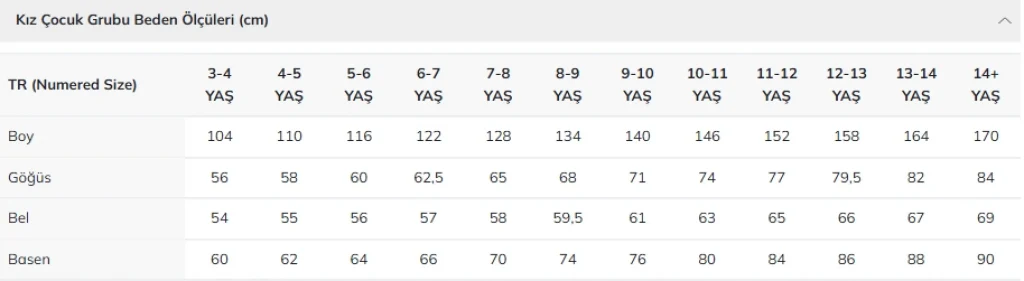 Ürün Uzunluk Ölçüleri : İç Boy: 6-9 Ay (74cm)-21 cm, İç Boy: 9-12 Ay (80cm)-24 cm, İç Boy: 12-18 Ay (86cm)-27 cm, İç Boy: 18-24 Ay (92cm)-31 cm, İç Boy: 2/3 Yaş (98cm)-35 cm, İç Boy: 3/4 Yaş (104 Cm)-39 cm, İç Boy: 4/5 Yaş (110cm)-43 cm, İç Boy: 5/6 Yaş (116cm)-45 cm