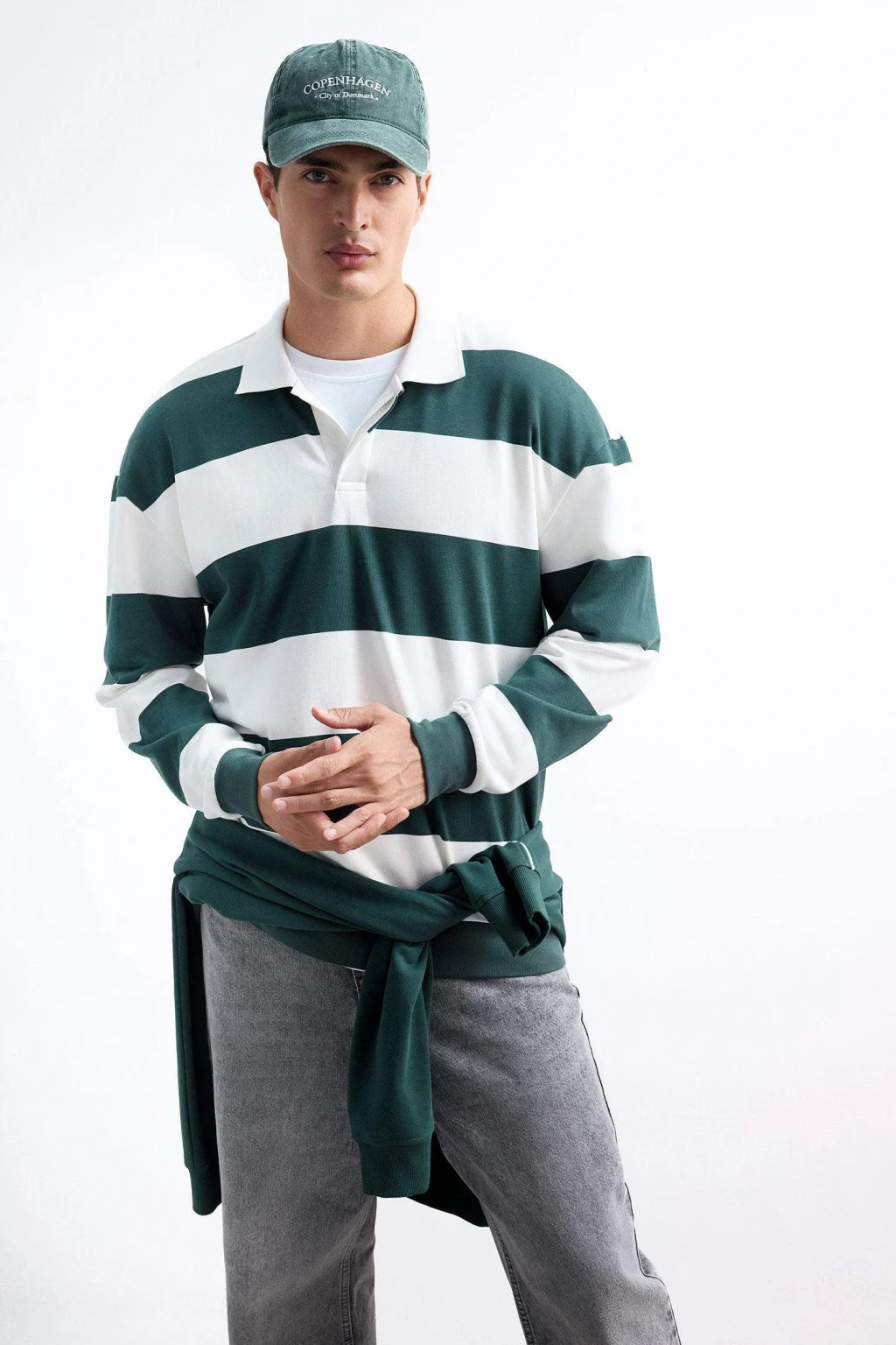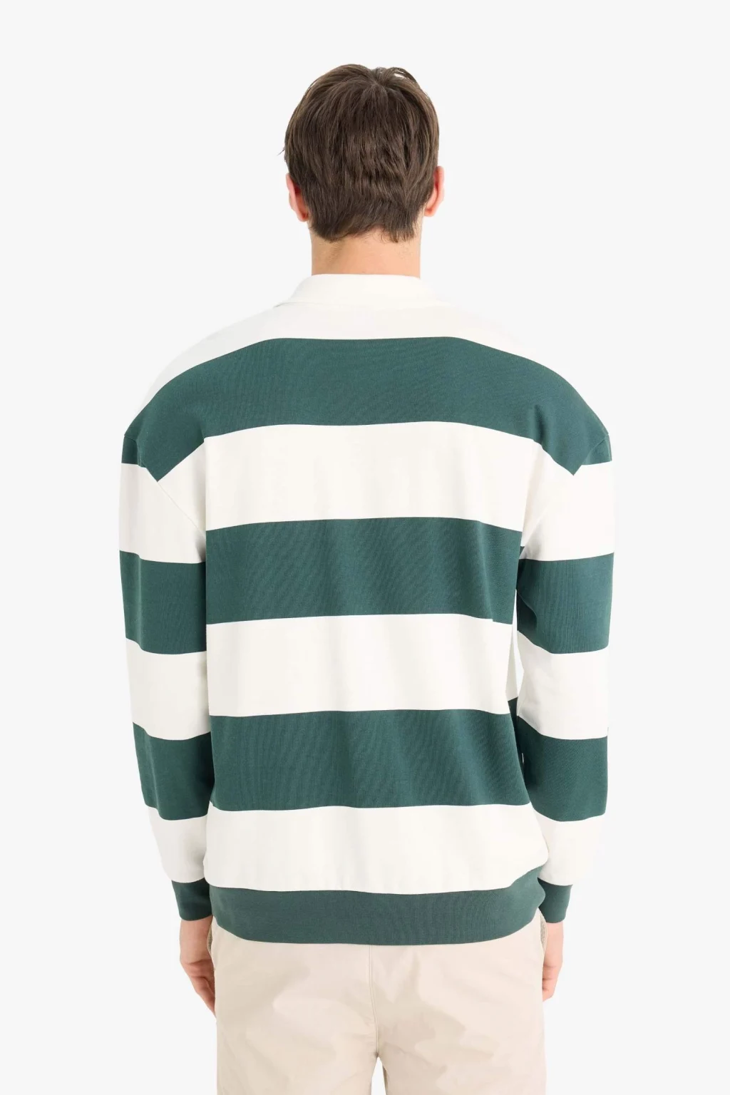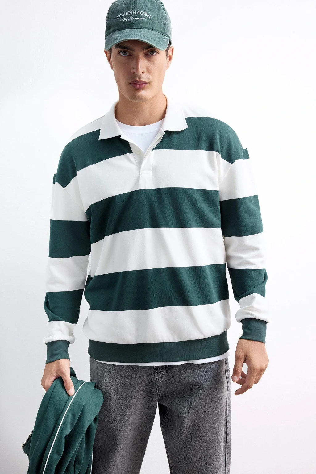 Boxy fit kesimiyle modern bir duruş sergileyen polo yaka çizgili sweatshirt, rahatlığı ve şıklığı bir arada sunar. Yumuşak dokusu ve dikkat çekici çizgili deseniyle günlük stilin vazgeçilmez parçası olmaya aday.