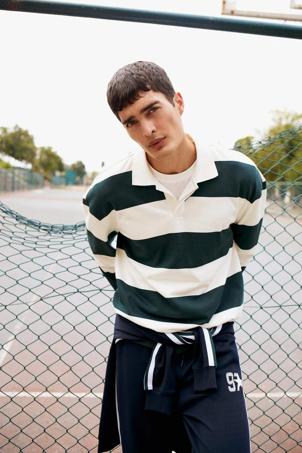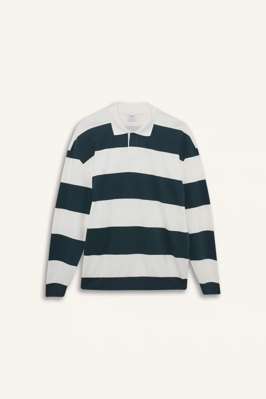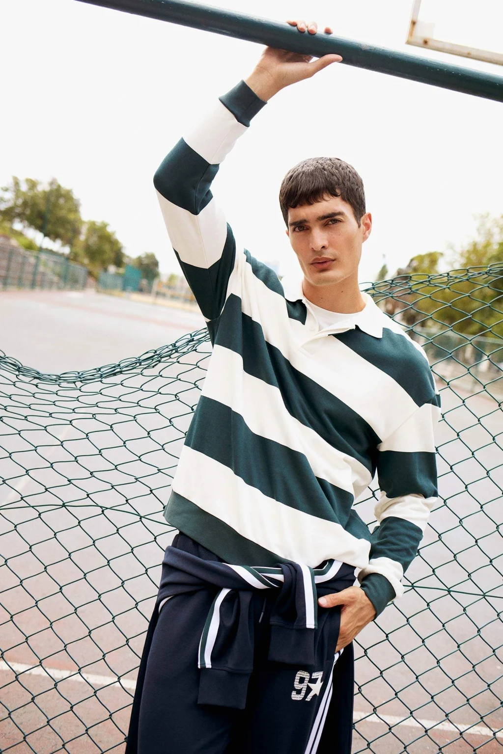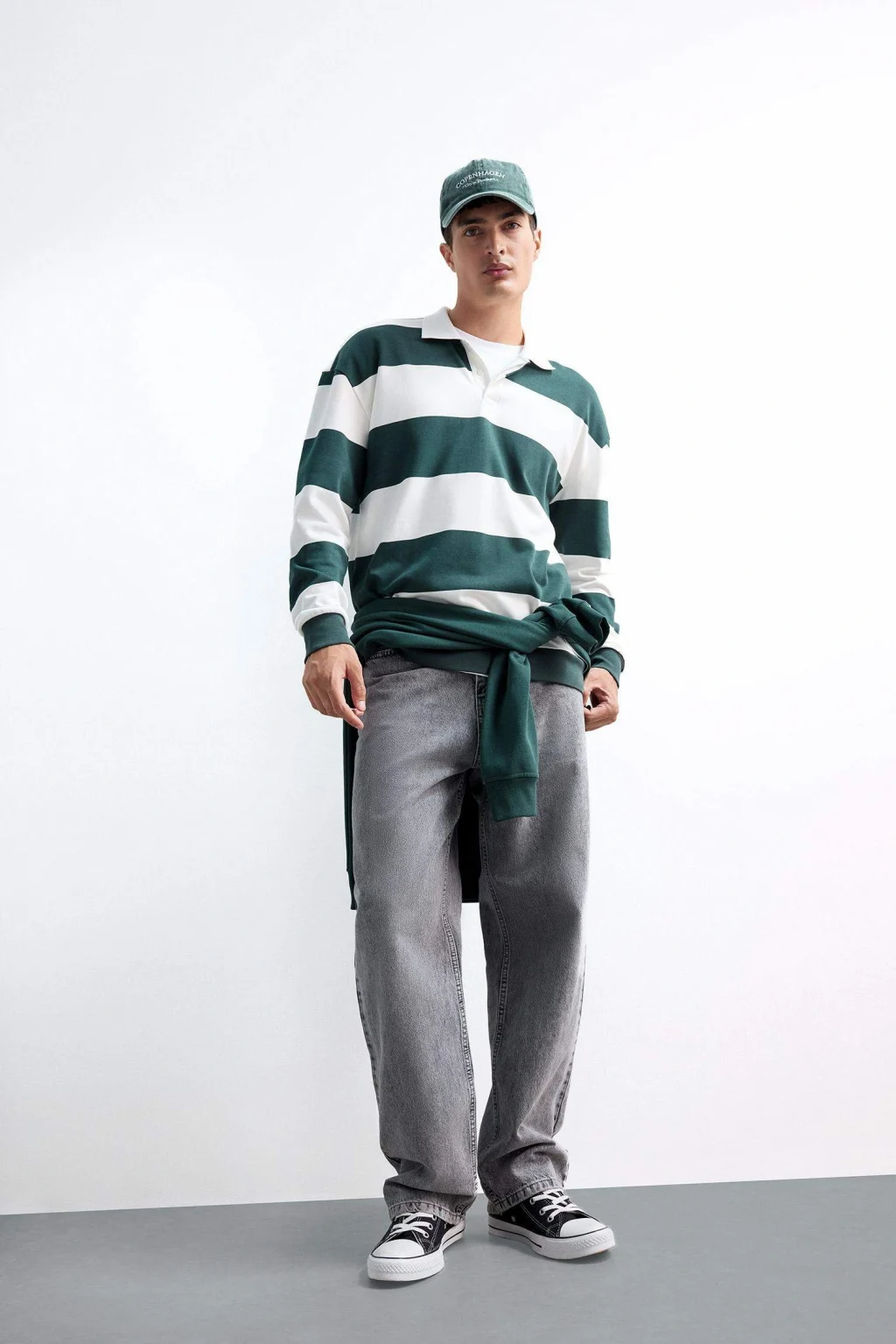 Boxy fit kesimiyle modern bir duruş sergileyen polo yaka çizgili sweatshirt, rahatlığı ve şıklığı bir arada sunar. Yumuşak dokusu ve dikkat çekici çizgili deseniyle günlük stilin vazgeçilmez parçası olmaya aday.