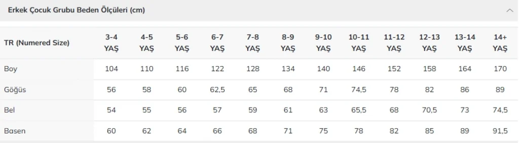 Ürün Uzunluk Ölçüleri : İç Boy: 5/6 Yaş (116cm)-47 cm, İç Boy: 7/8 Yaş (128cm)-54 cm, İç Boy: 8/9 Yaş (134cm)-57 cm, İç Boy: 9/10 Yaş (140cm)-60 cm, İç Boy: 11/12 Yaş (152cm)-65 cm, İç Boy: 13/14 Yaş (164cm)-70 cm