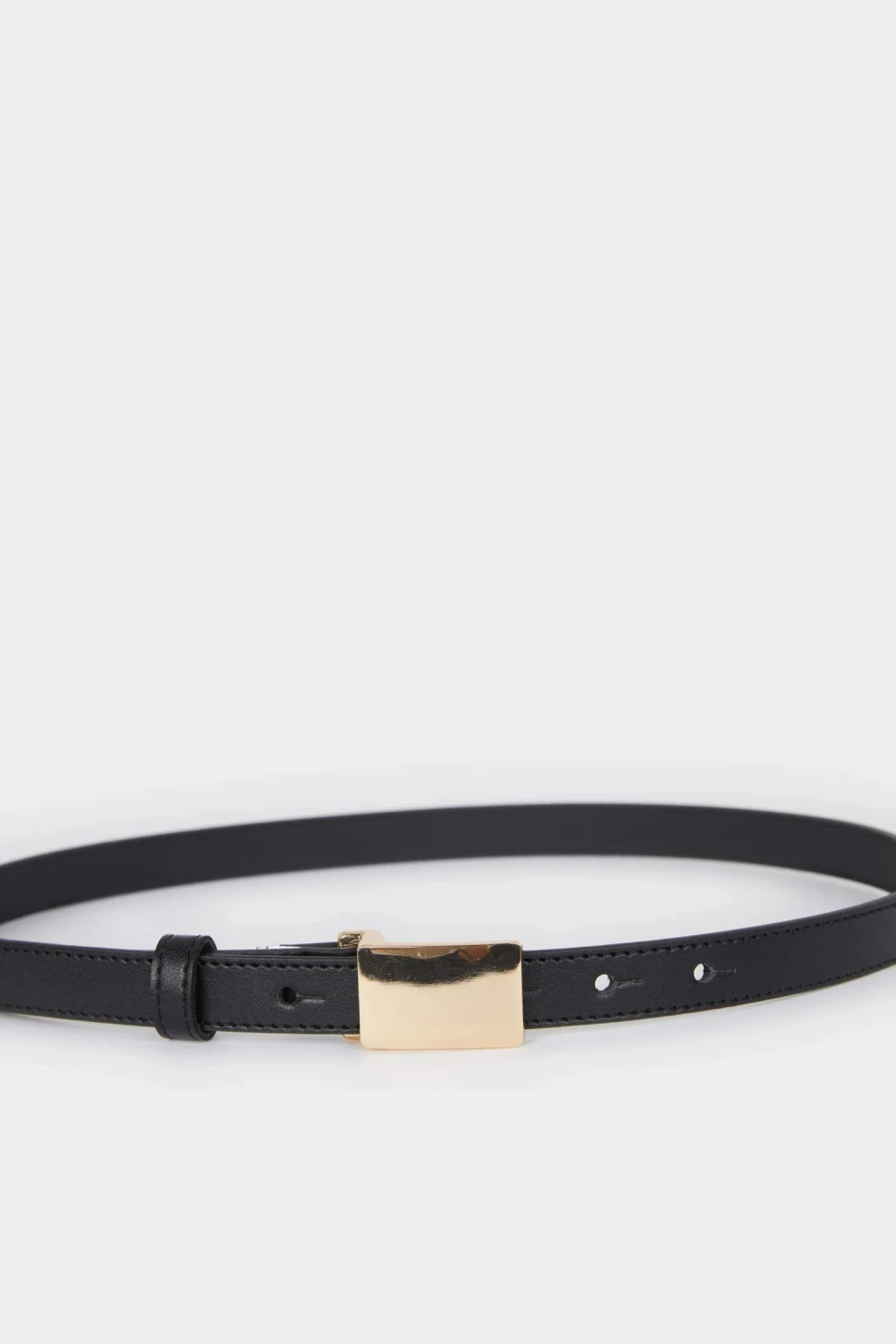 Yetişkinler için siyah suni deri kemer. Günlük kullanım için uygun, 2 cm genişliğinde. Orta tokalı, kadın koleksiyonu için ideal. Tüm sezon boyunca stilinizi tamamlayacak temel bir parça.