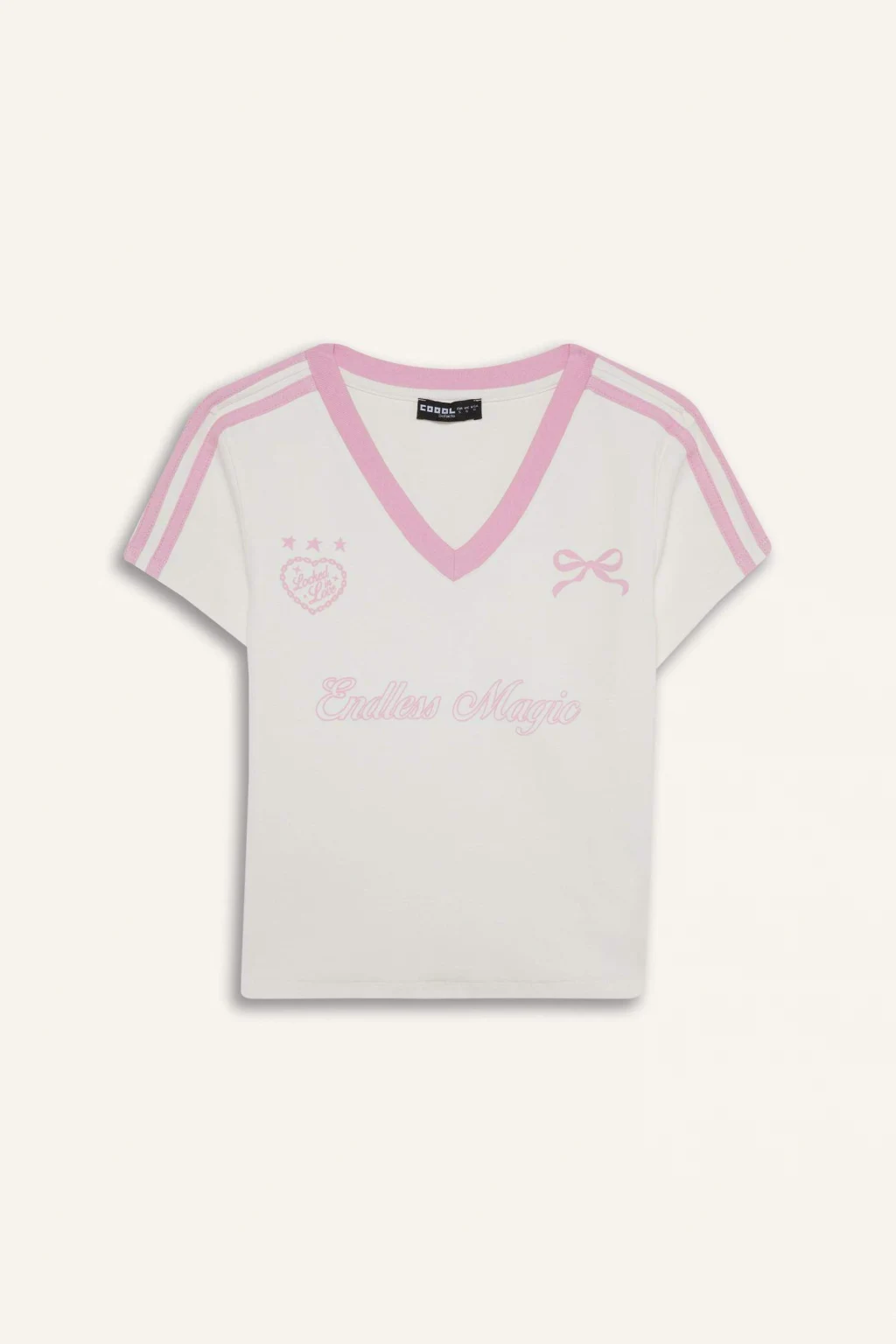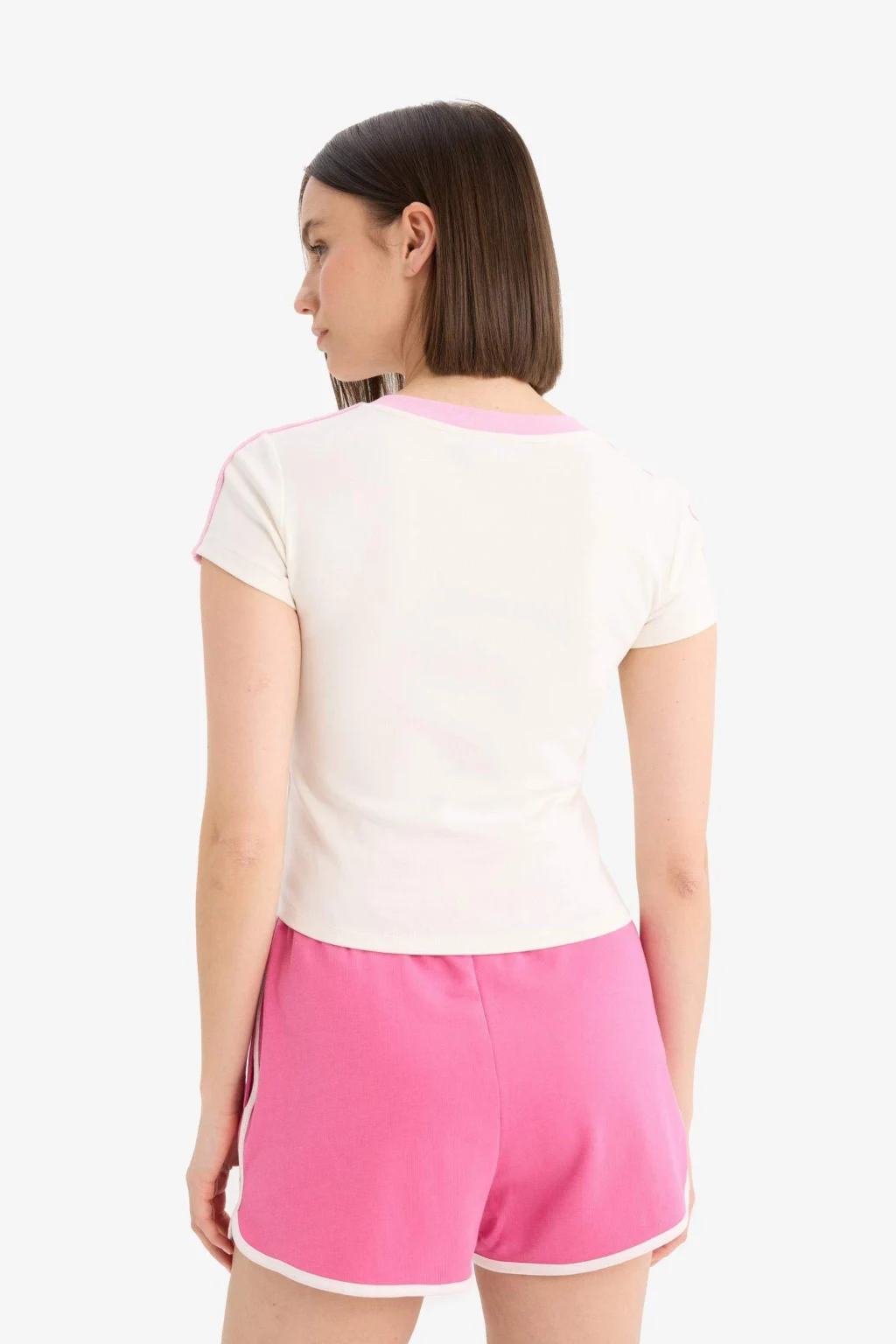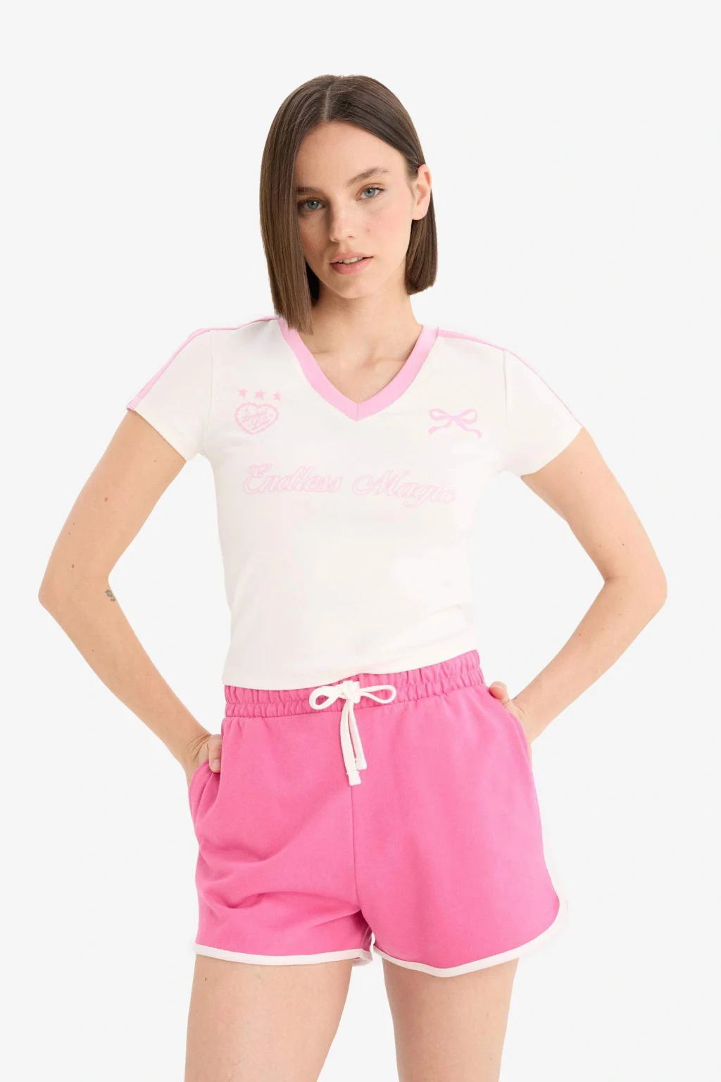 Coool markasından Yetişkin kadınlar için örme crop kısa kollu tişört. Beyaz ribana kumaştan üretilmiş, spor tema baskılı. V yaka ve fitted kalıba sahip.