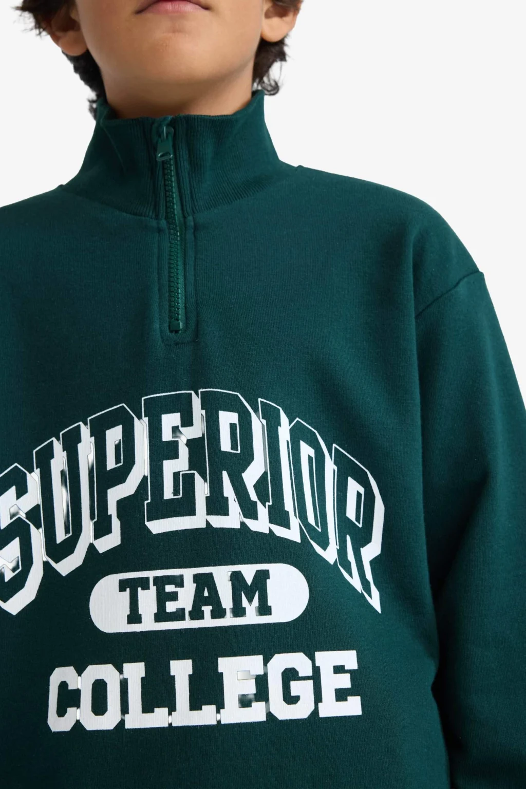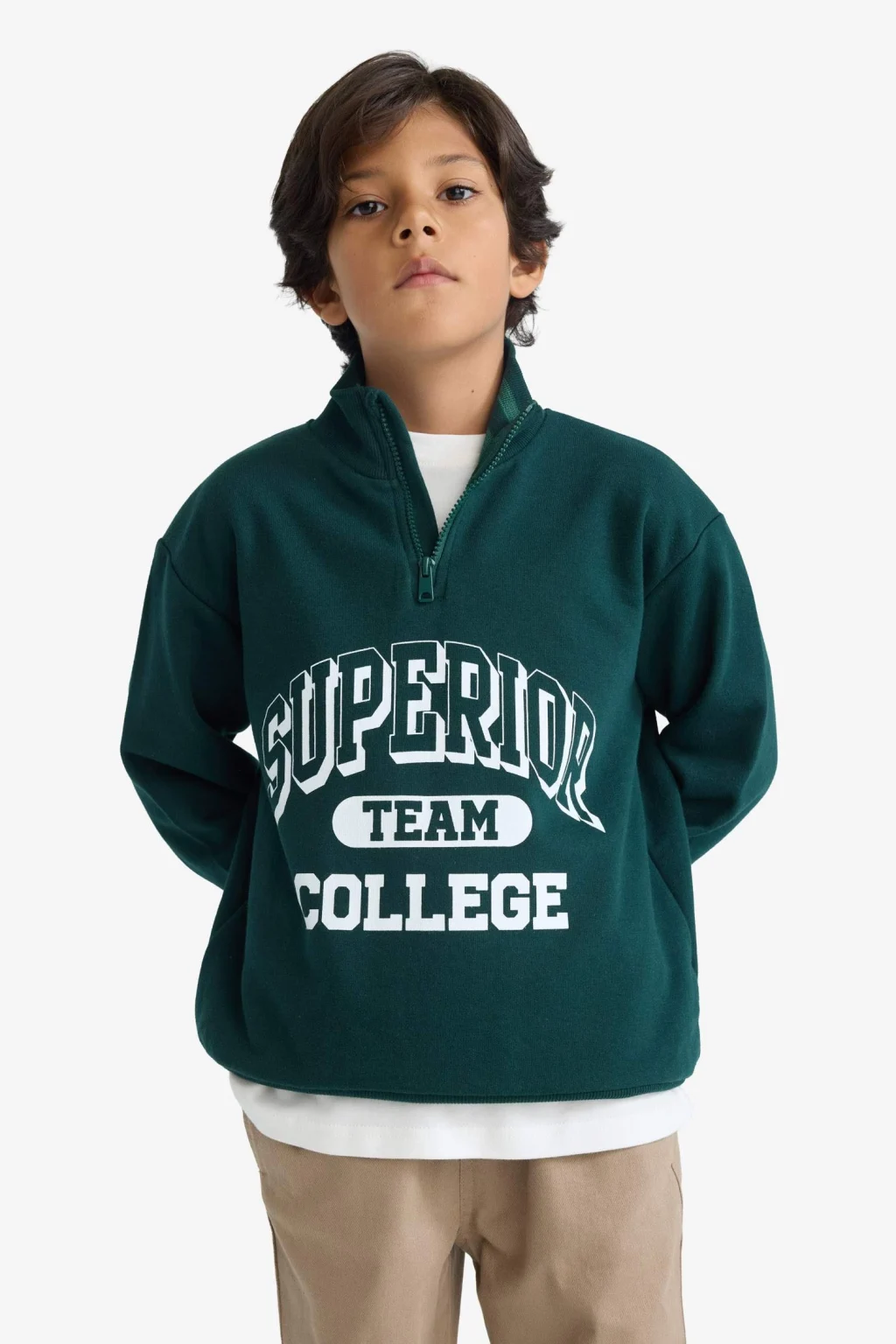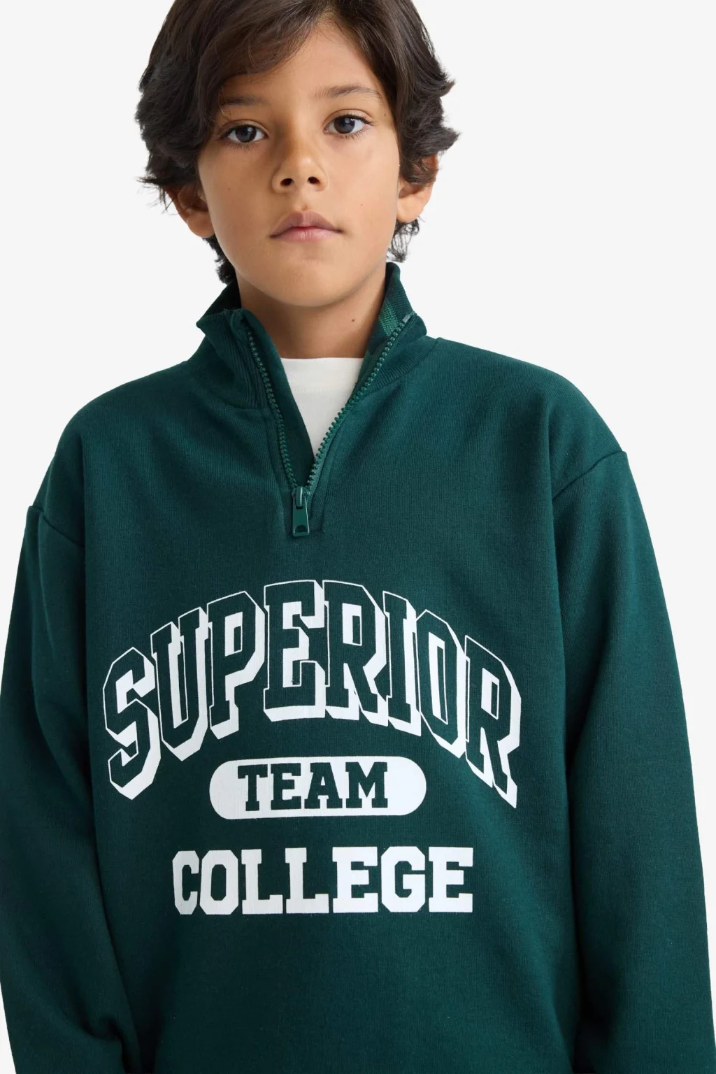 Dik yaka ve fermuar detayıyla modern bir stil sunan erkek çocuk sweatshirtü, hareket özgürlüğü sağlar. Baskılı tasarımıyla dikkat çeken bu parça, günlük kullanıma uygundur.