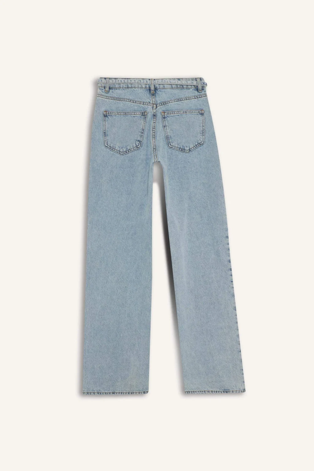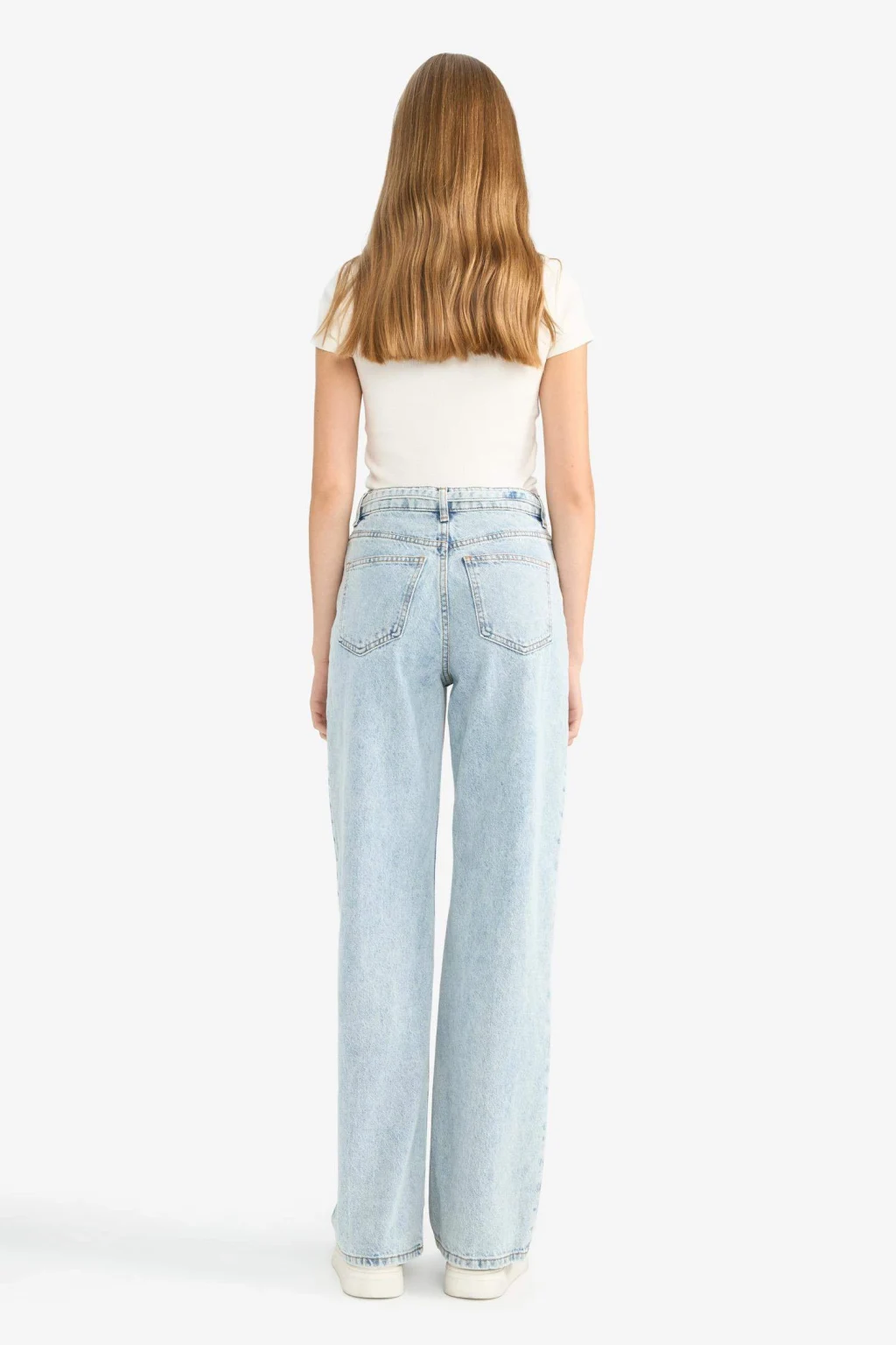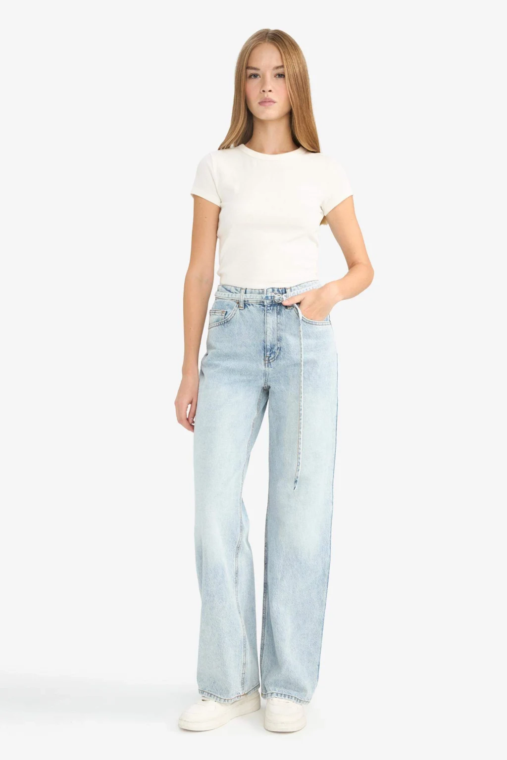 Yüksek bel ve straight wide kesimiyle bu düz paça uzun jean pantolon, modern ve rahat bir siluet sunar. Yıkamalı denim dokusuyla günlük kombinlere cool bir hava katar.