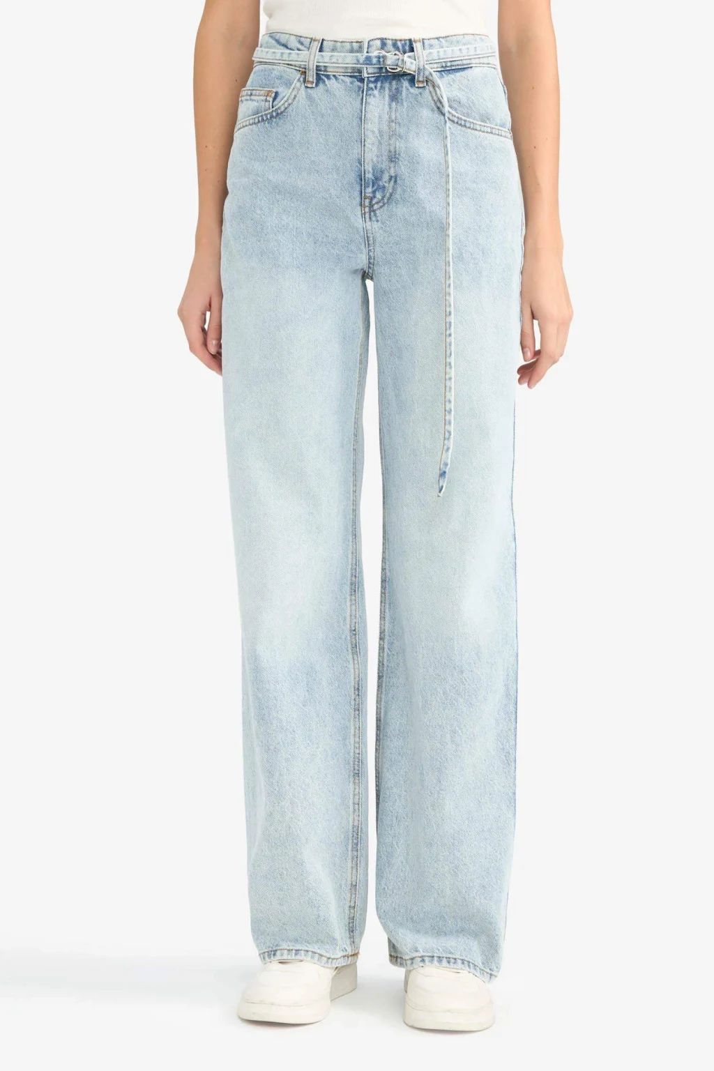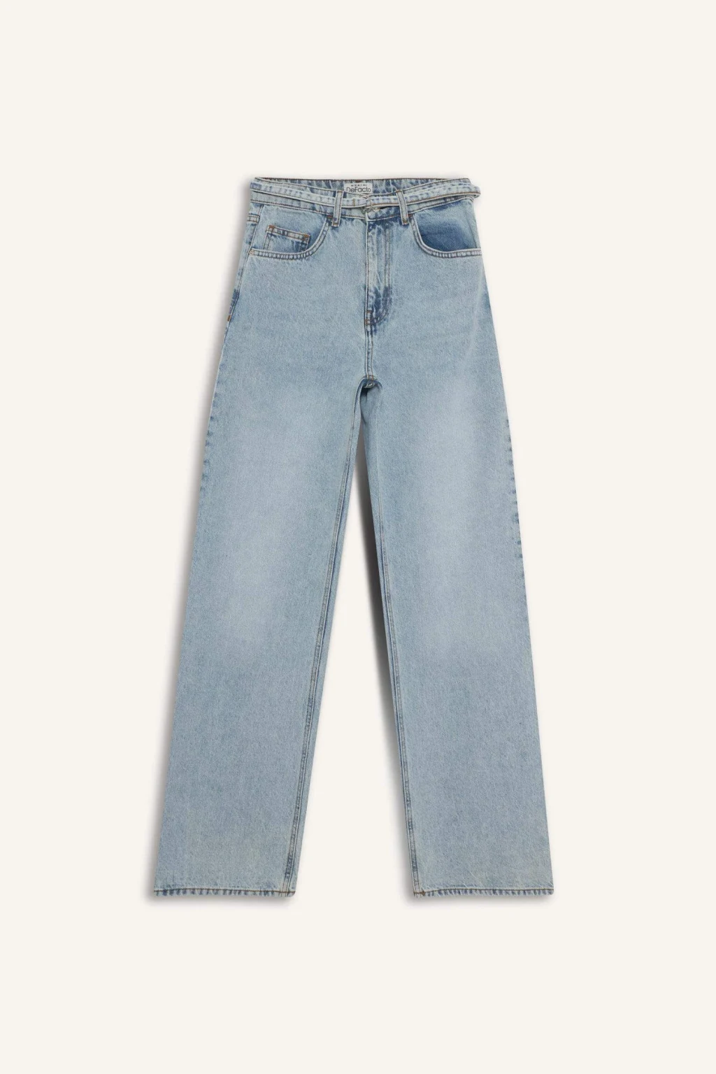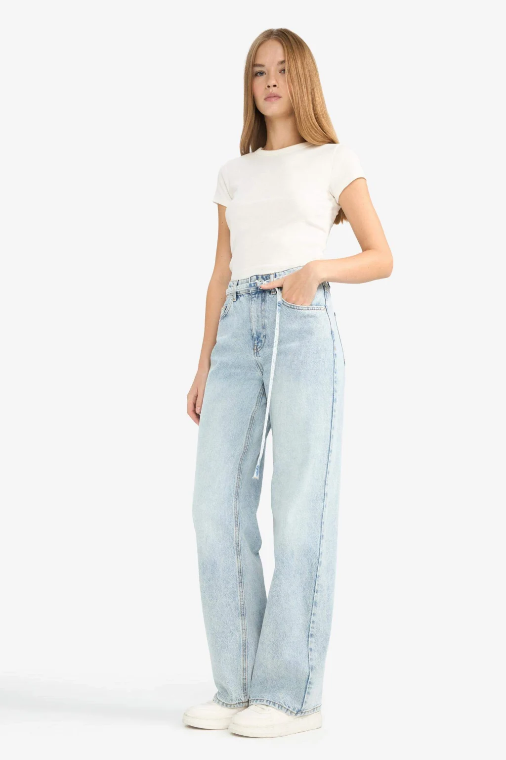 Yüksek bel ve straight wide kesimiyle bu düz paça uzun jean pantolon, modern ve rahat bir siluet sunar. Yıkamalı denim dokusuyla günlük kombinlere cool bir hava katar.