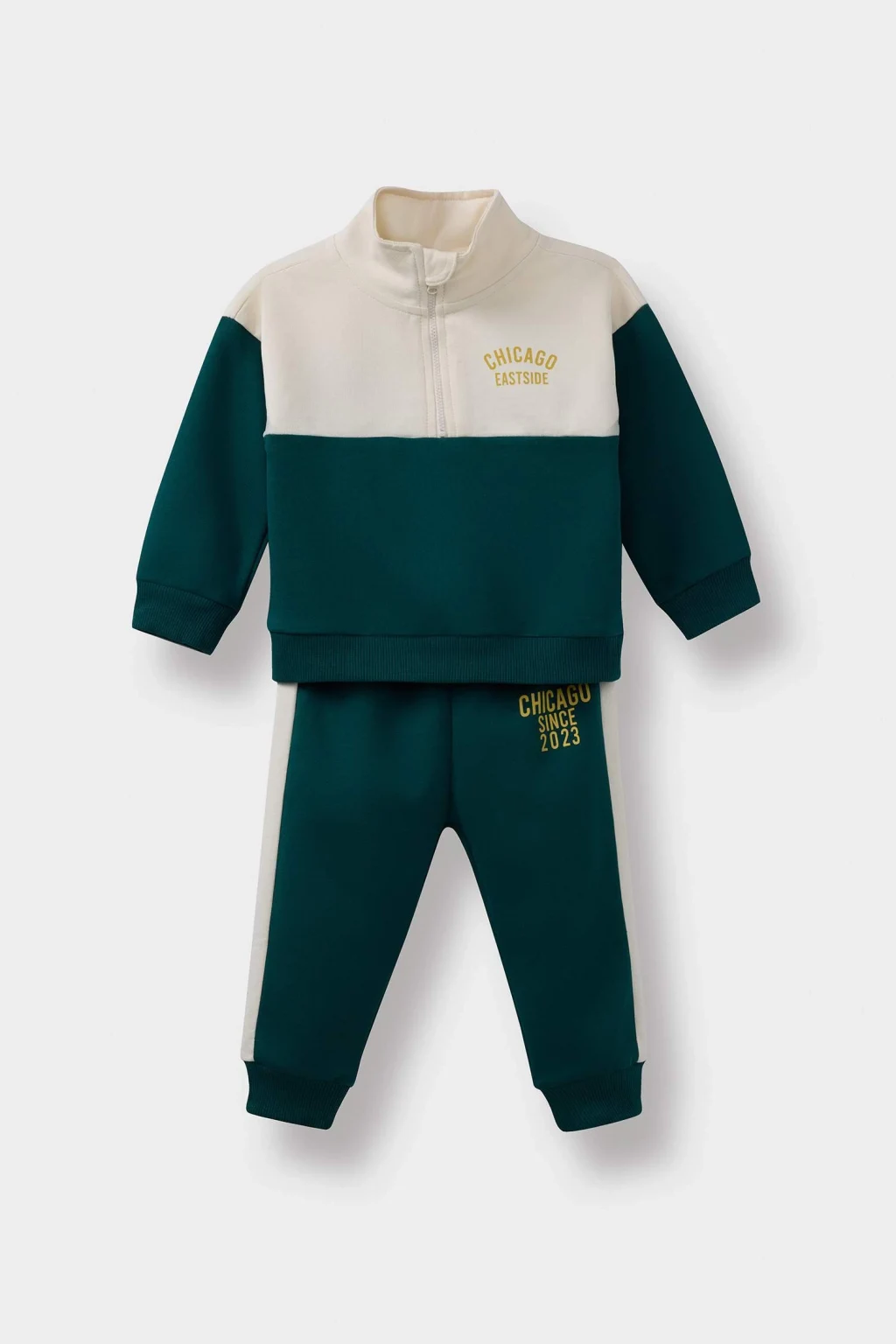 Erkek bebekler için tasarlanmış 2'li takım, baskılı fermuarlı sweatshirt ve eşofman altından oluşur. Yumuşak kumaşı ve rahat kesimiyle miniklerin hareket özgürlüğünü destekler.