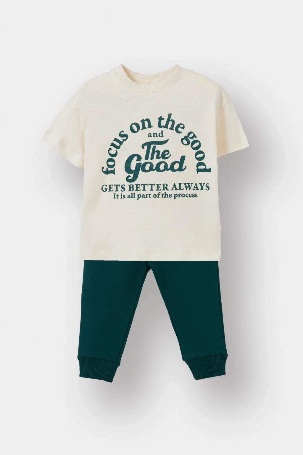 Erkek Bebek 2'li Takım, baskılı kısa kollu tişört ve rahat eşofman altından oluşur. Yumuşak kumaşı ve pratik tasarımıyla miniklerin hareket özgürlüğünü kısıtlamaz, aynı zamanda şık ve rahat bir görünüm sunar. Hem oyun saatleri hem de günlük kullanım için mükemmel bir seçenek!