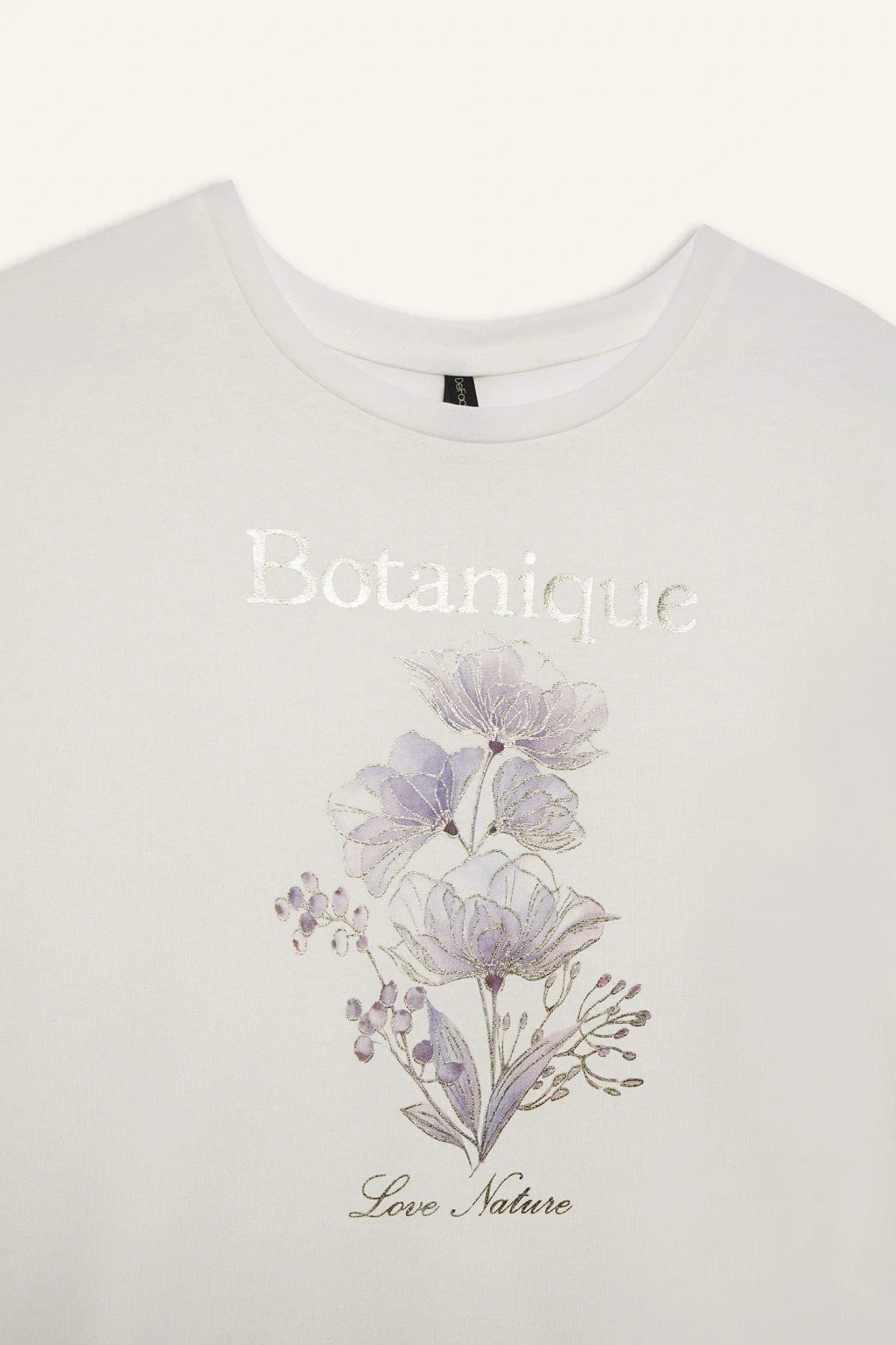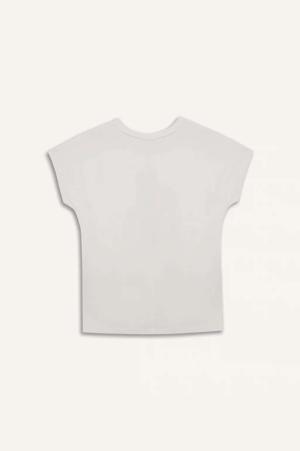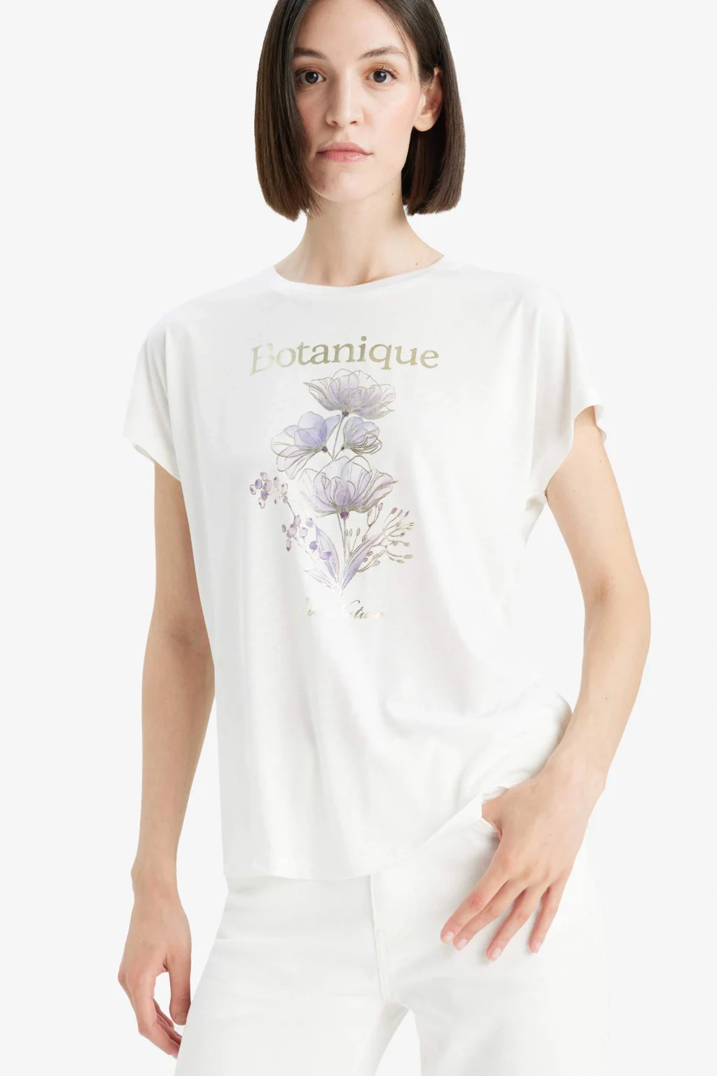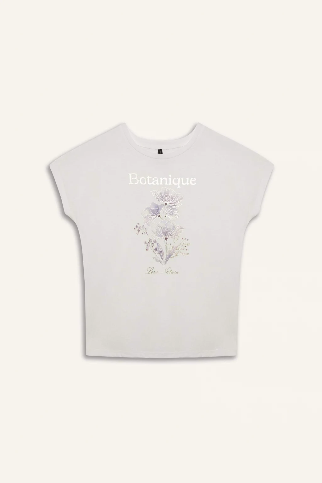 Yetişkin kadınlar için ilkbahar/yaz sezonunda giyilebilecek örme baskılı ekru çiçekli kısa kollu tişört. Yarasa kol detayı ve bisiklet yaka ile günlük şıklığına renk katacak bir parça.