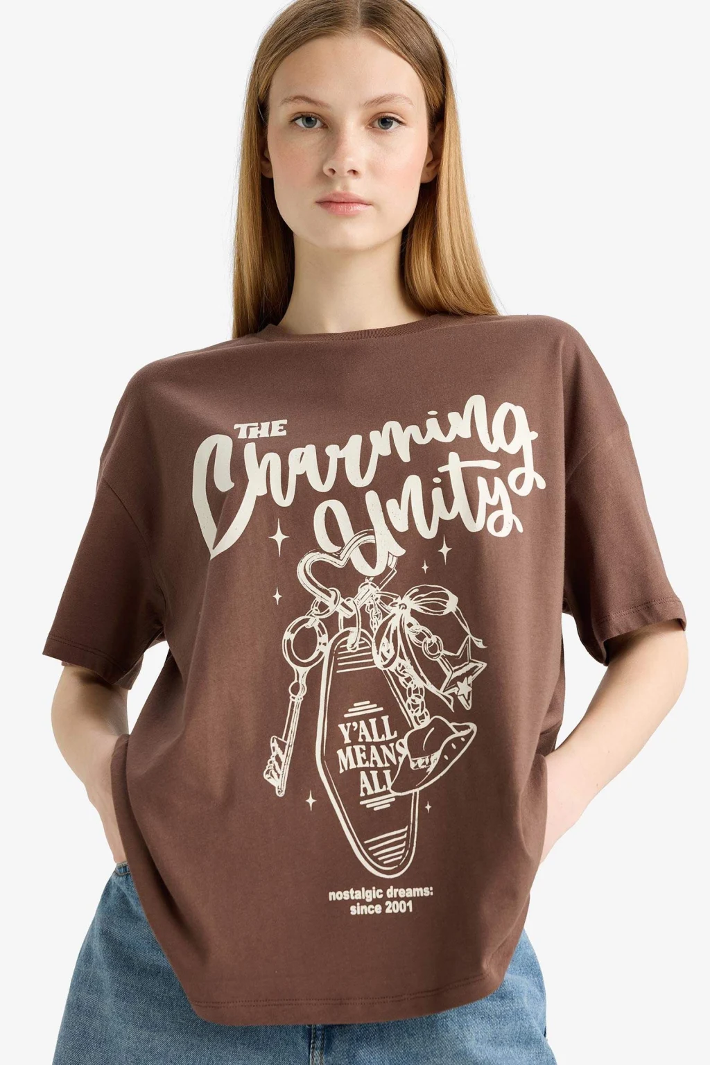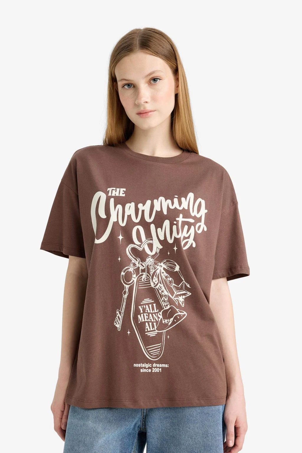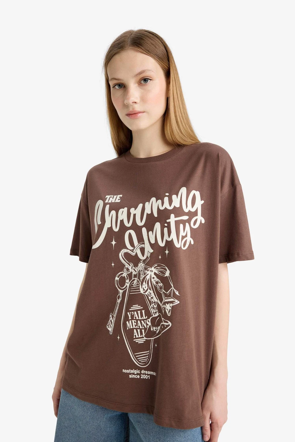 Coool markasının kadınları için oversize geniş kalıplı kahve renkli baskılı kısa kollu tişört. Eğlence temalı deseniyle sürdürülebilir malzemeden üretilmiştir. İlkbahar/Yaz sezonu için ideal bir seçim.