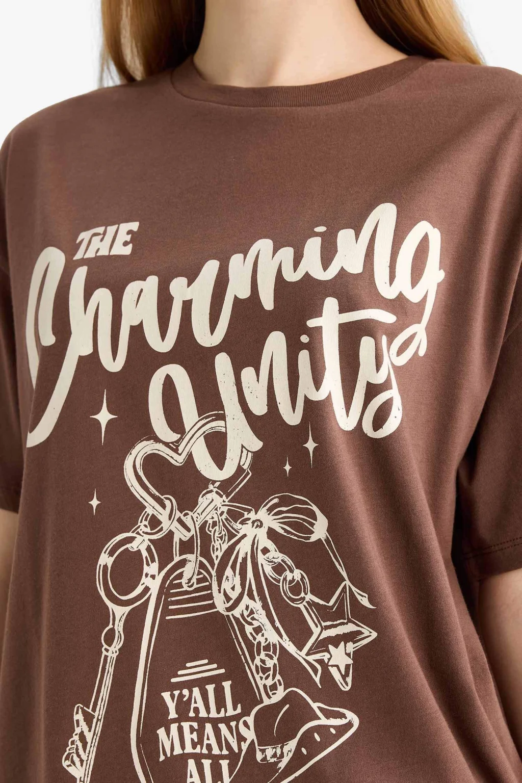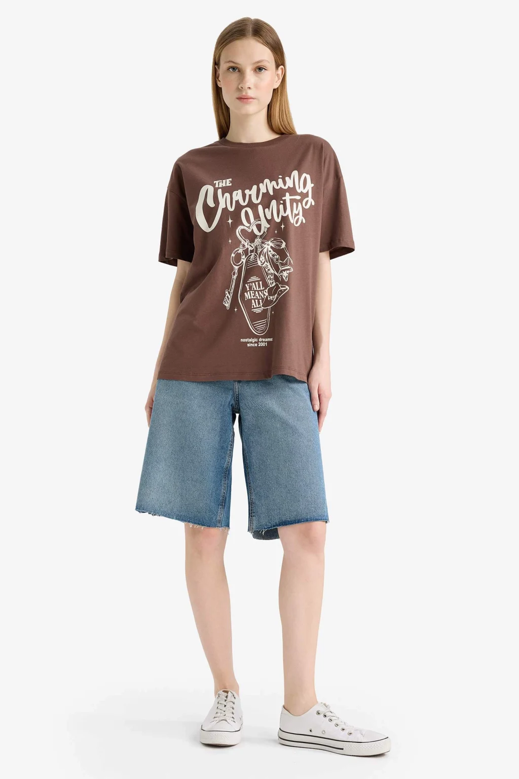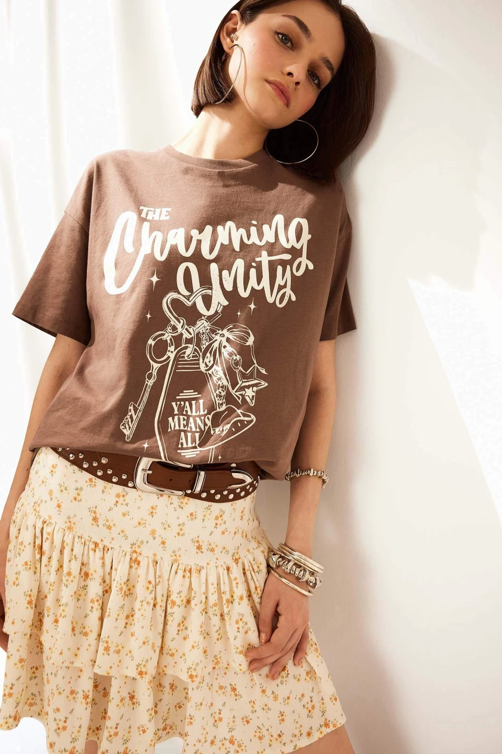 Coool markasının kadınları için oversize geniş kalıplı kahve renkli baskılı kısa kollu tişört. Eğlence temalı deseniyle sürdürülebilir malzemeden üretilmiştir. İlkbahar/Yaz sezonu için ideal bir seçim.