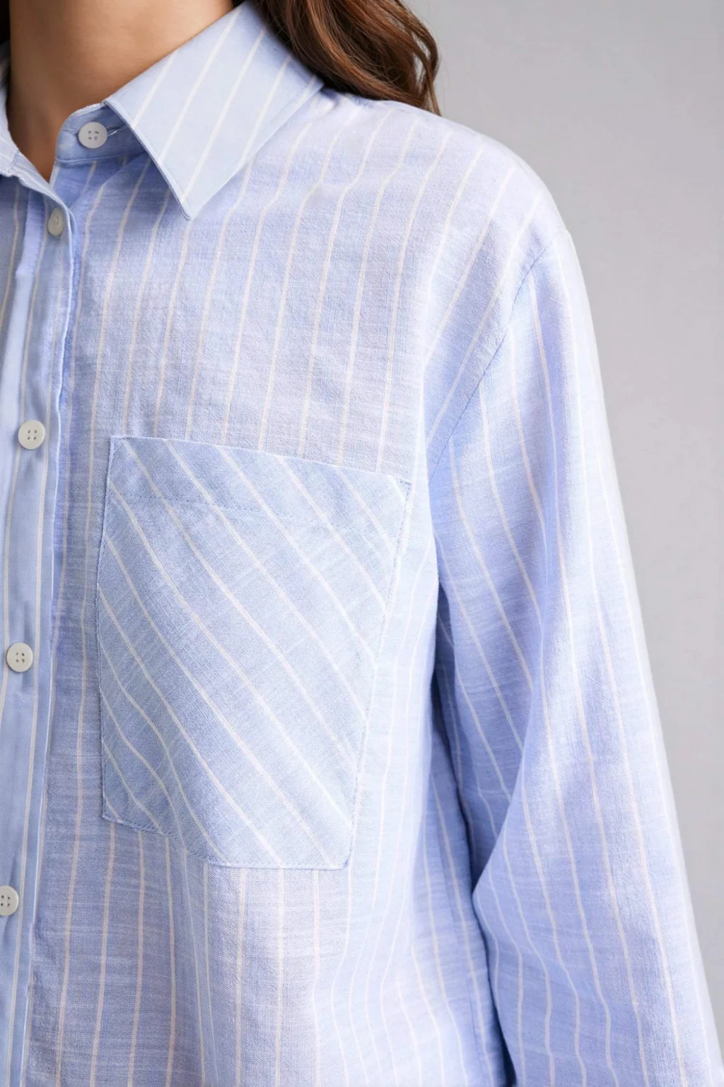 Defacto G9800AXBG807 Bej Oversıze Çizgili Akışkan Kumaş Gömlek