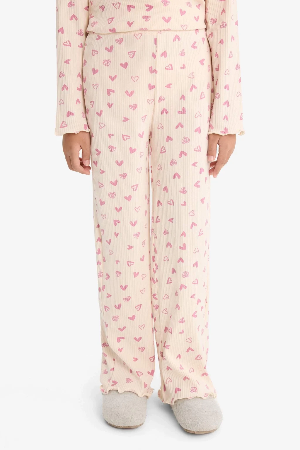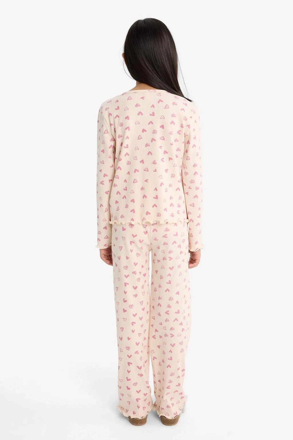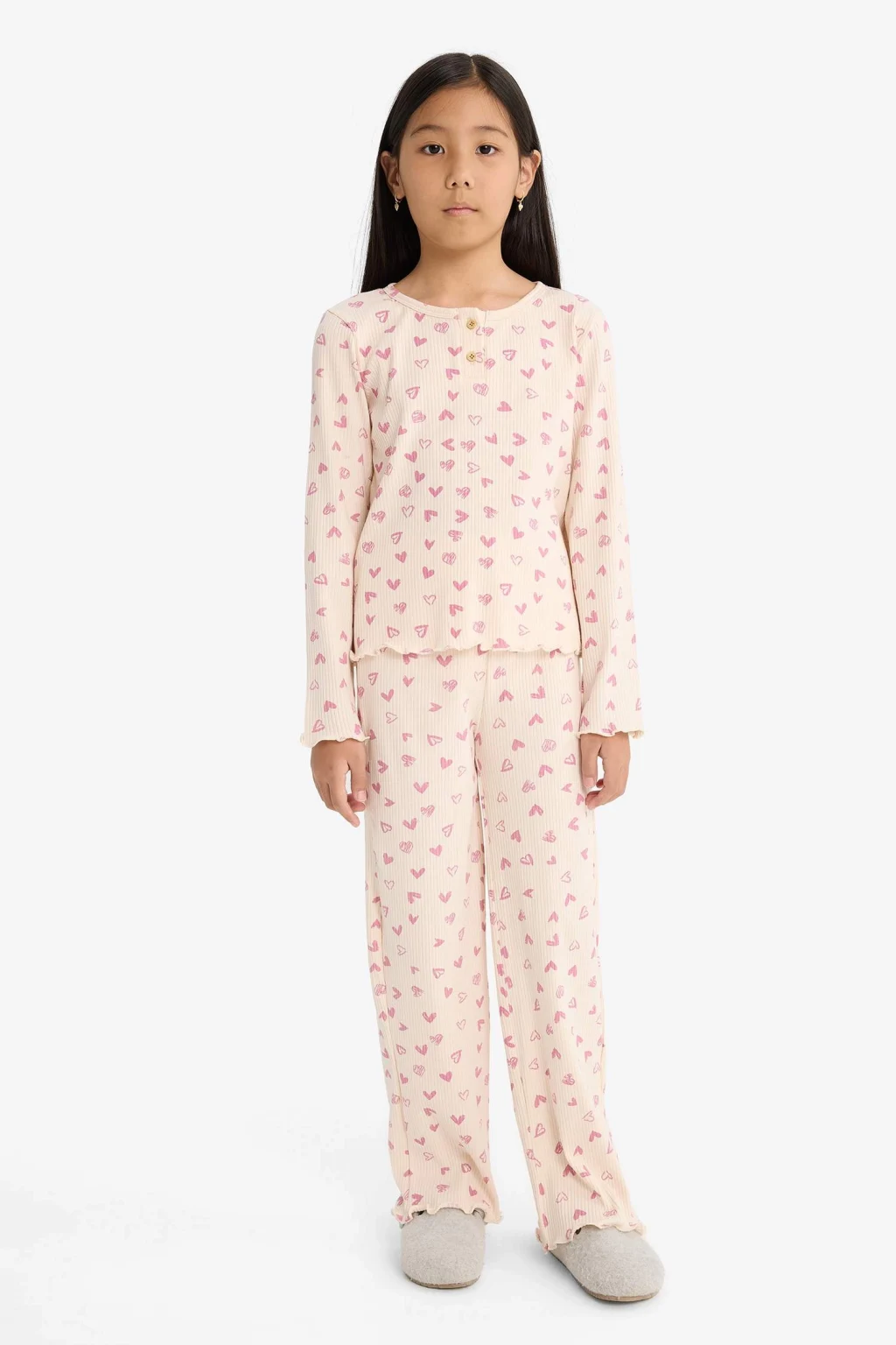 Kız çocuklar için fitilli kaşkorse kumaştan kalp desenli uzun kollu üst ve uzun alt pijama takımı, yumuşak yapısıyla rahat bir uyku deneyimi sunar. Sevimli detaylarıyla çocukların favorisi olacak konforlu bir seçenektir.