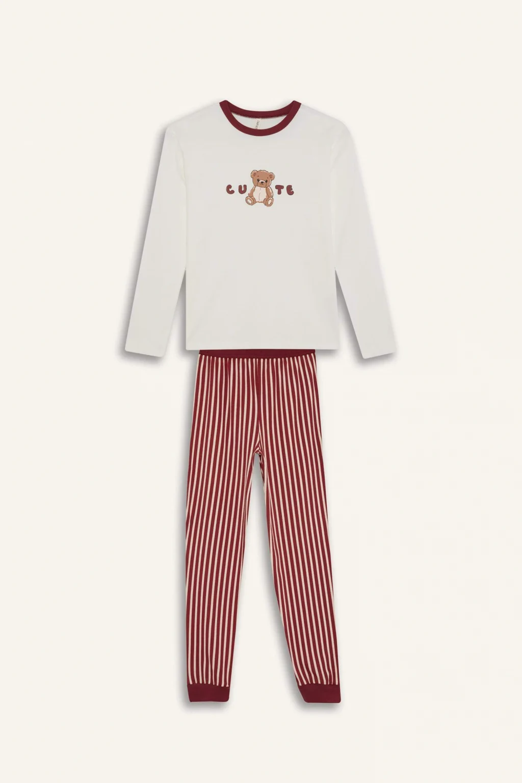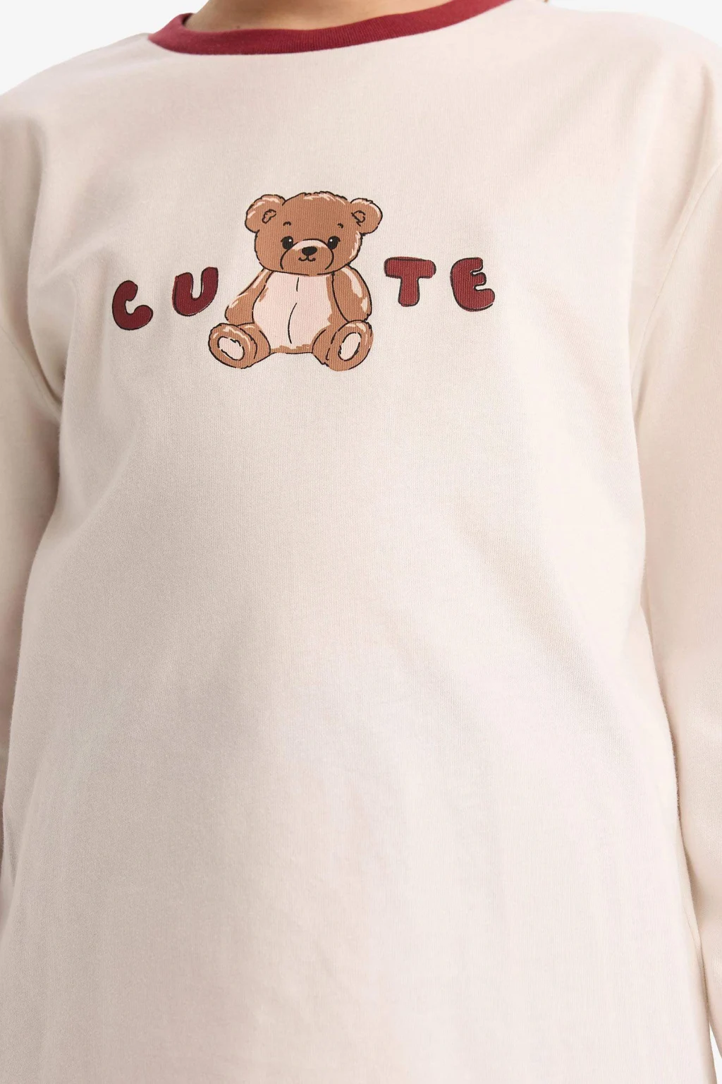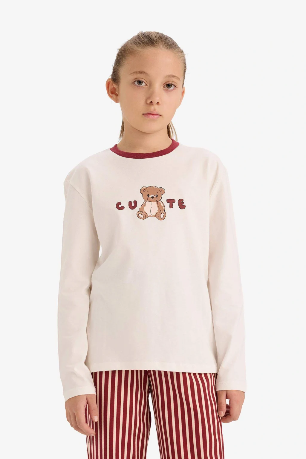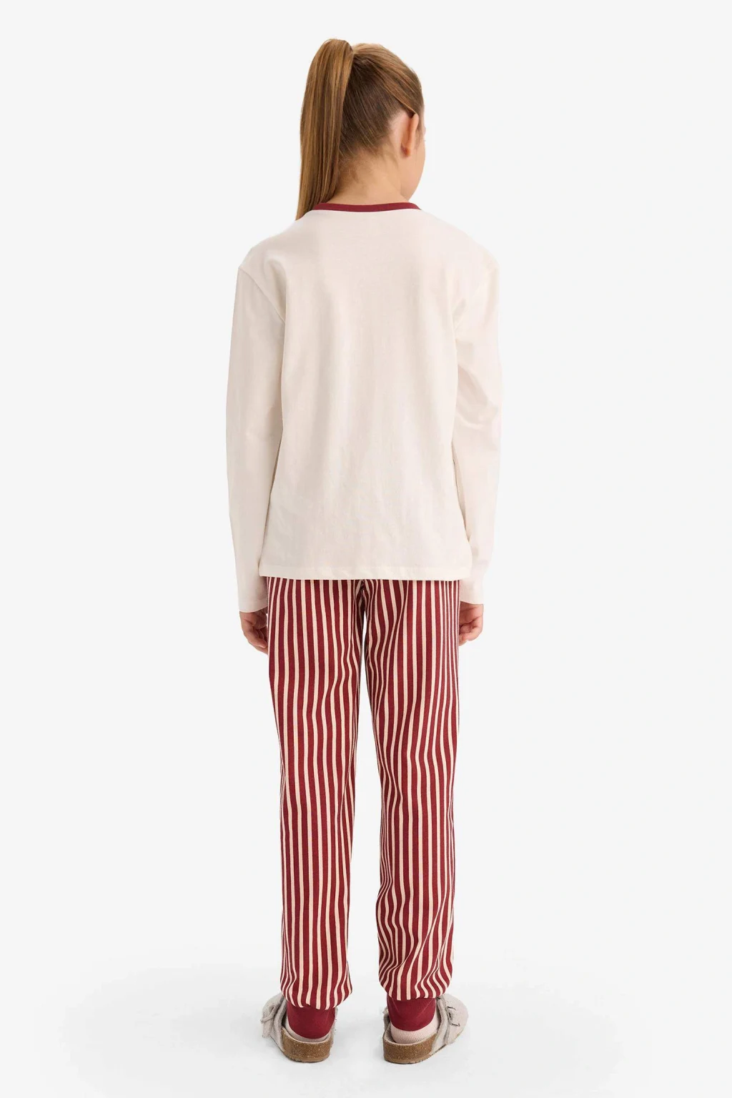 Kız Çocuk Pijama Takımı, baskılı uzun kollu üstü ve çizgili uzun altıyla hem sevimli hem de rahat bir uyku deneyimi sunar. Yumuşak kumaşı sayesinde gece boyu konfor sağlar.