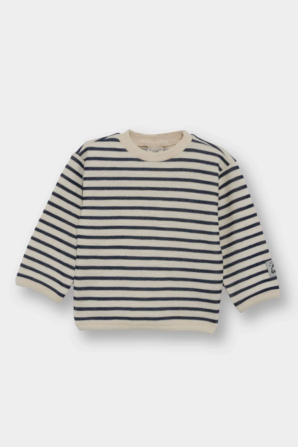 Erkek bebekler için tasarlanmış bisiklet yaka çizgili sweatshirt, yumuşak kumaşıyla gün boyu konfor sunar. Şık ve sade çizgili deseniyle her kombine kolayca uyum sağlar.