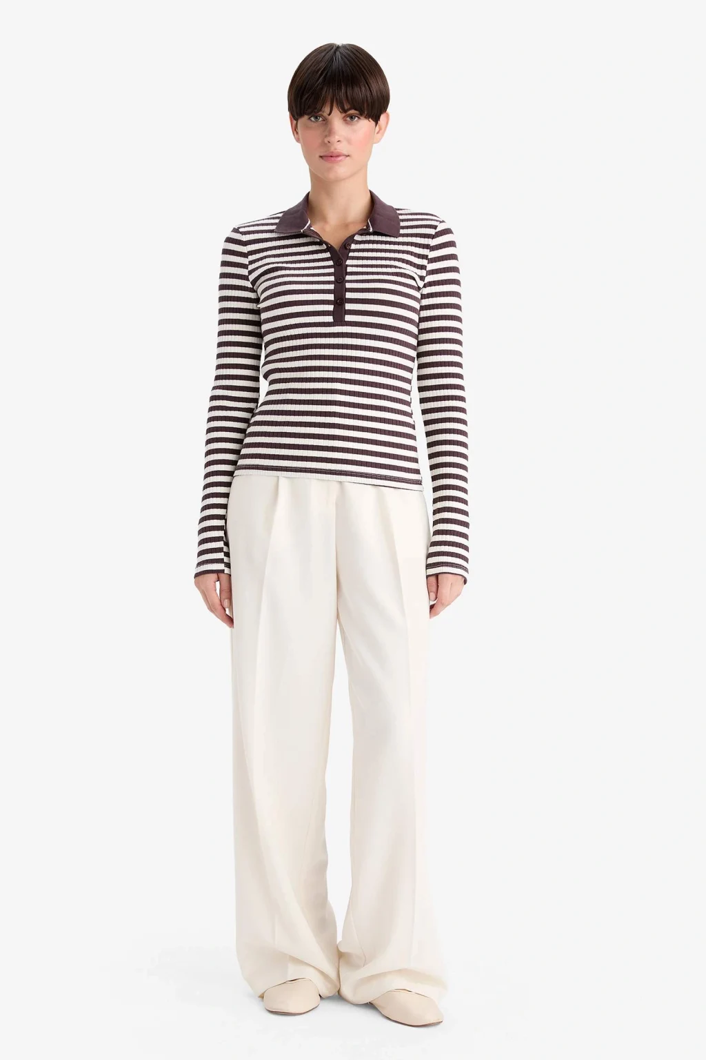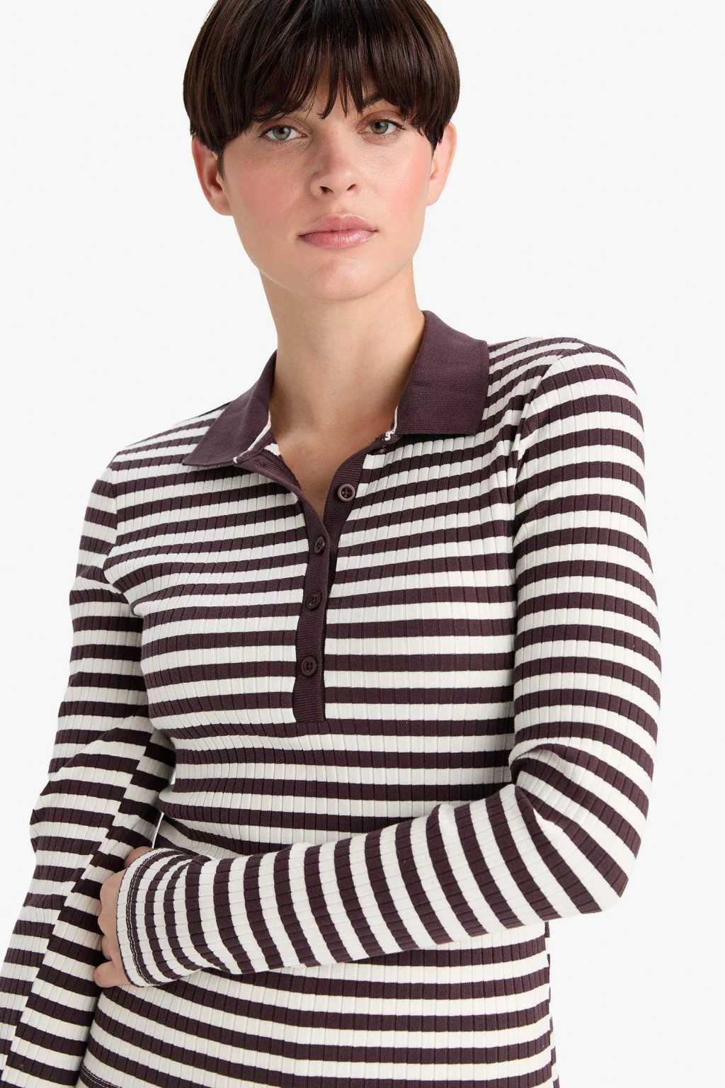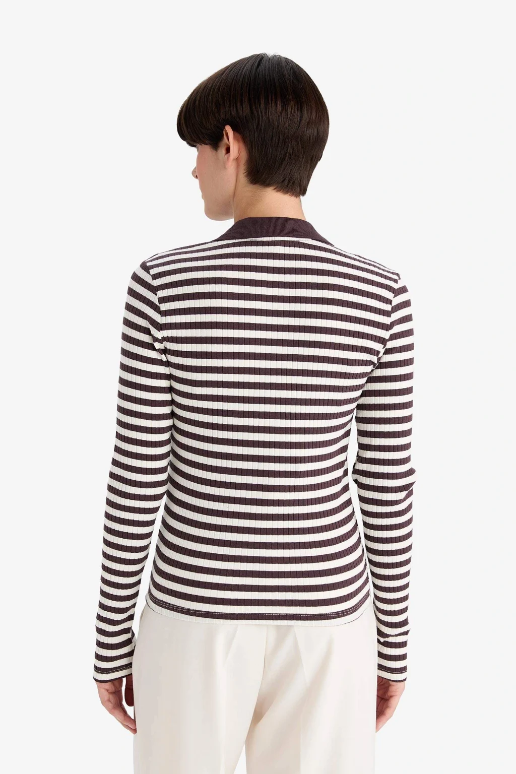 Slim fit dar kesimi ve polo yakasıyla bu çizgili fitilli kaşkorse uzun kollu tişört, şık ve modern bir tarz sunar. Esnek yapısı ve nefes alabilen kumaşı sayesinde gün boyu konfor sağlar.