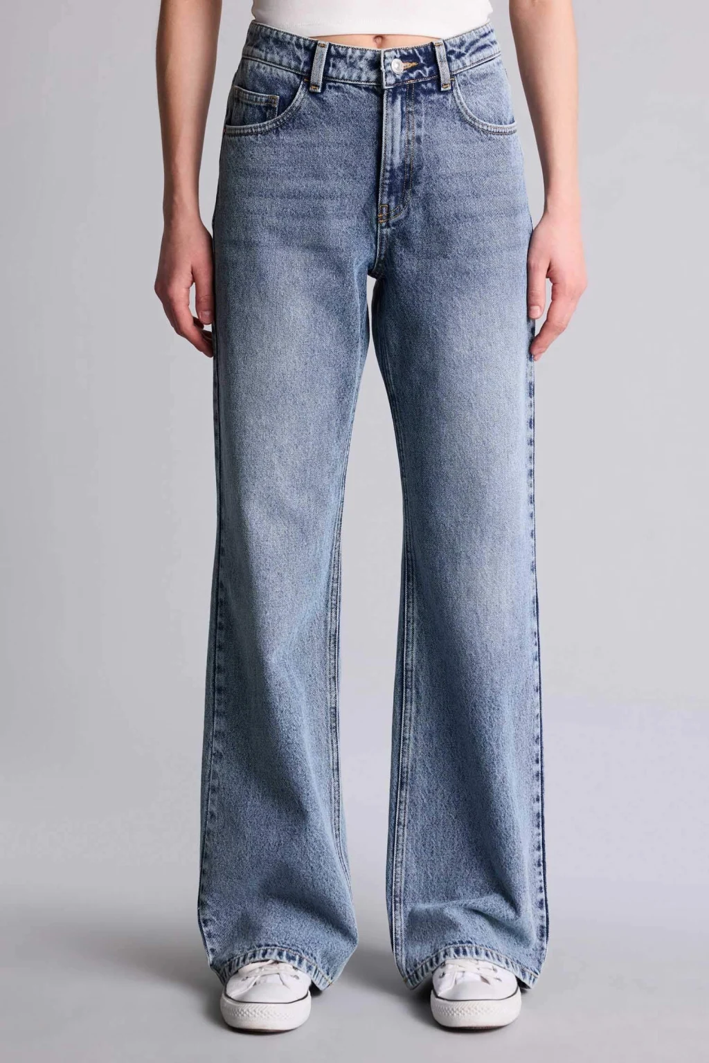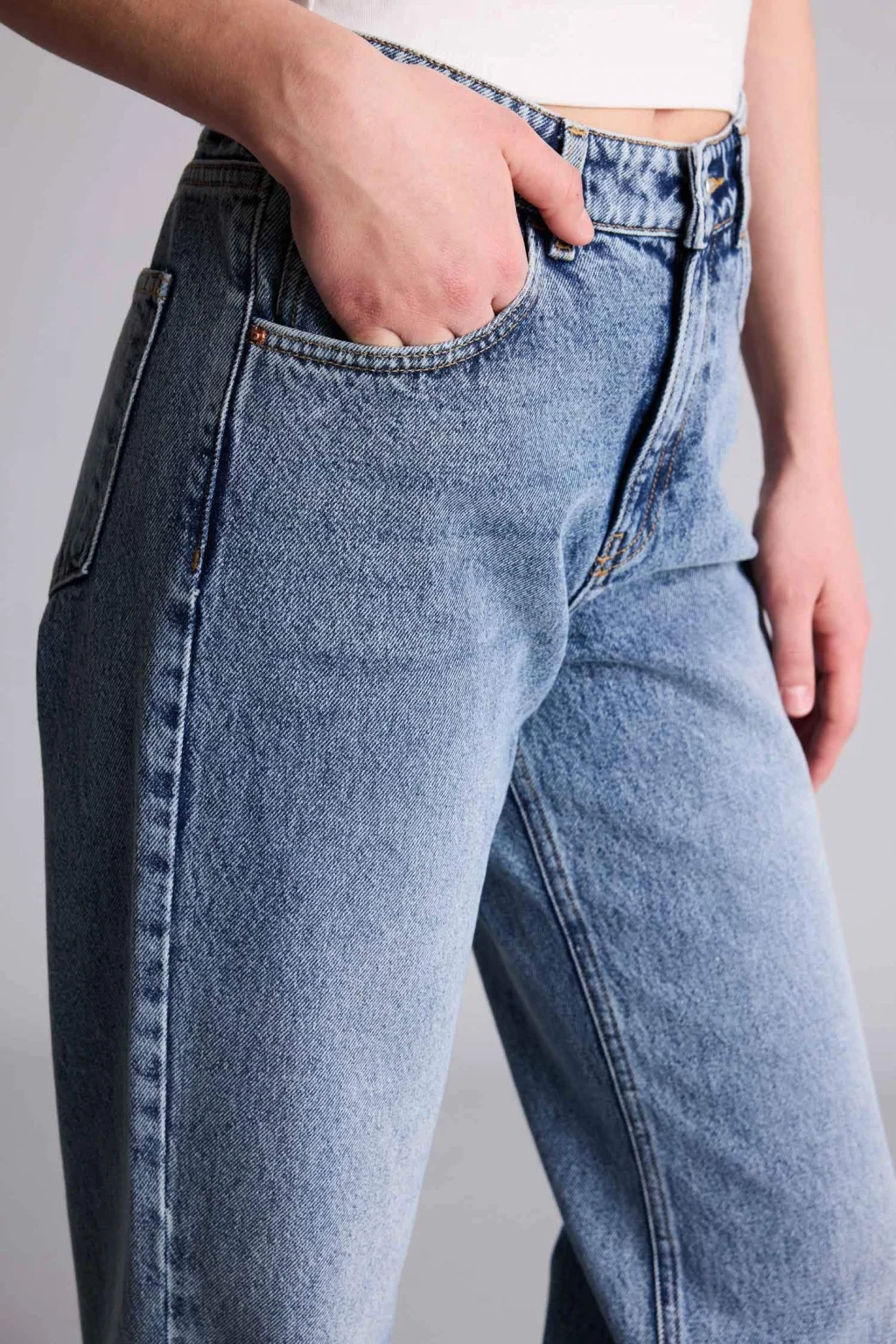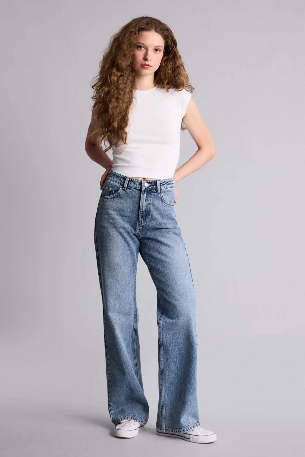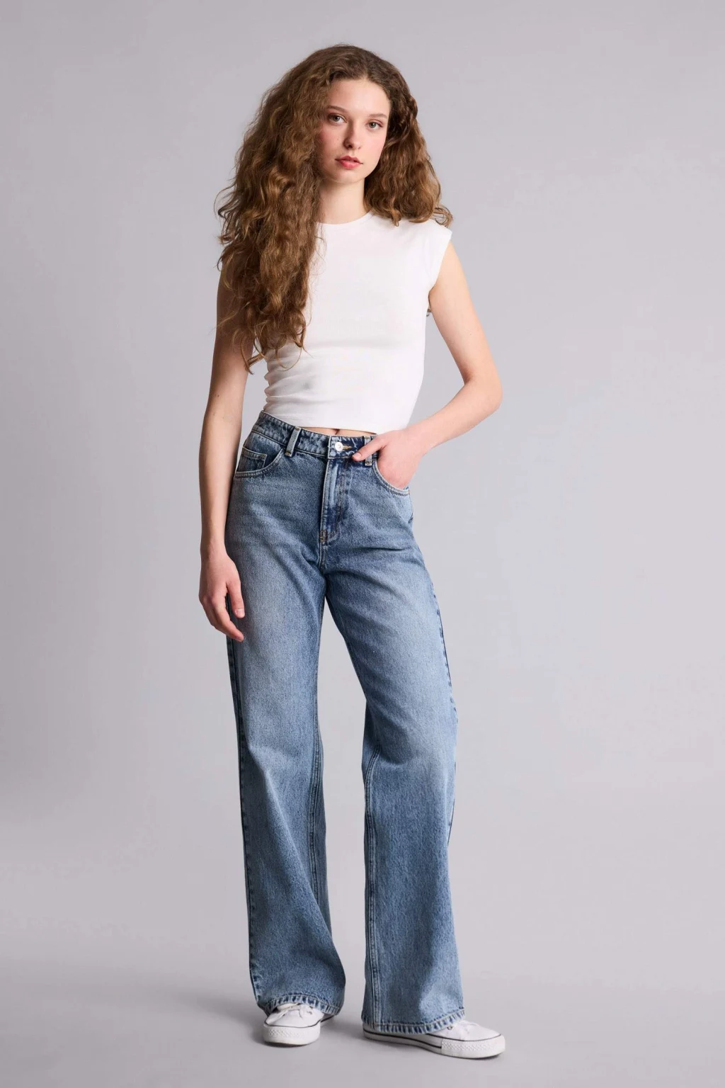 Straight wide yüksek bel jean pantolon, modern geniş paça kesimi ve yüksek bel tasarımıyla şık bir görünüm sunar. Rahat dokusu ve esnek yapısı, gün boyu konfor sağlar.