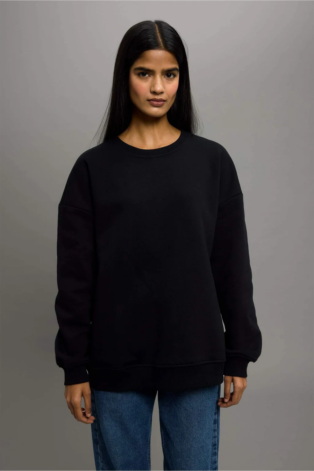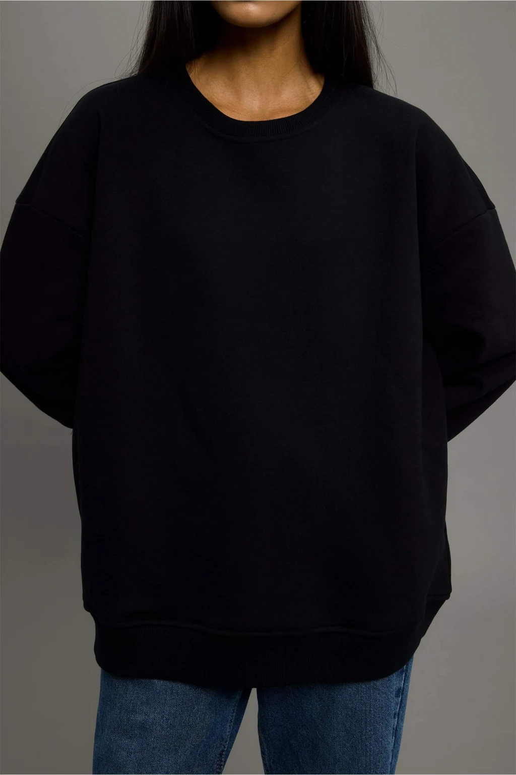 Oversize geniş kalıbıyla rahatlık sunan bu bisiklet yaka basic sweatshirt, kalın kumaşıyla soğuk günlerde sıcak tutar. Sade tasarımıyla her kombine kolayca uyum sağlar.