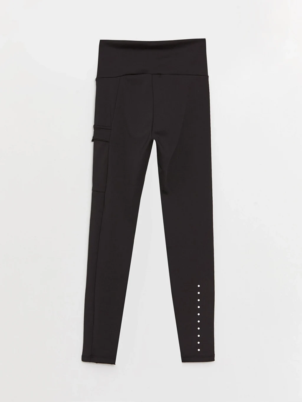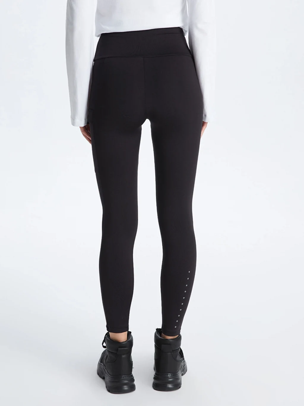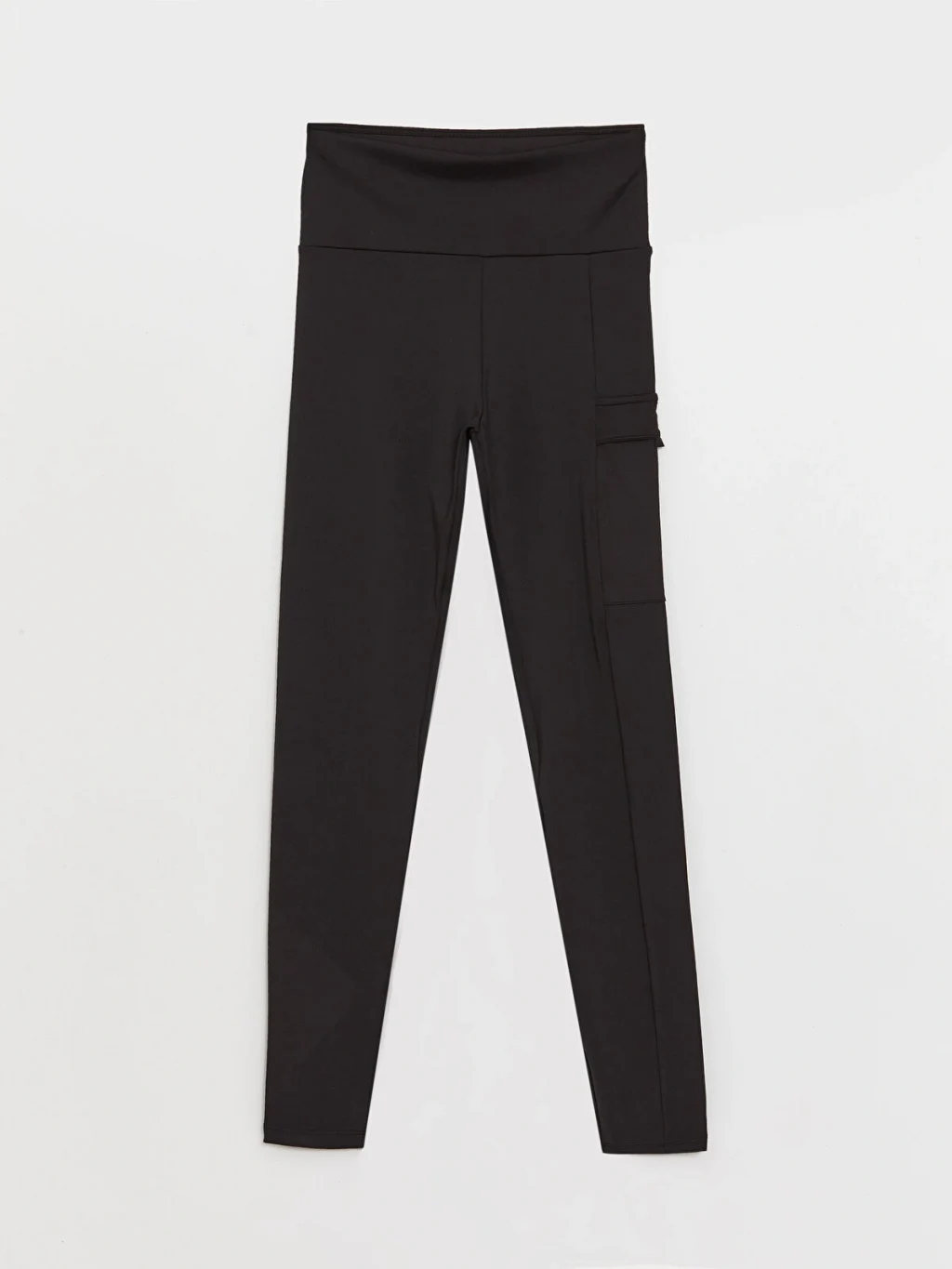 Yüksek belli kadın spor tayt, geniş elastik bel bandına ve bacakta kapaklı kargo cebe sahiptir.