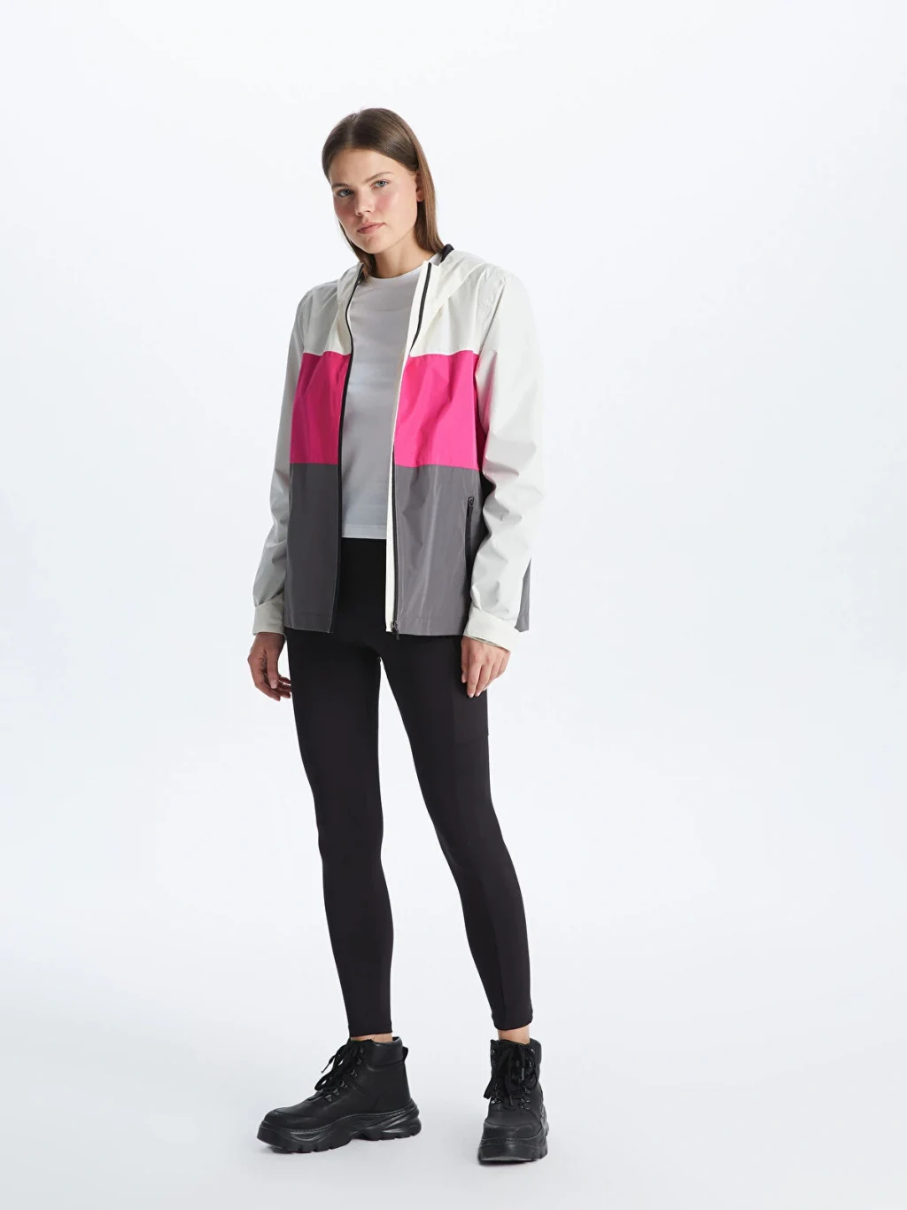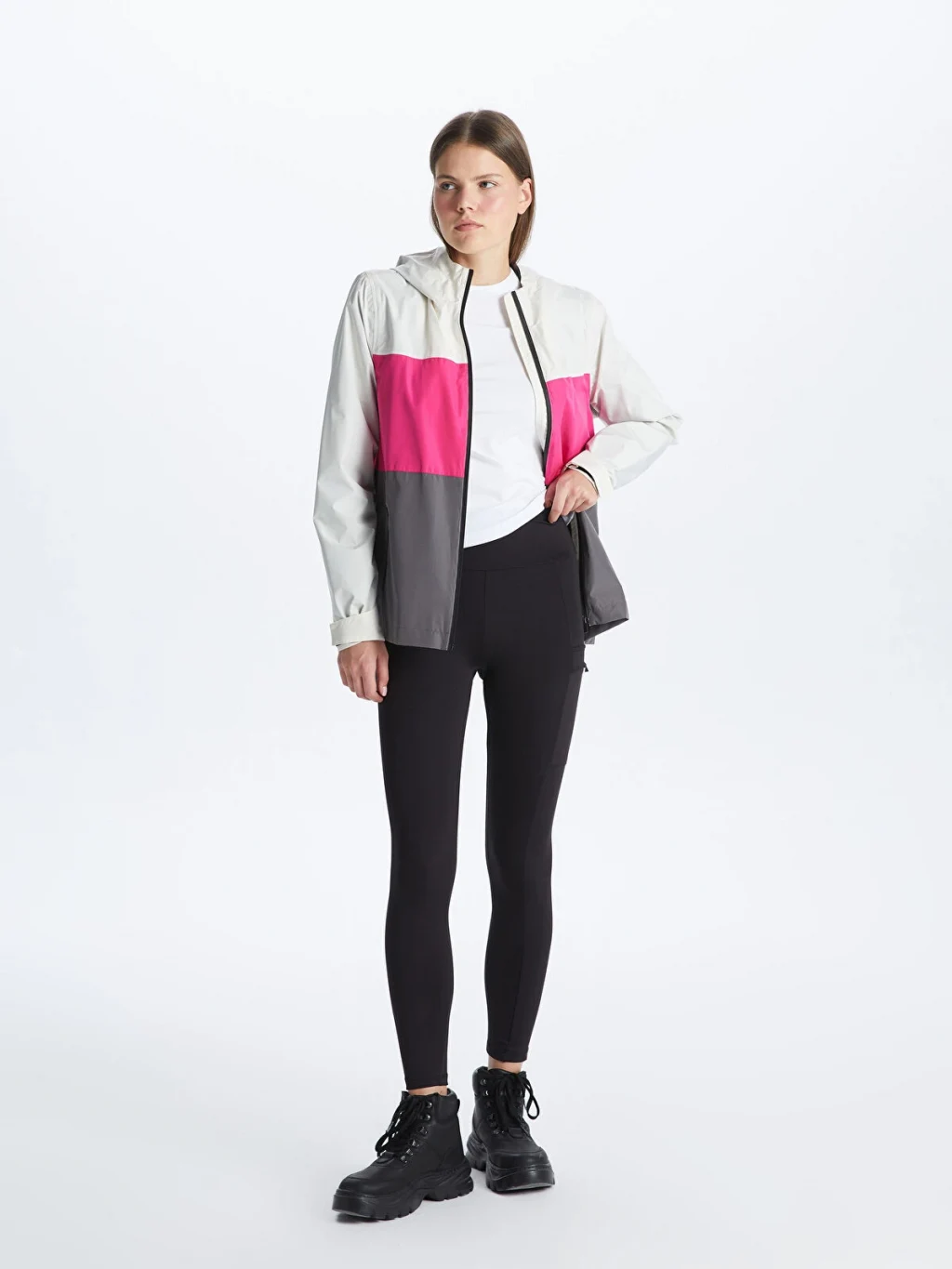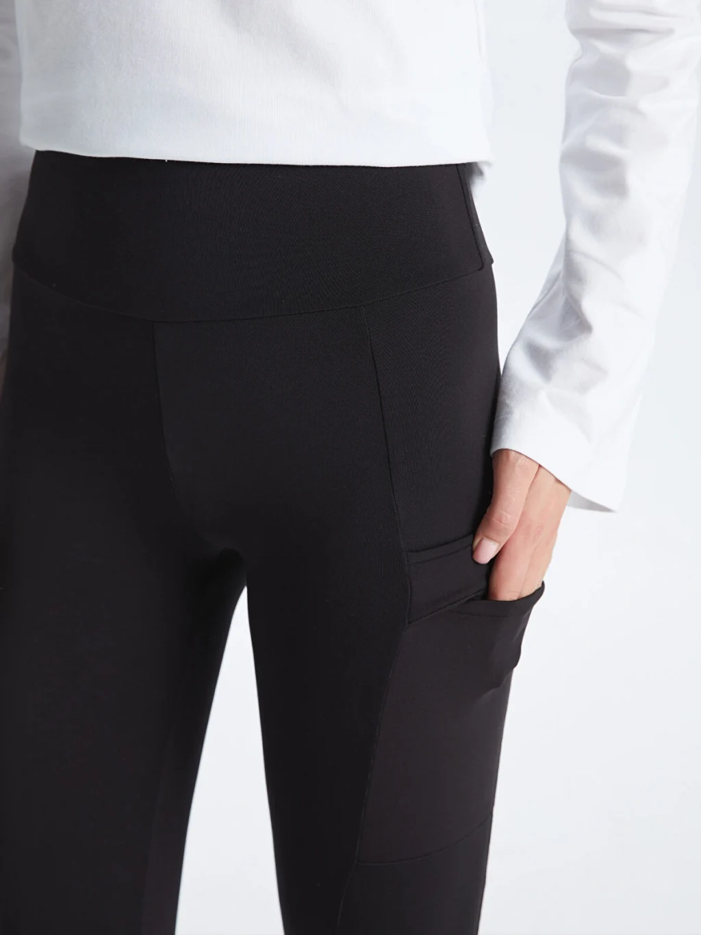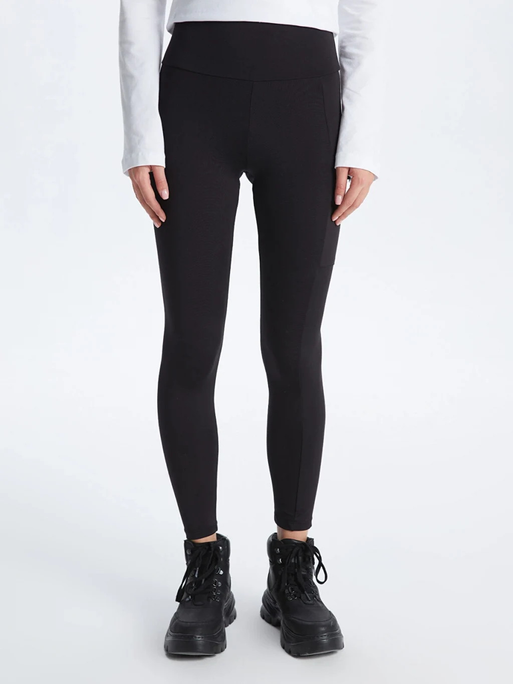 Yüksek belli kadın spor tayt, geniş elastik bel bandına ve bacakta kapaklı kargo cebe sahiptir.