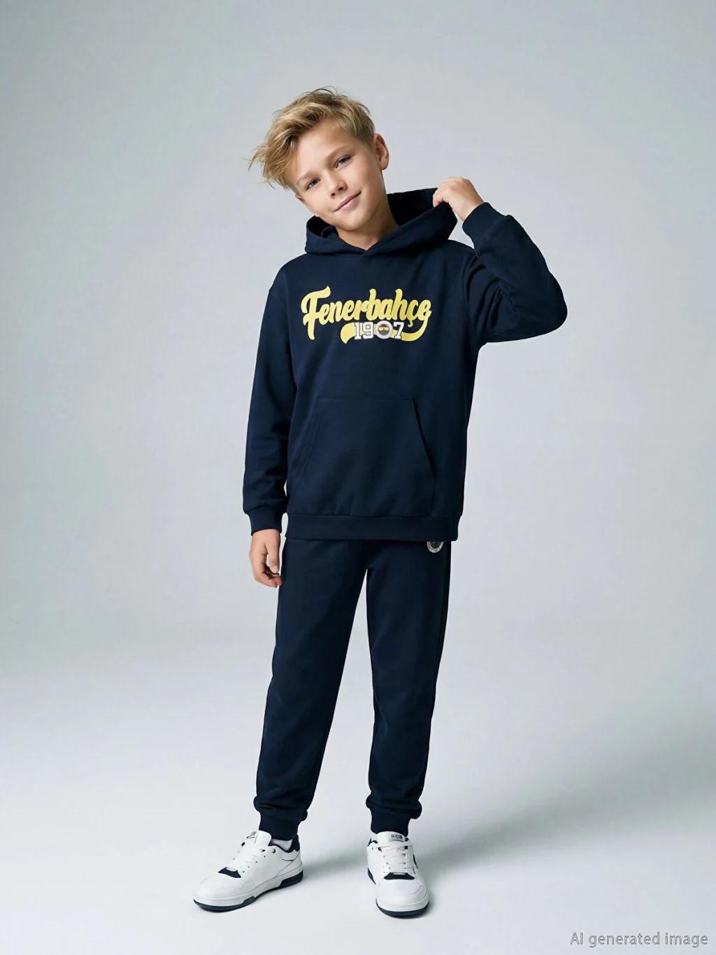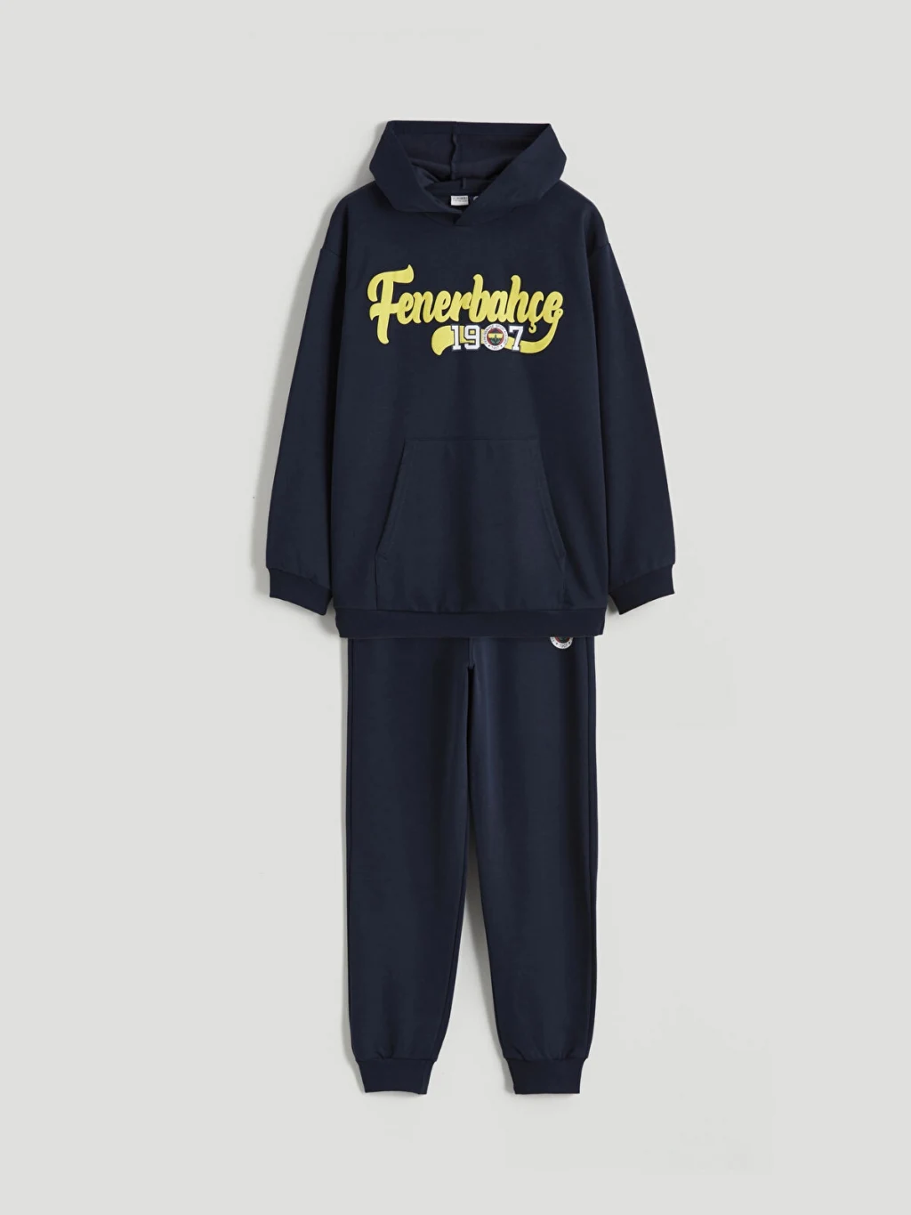 Fenerbahçe lisanslı erkek çocuk eşofman takımı, kapüşonlu, uzun kollu, kanguru cepli sweatshirt ve paçaları ribanalı eşofman altından oluşur.