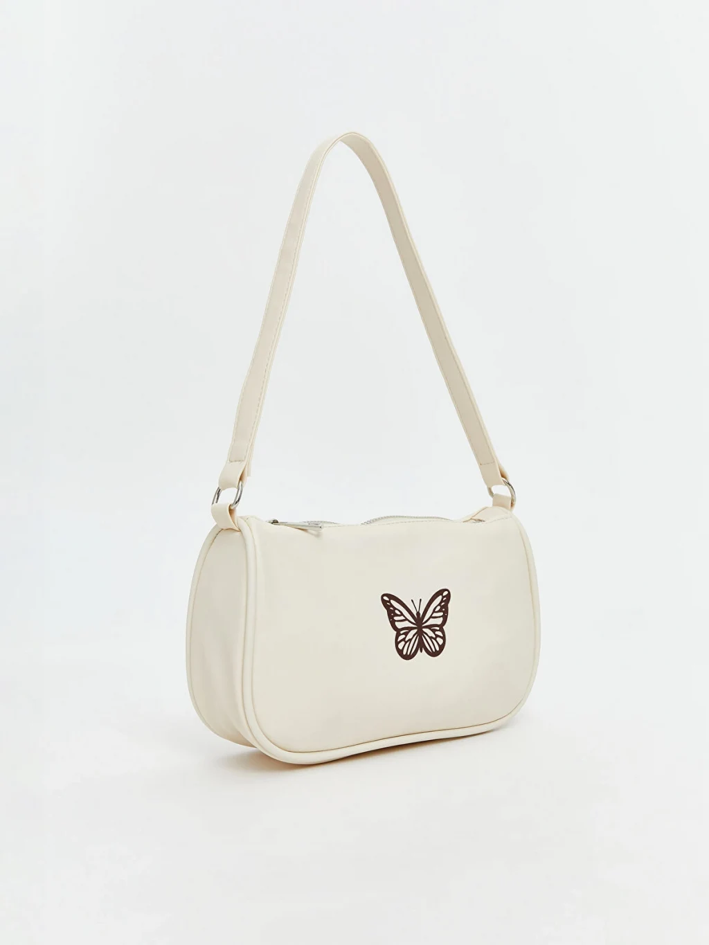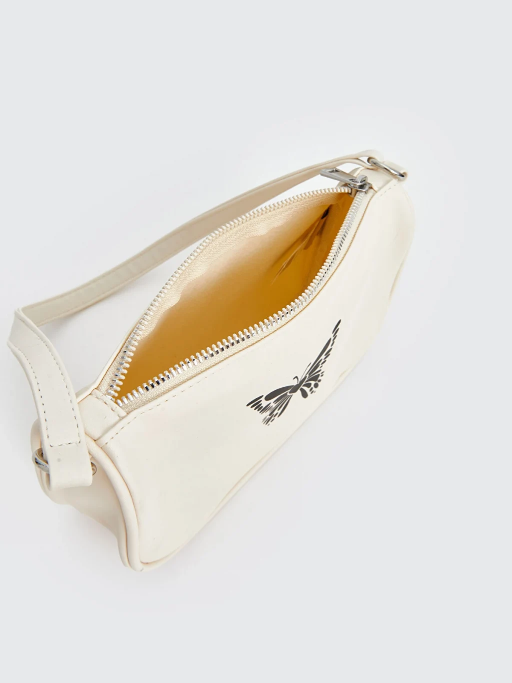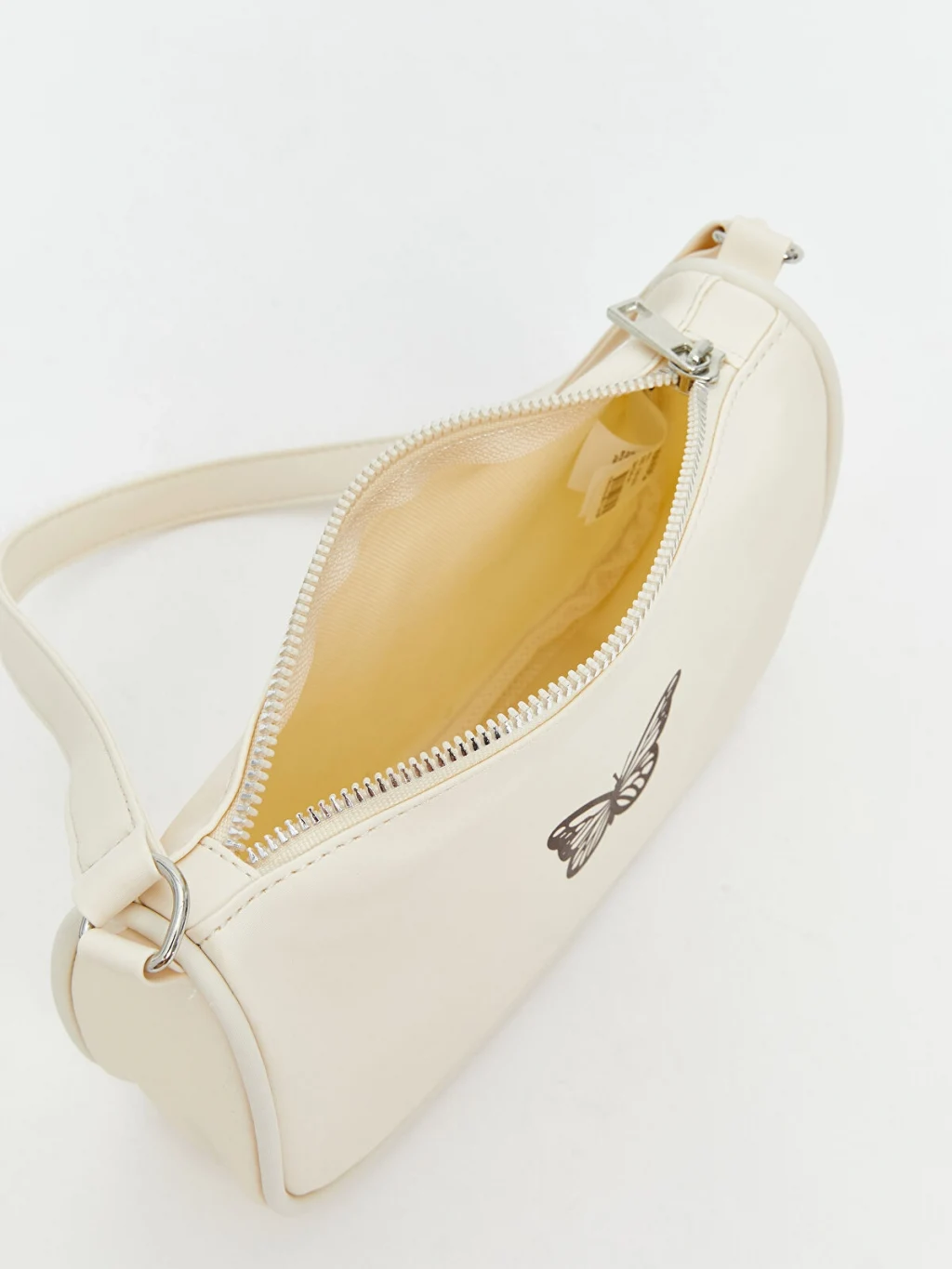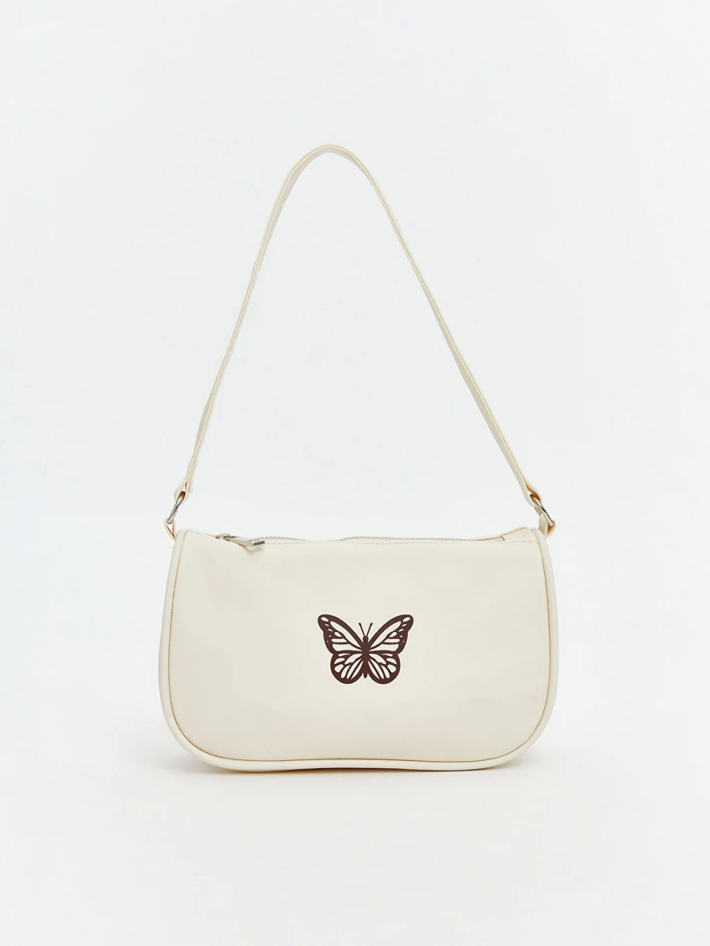 Fermuar kapamalı kız çocuk kol çantası, sabit kol askılıdır ve ön yüzünde kelebek baskısı mevcutttur.