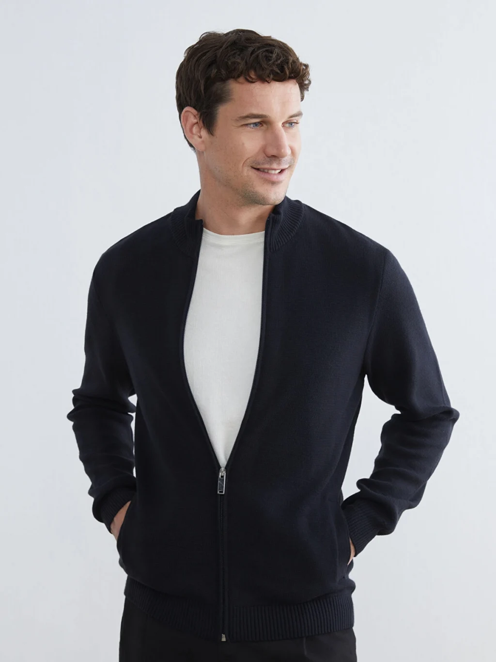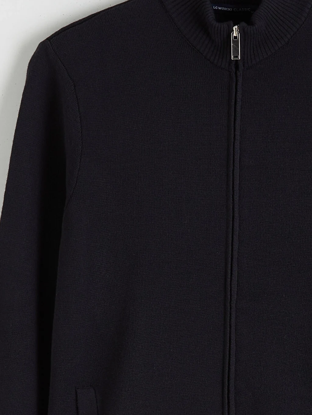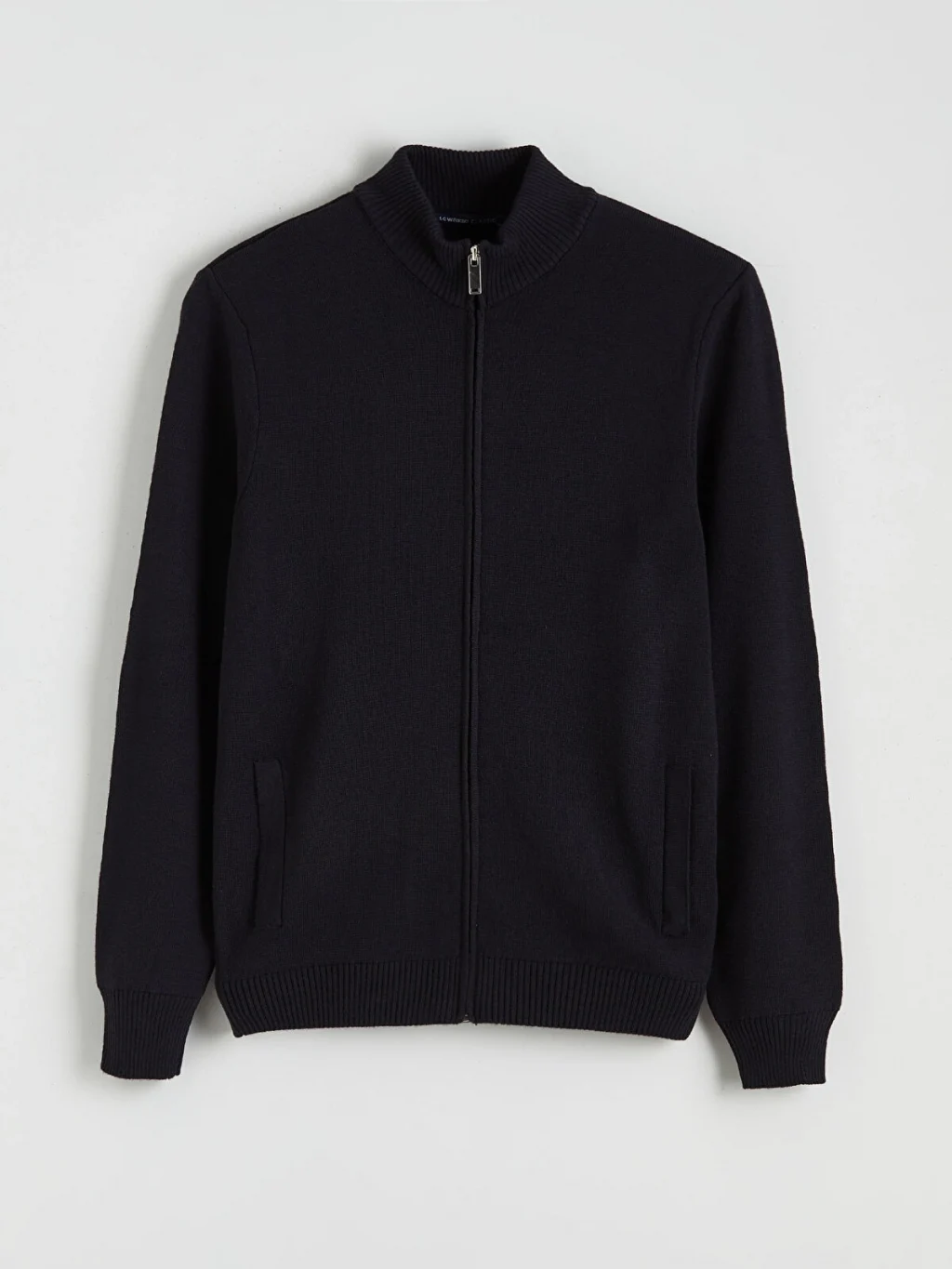 Dik yakalı, uzun kollu erkek hırka, ince triko kumaştan üretilmiştir. Önden fermuar kapamalıdır ve yan cepleri bulunur.
