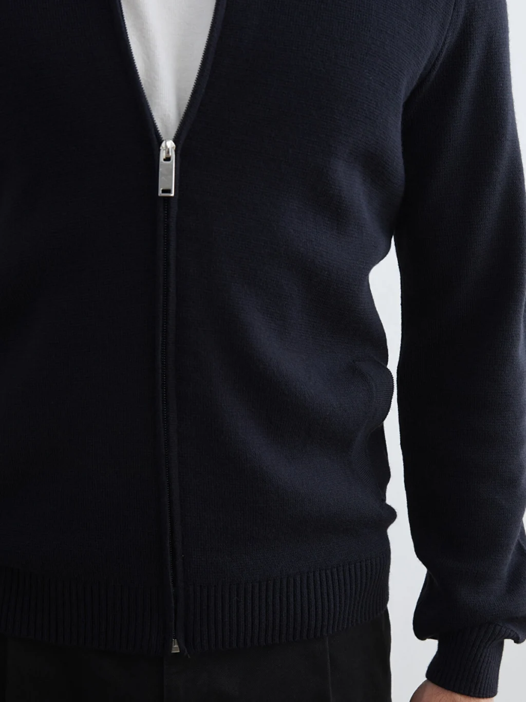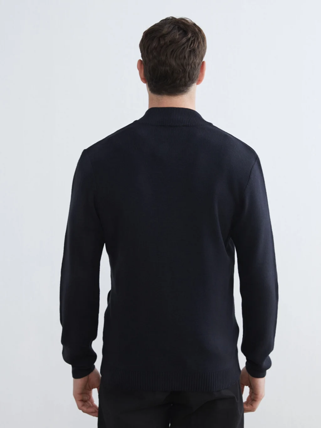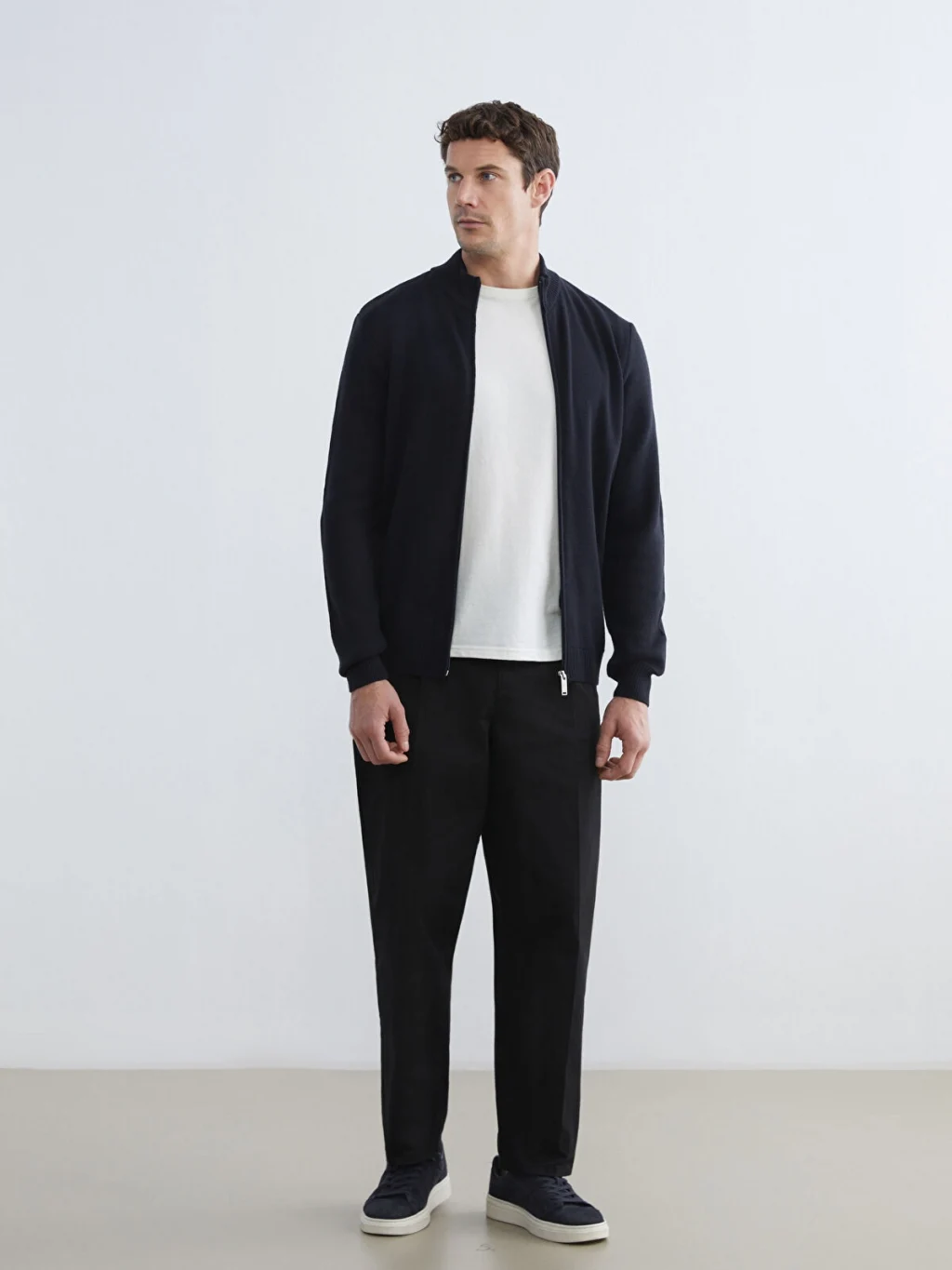 Dik yakalı, uzun kollu erkek hırka, ince triko kumaştan üretilmiştir. Önden fermuar kapamalıdır ve yan cepleri bulunur.