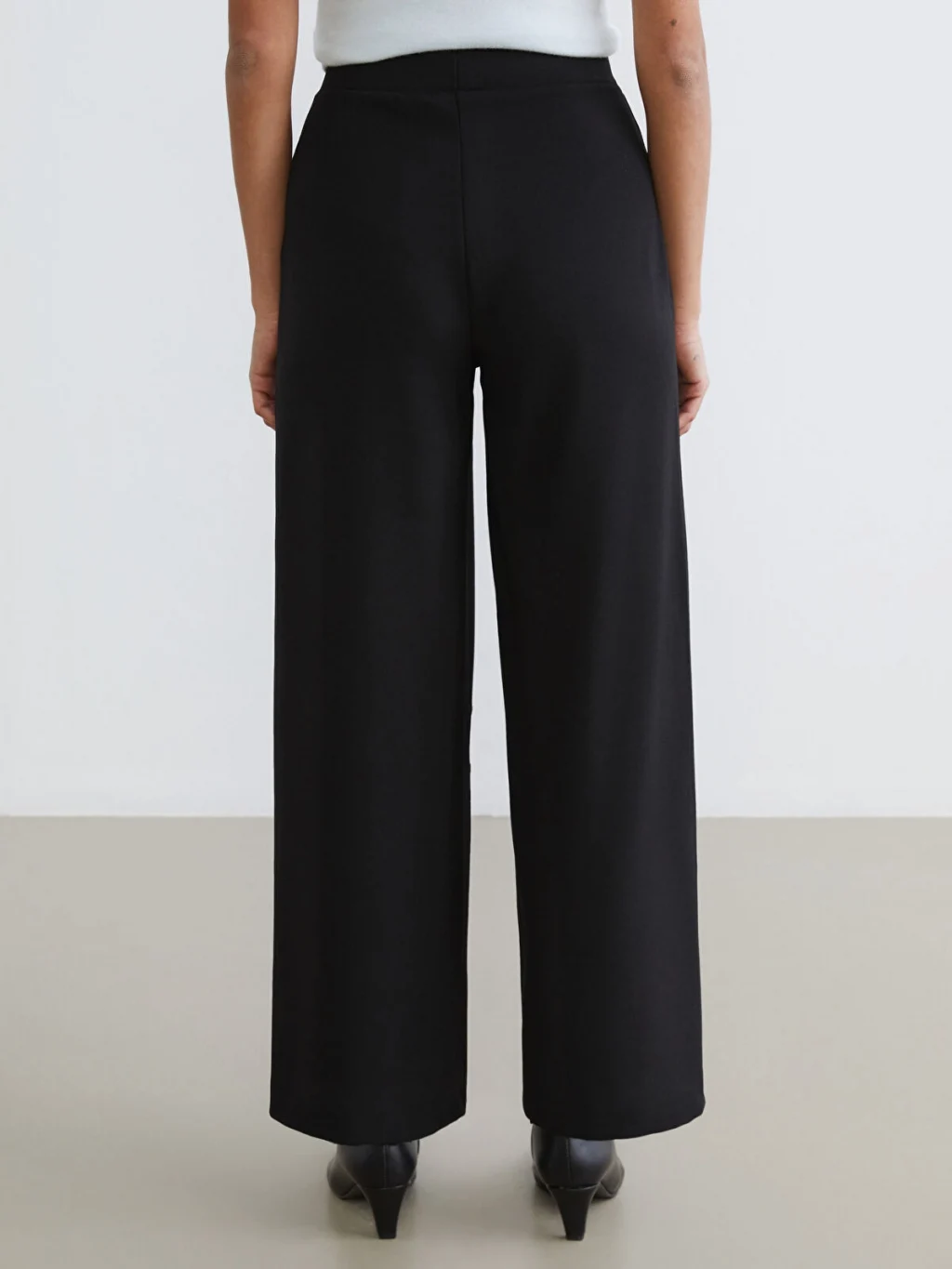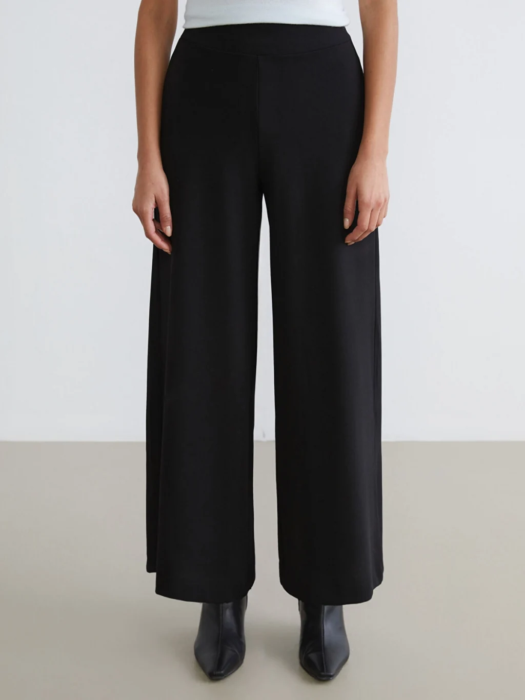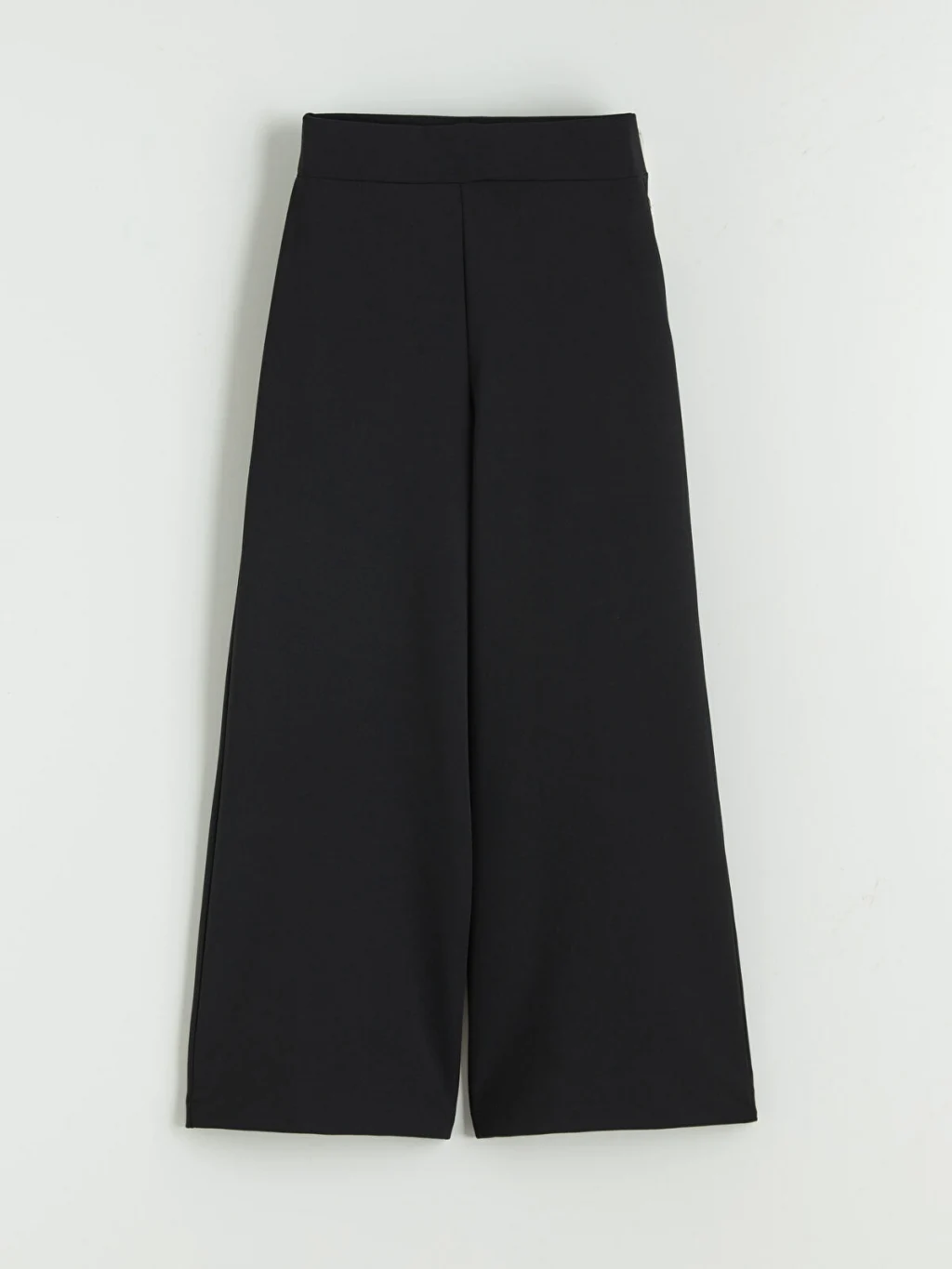 Kadın pantolon, bol kesime ve geniş paçaya sahiptir. Beli lastikli olan ürün, düz ve cepsiz bir tasarıma sahiptir.