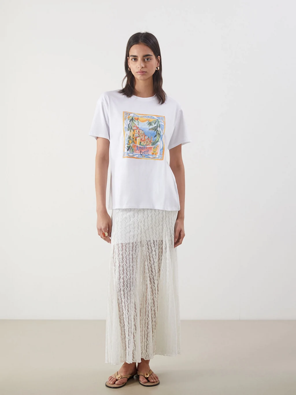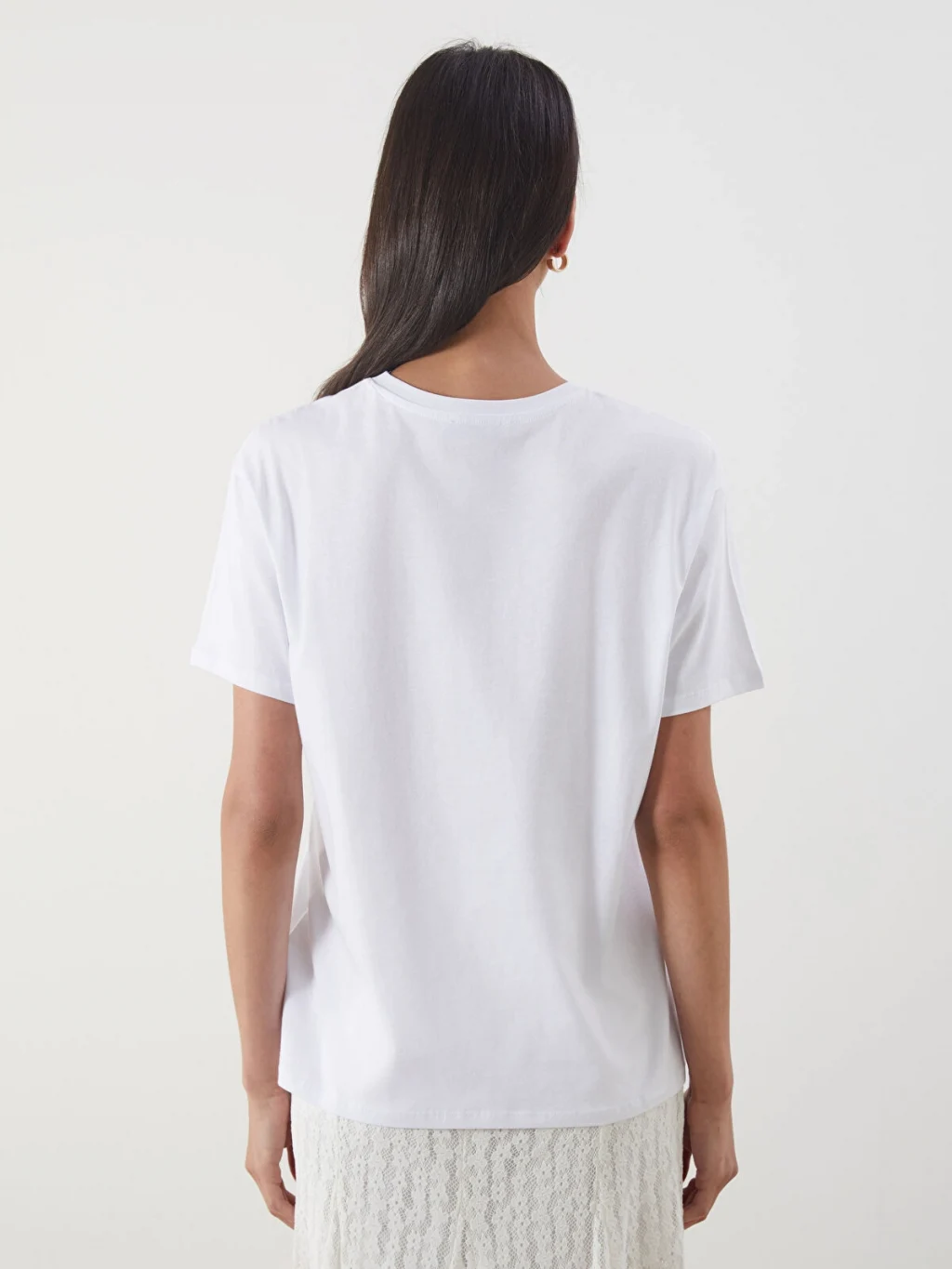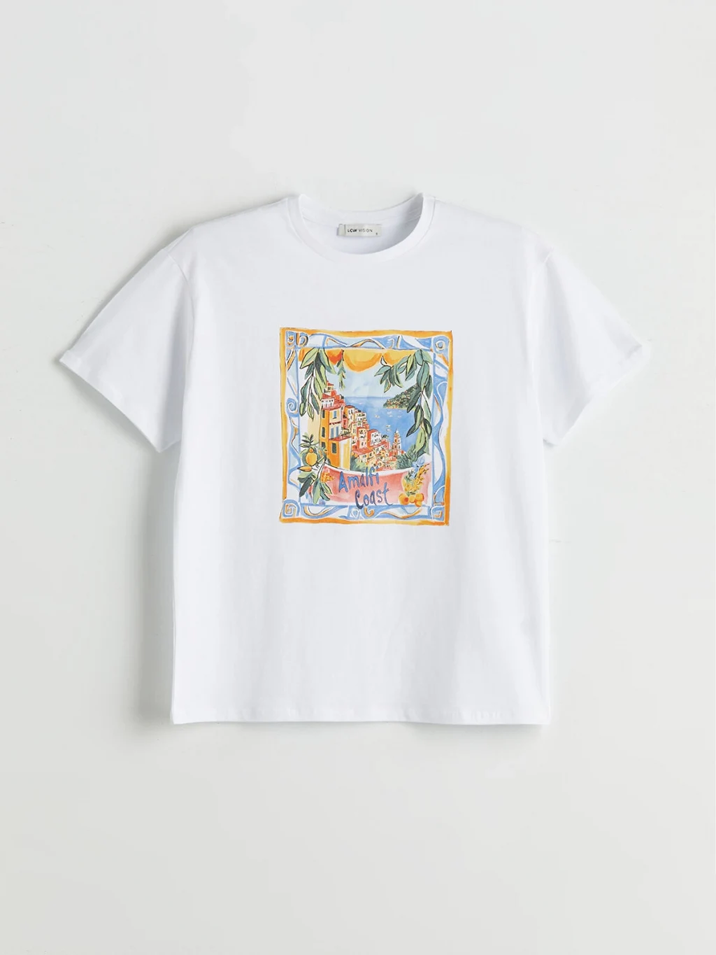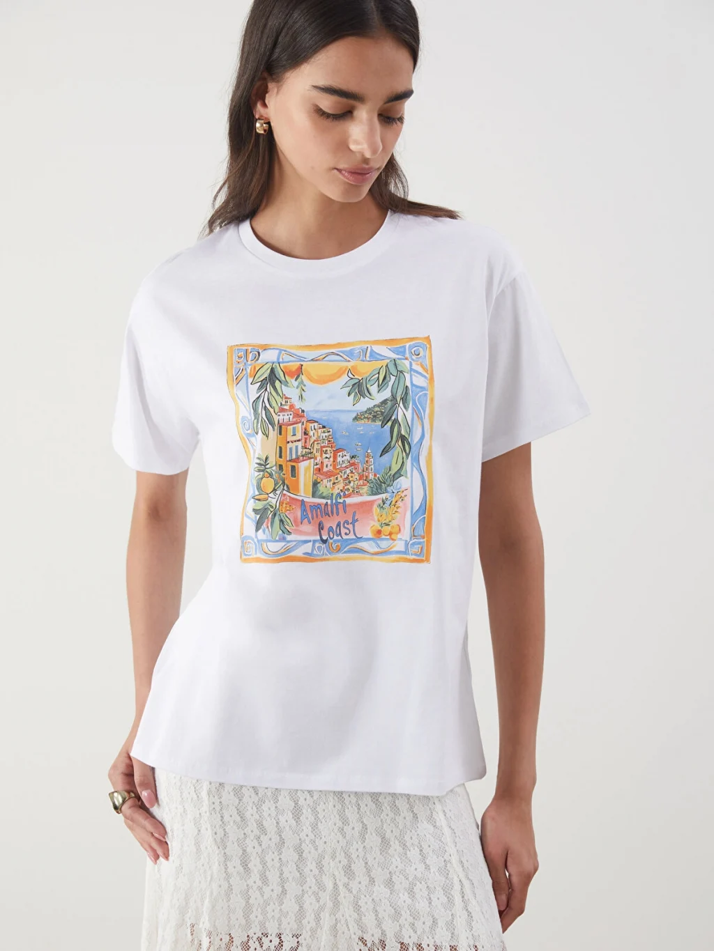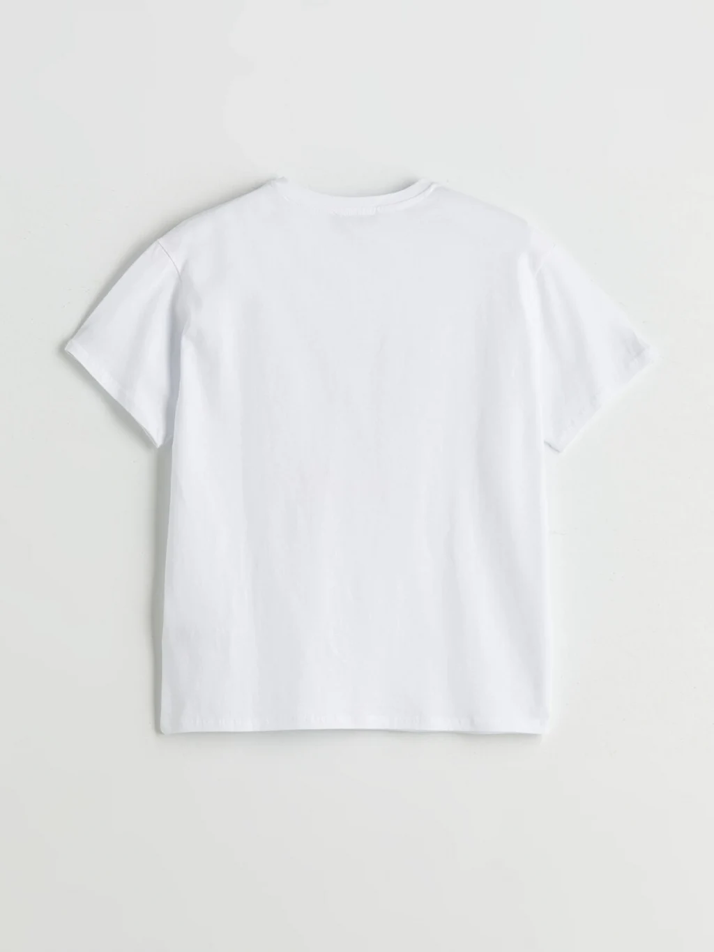 Bol kalıplı, bisiklet yaka ve kısa kollu kadın tişört, %100 pamuklu penye kumaştan üretilmiştir ve önü baskılıdır.
