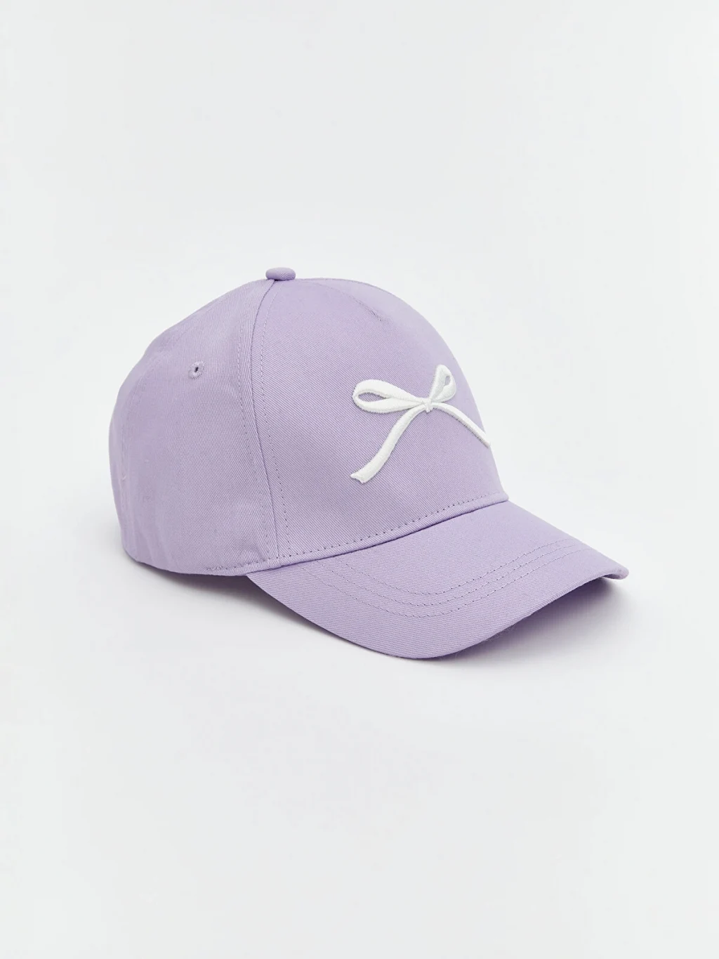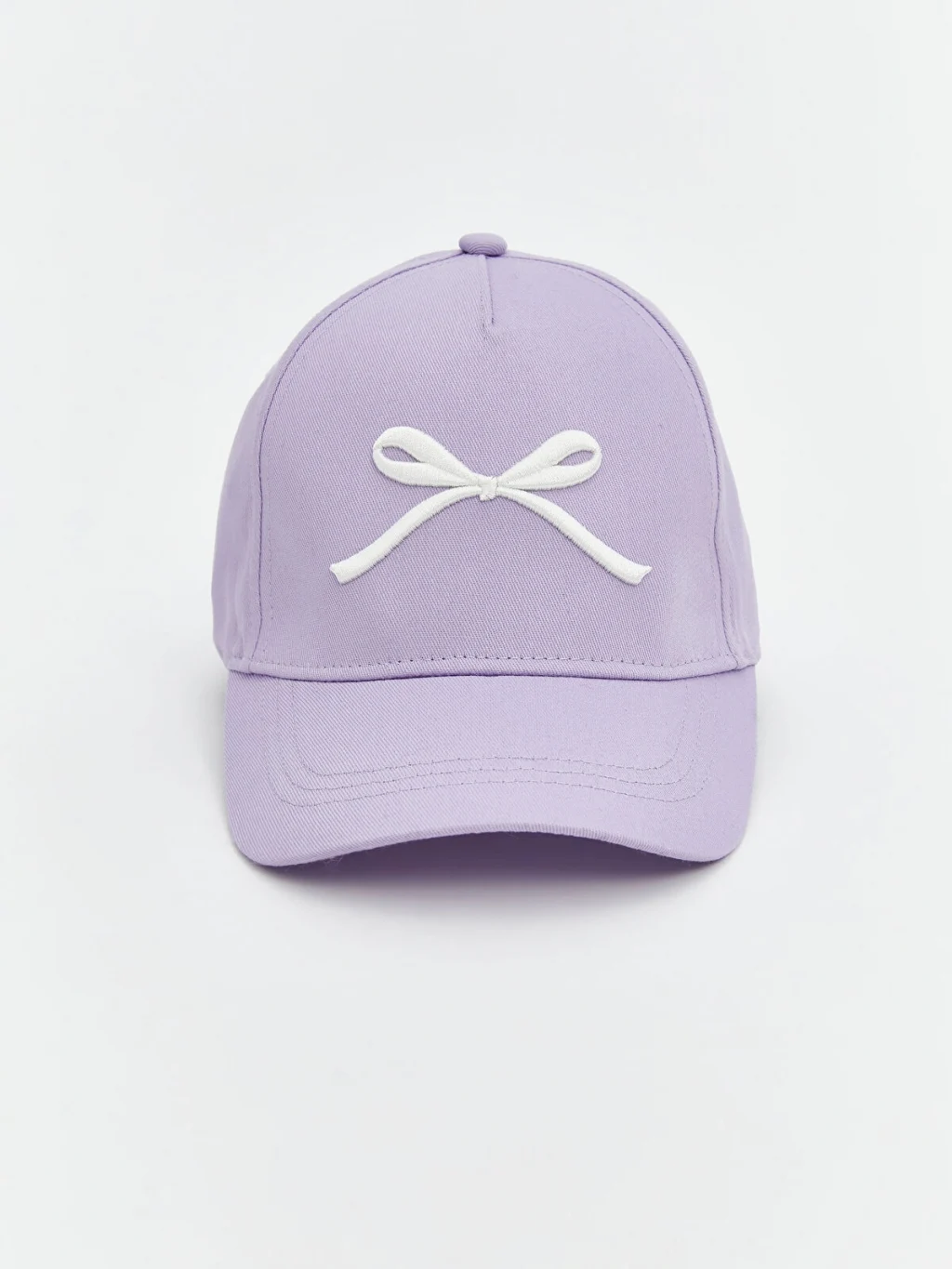 Önünde fiyonk işlemesi bulunan kız çocuk kep şapka, kavisli siperliğe ve arkadan ayarlanabilir tasarıma sahiptir.