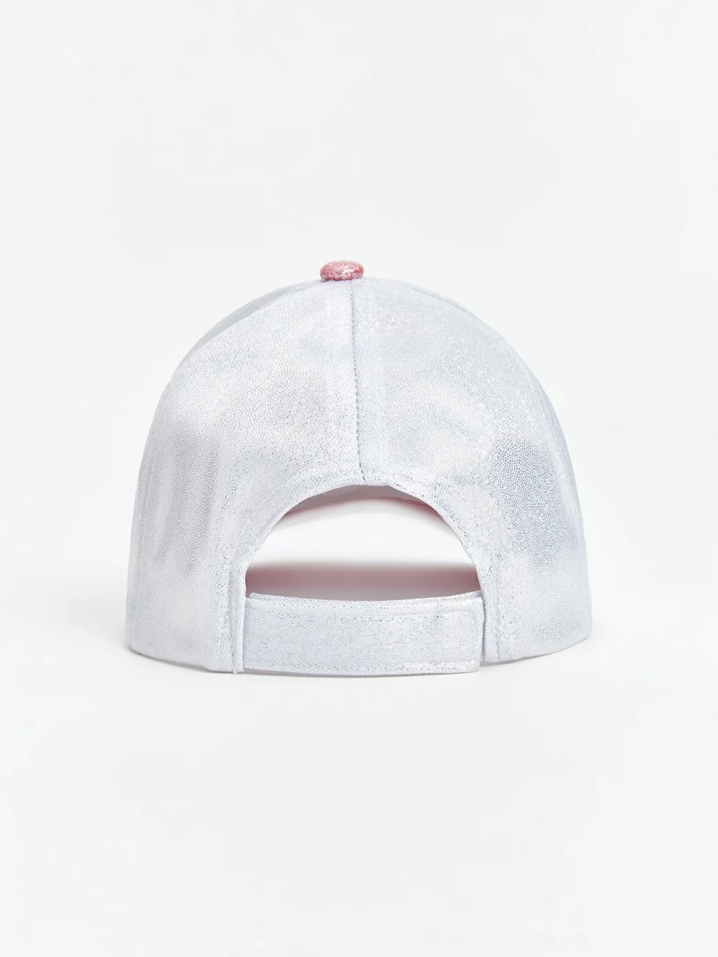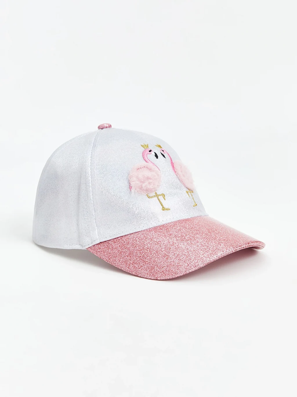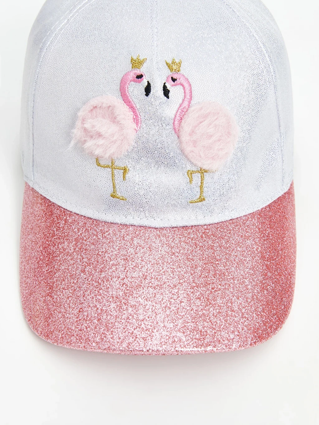 Simli kumaştan üretilen kız çocuk kep şapka, simli siperliğe ve önünde ponpon detaylı flamingo işlemesine sahiptir.