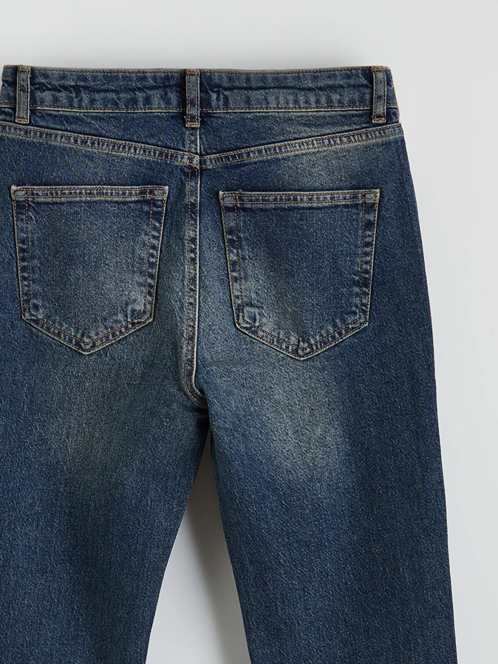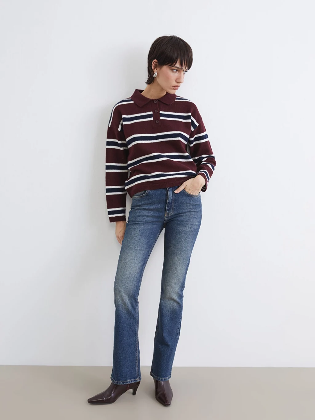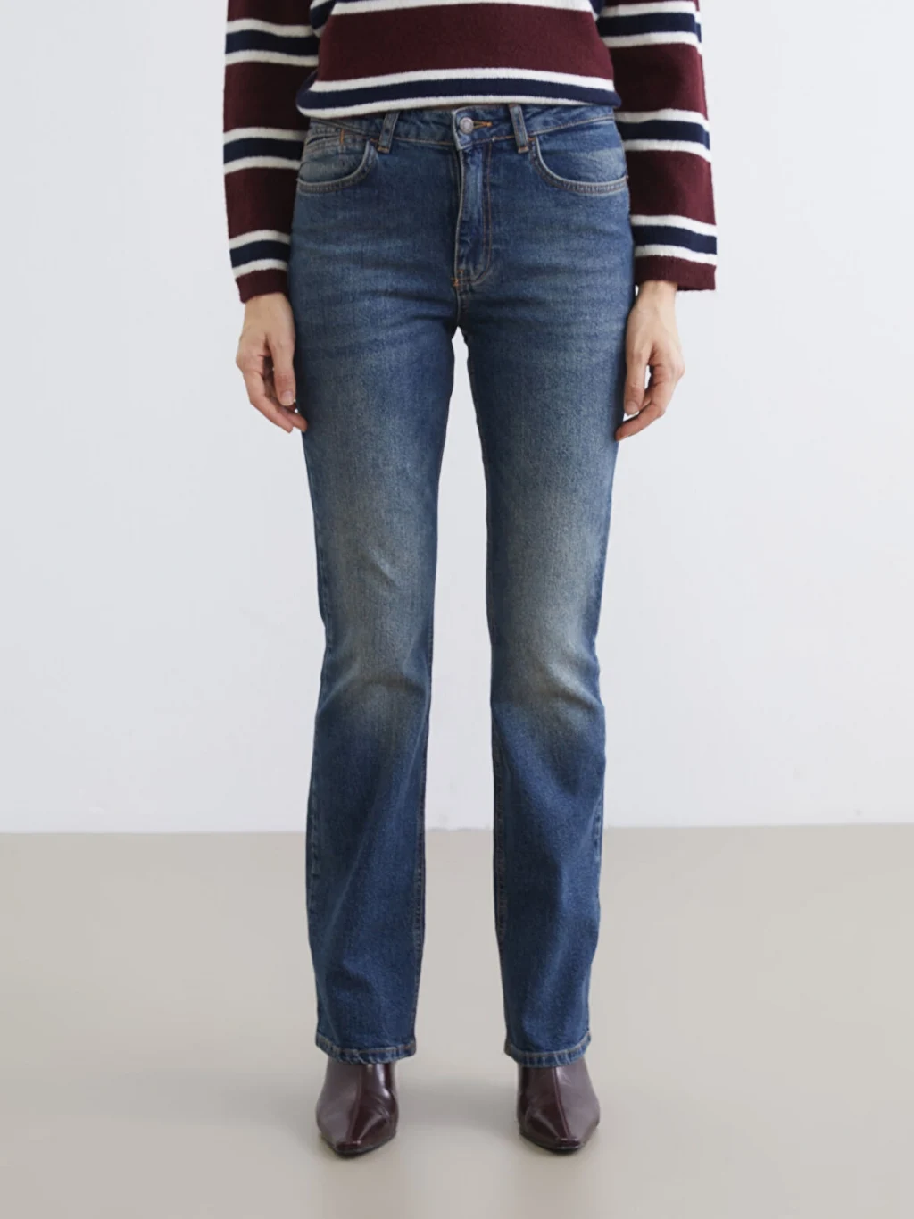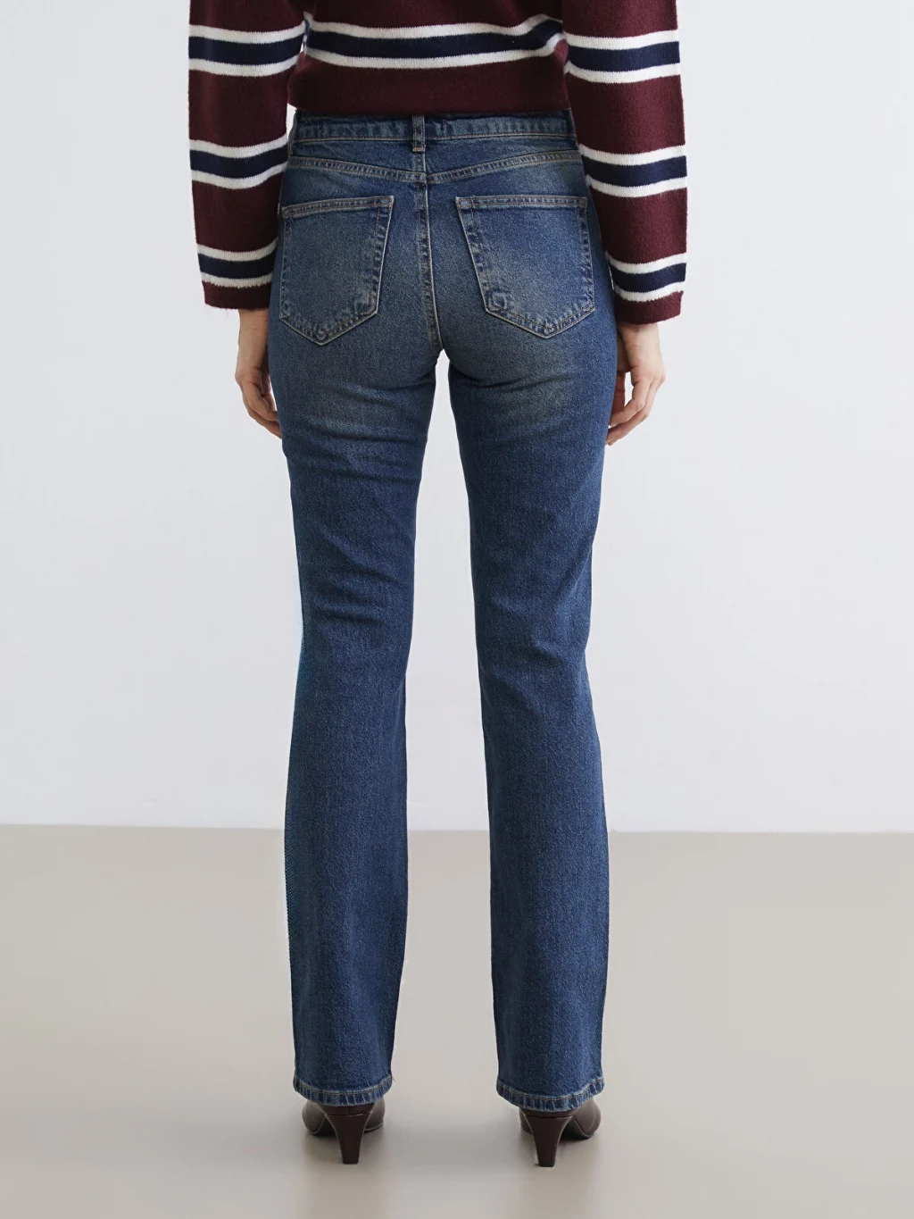 Yüksek bel, ispanyol paça kadın jean pantolon, pamuklu denim kumaştan üretilmiştir. Beş cepli tasarıma sahip olup fermuar ve düğme kapamalıdır.