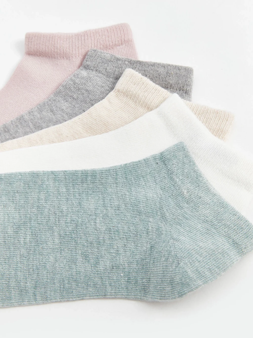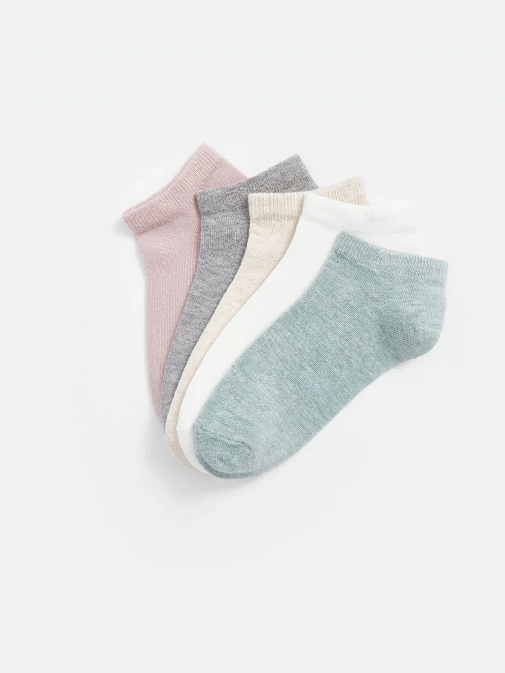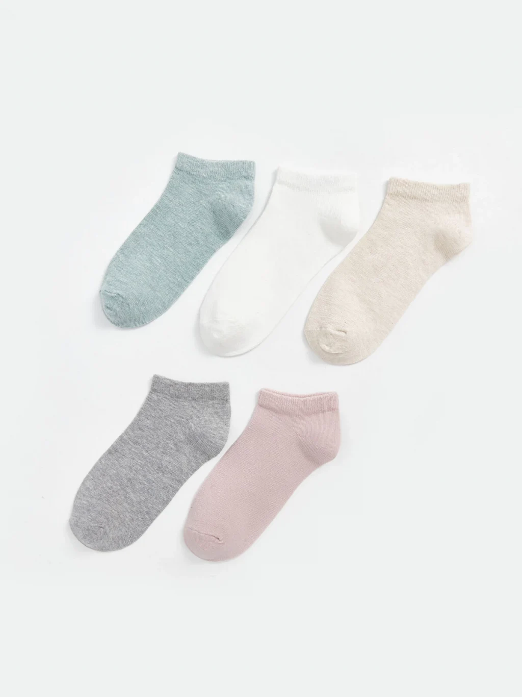 Pamuk karışımlı elyaftan üretilen patik çoraplar, yumuşak ve konforlu bir dokuya sahiptir. Düz, sade tasarımıyla doğal bir görünüm sunar ve 5 çift patik çoraptan oluşmaktadır.
